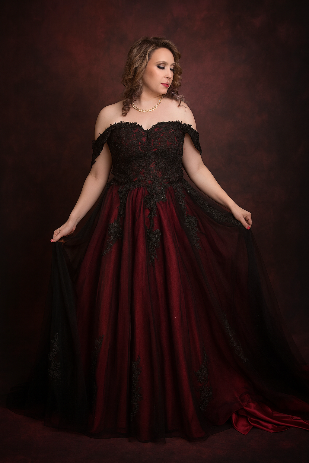 Keywords: gothic wedding dress, black and red ball gown, lace off shoulder dress, dramatic wedding gown, alternative bridal dress, Adela Designs gown, unique gothic bridal gown