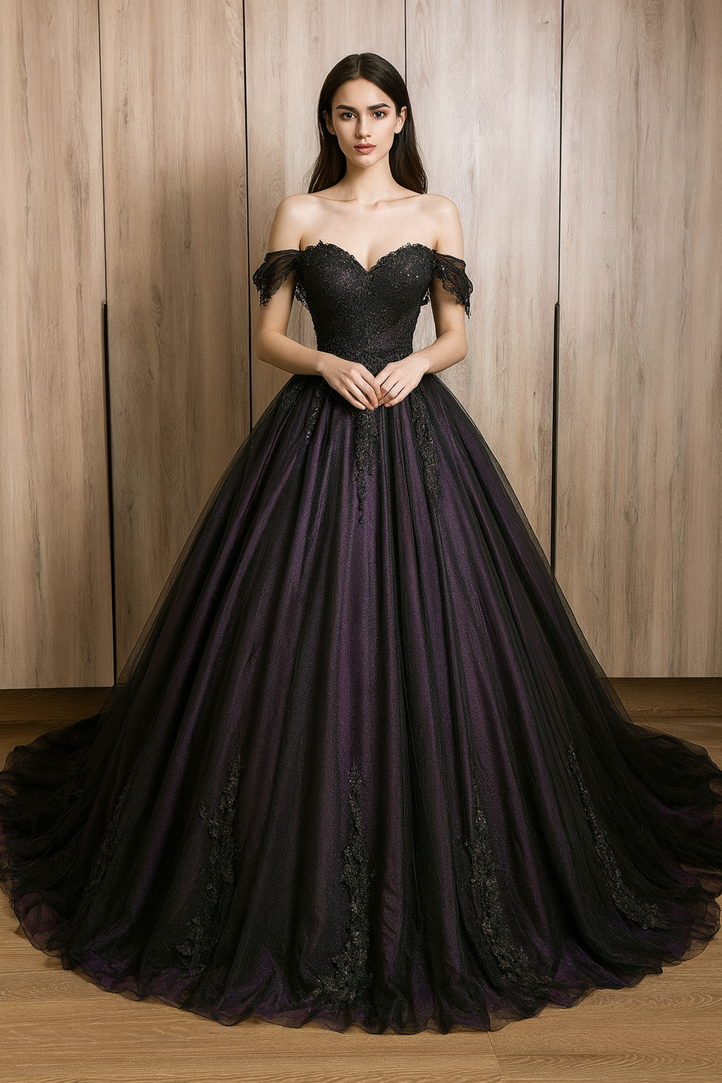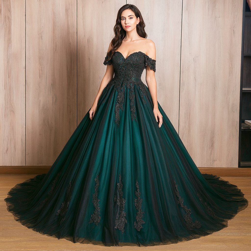Step into a dark fairytale with the “Lysandra” wedding gown by Adela Designs, a breathtaking ball gown that combines gothic allure with luxurious elegance. Available in deep emerald green, regal purple, or rich crimson red, this dramatic dress features an off-the-shoulder sweetheart neckline adorned with intricate black lace appliqués. Layers of soft tulle cascade into a voluminous skirt, embellished with ornate black embroidery for a striking finish. Perfect for gothic weddings, masquerade balls, or brides seeking a bold alternative to traditional bridal looks, Lysandra ensures you’ll captivate every eye.