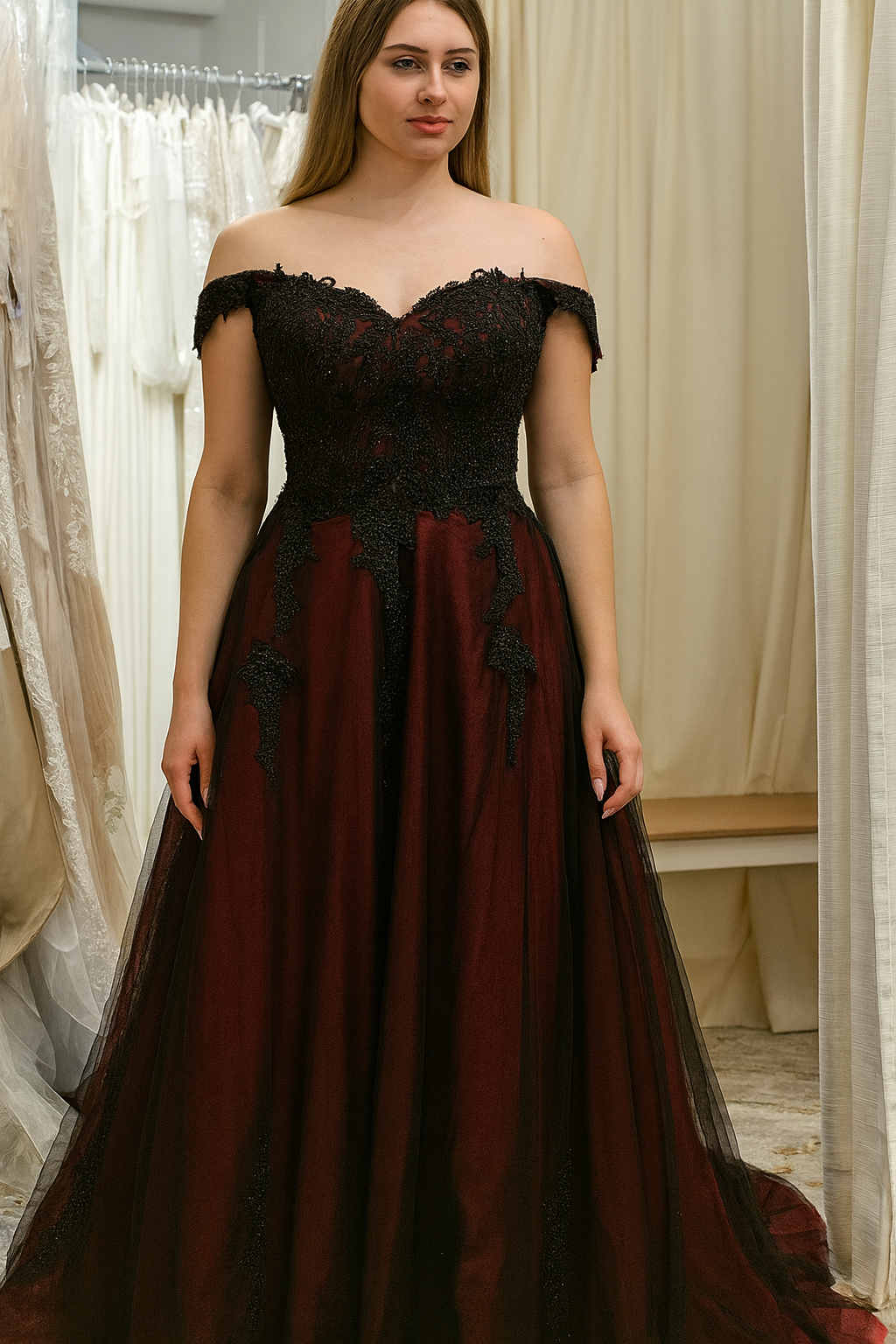 Lysandra – Black and Red Gothic Wedding Dress with Lace Appliqués
