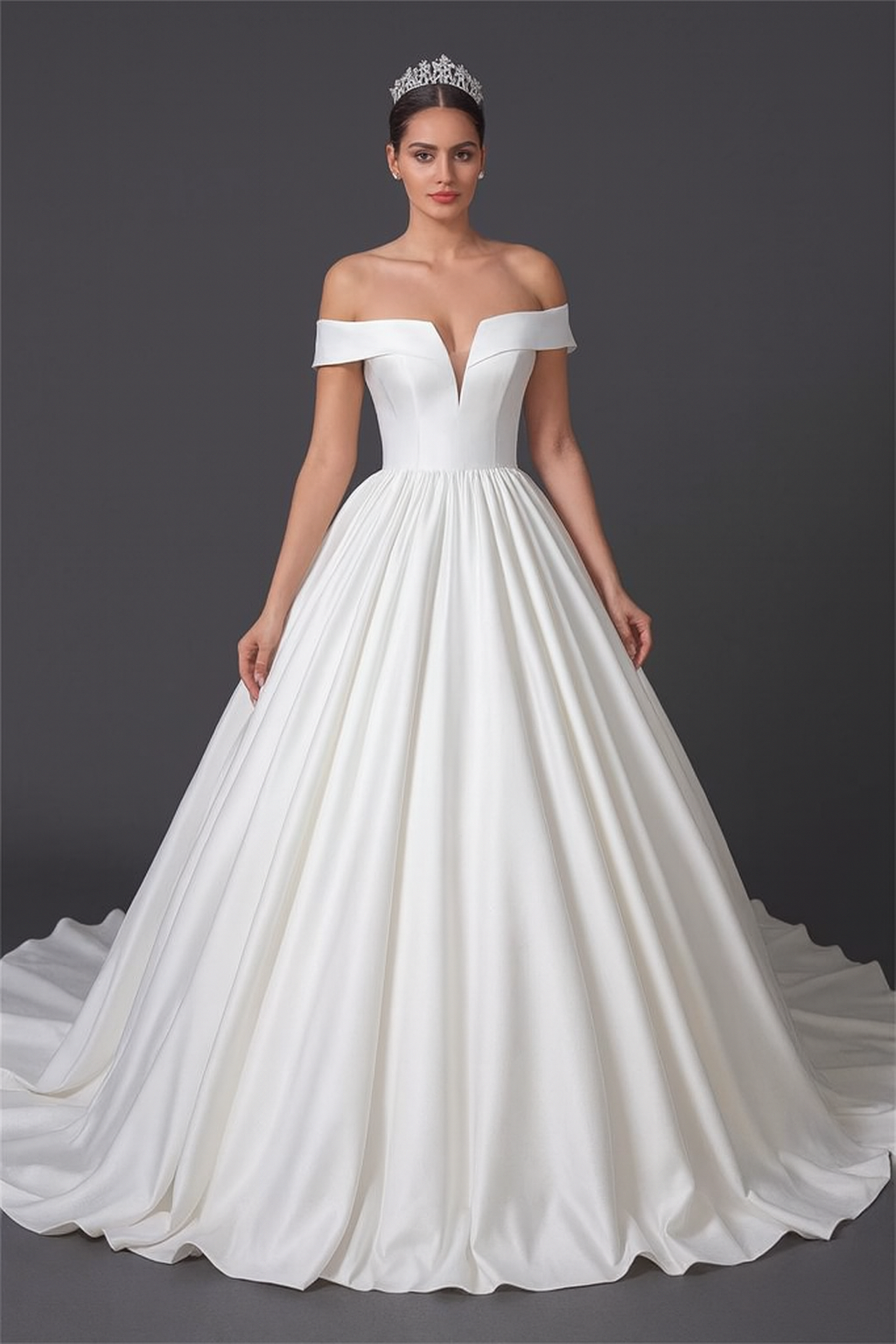 Meet Fanny, a timeless satin ball gown with a modern off-the-shoulder neckline and sculpted bodice. Luxurious, weighty satin drapes into a full, regal skirt and dramatic train, while the lace-up corset back cinches the waist for a flawless fit. Shown with a petticoat, sold separately for extra volume. Perfect for classic, black-tie, or cathedral ceremonies.