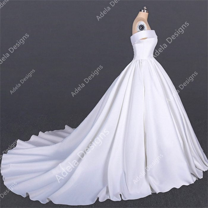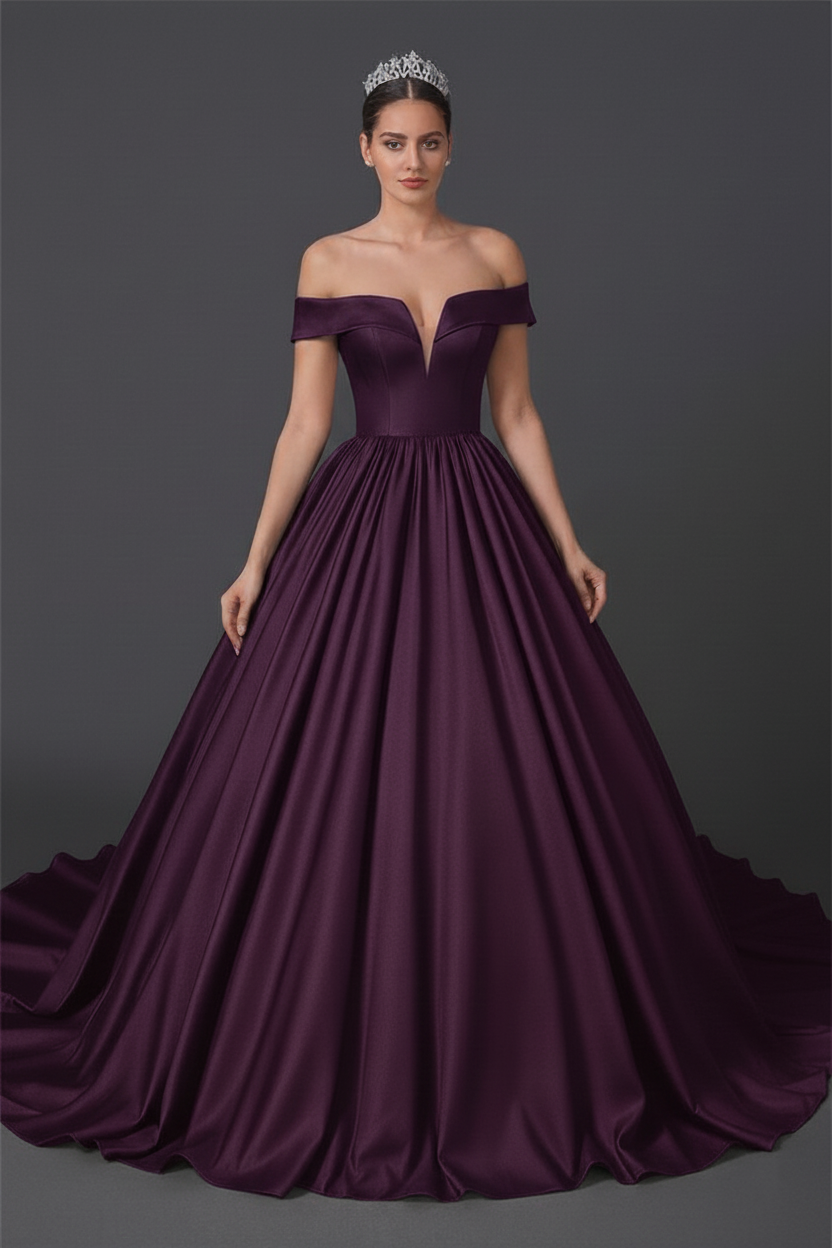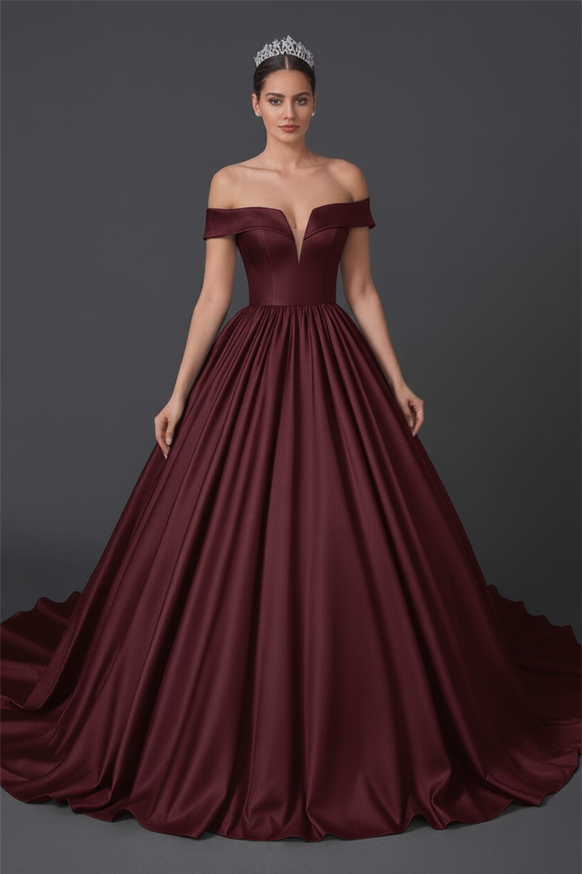 Details you’ll love: structured satin, off-shoulder fold-over neckline, supportive corset back, pockets-optional by request, fully lined. Custom length and sizing available.