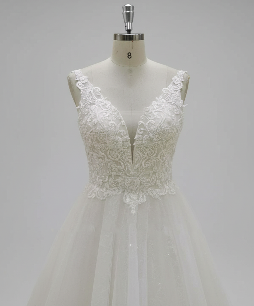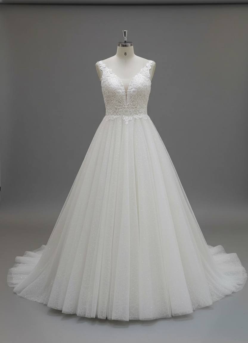 The bodice features wide sleeveless straps and an illusion plunging neckline, offering just the right balance of modern allure and classic refinement. Flowing from the natural waistline, layers of sparkling tulle cascade into a chapel-length train, ensuring an unforgettable walk down the aisle.