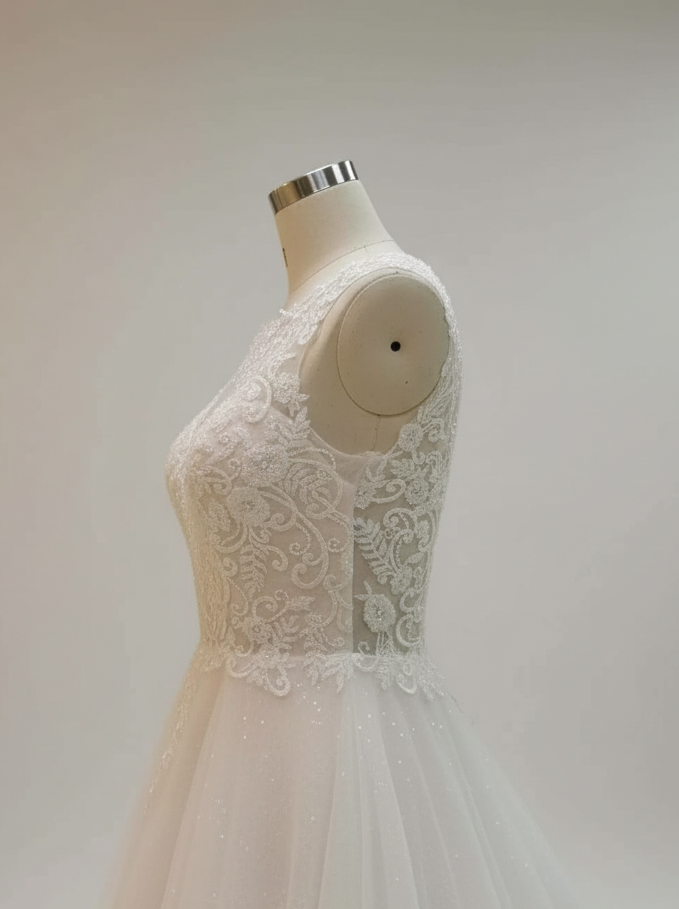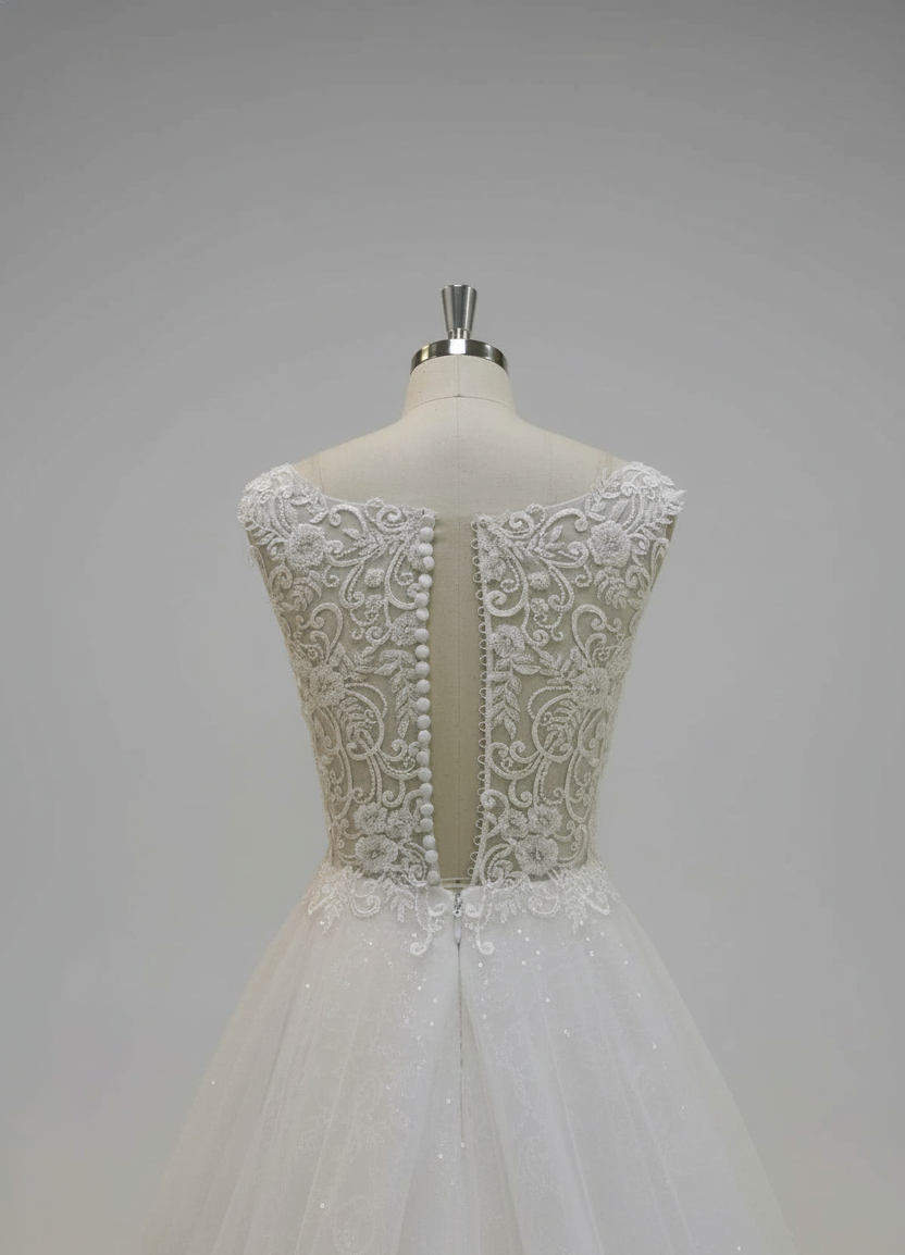 Grace, glamour, and timeless romance converge in the Alba gown. This radiant A-line wedding dress captures the soft shimmer of light ivory glitter lace, creating an ethereal glow with every step.