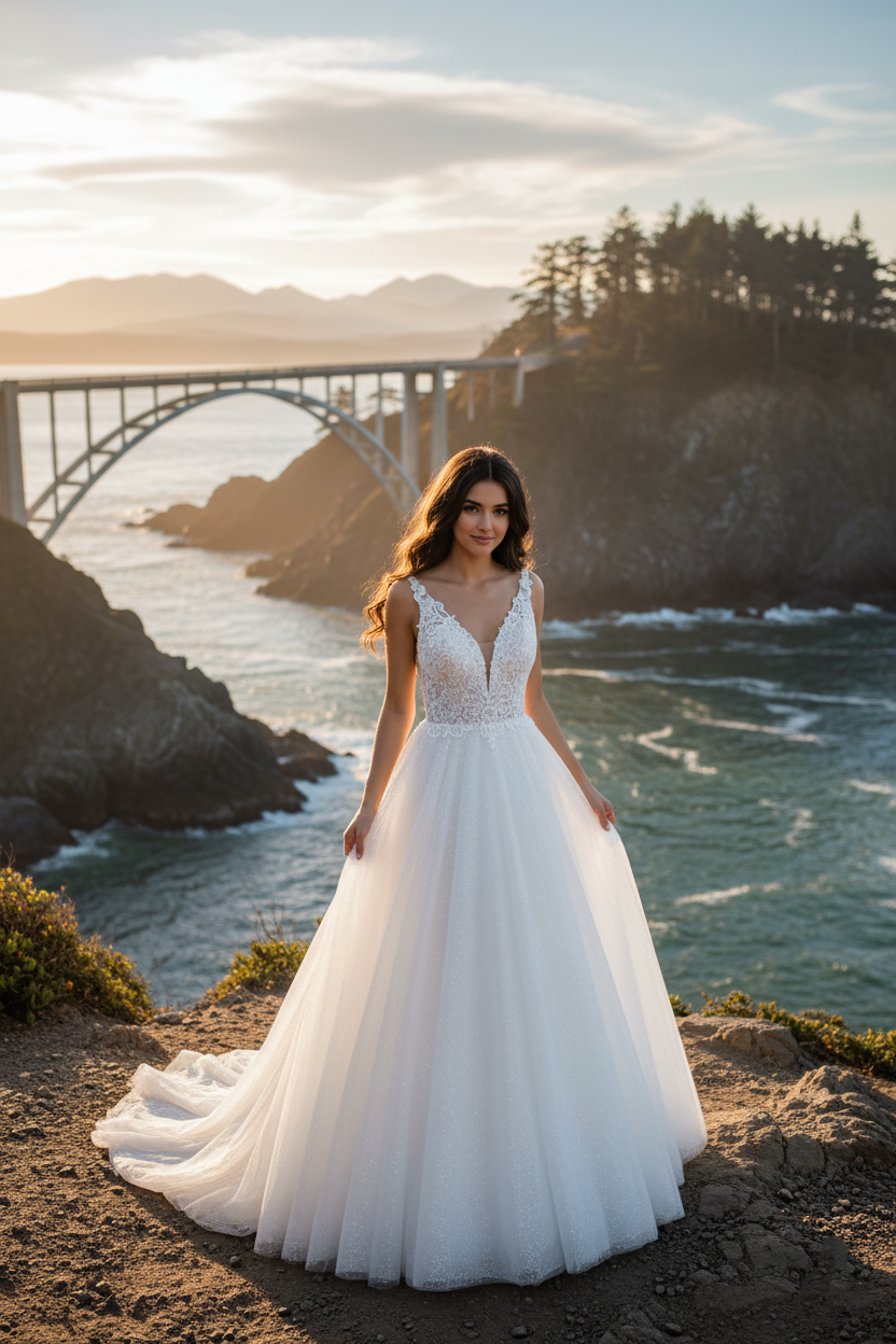 The Alba gown is perfect for the modern bride who craves soft sparkle and elevated simplicity. Its delicate glitter lace creates a luminous finish, while the silhouette flatters every shape—making it ideal for both ballroom and garden weddings alike.