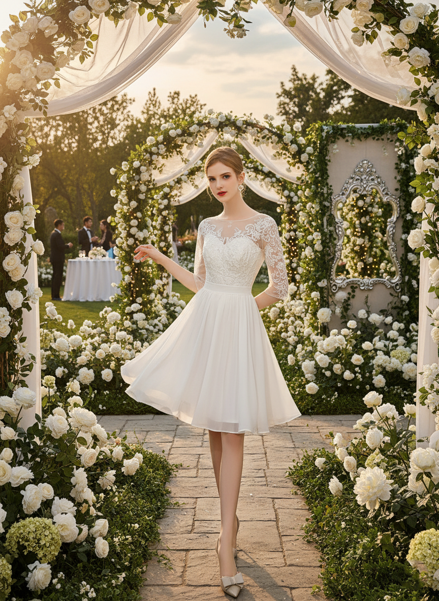 Vintage-inspired, minimalist, or modern brides seeking a short, romantic wedding dress that’s perfect for city weddings, courthouse ceremonies, or bridal receptions.