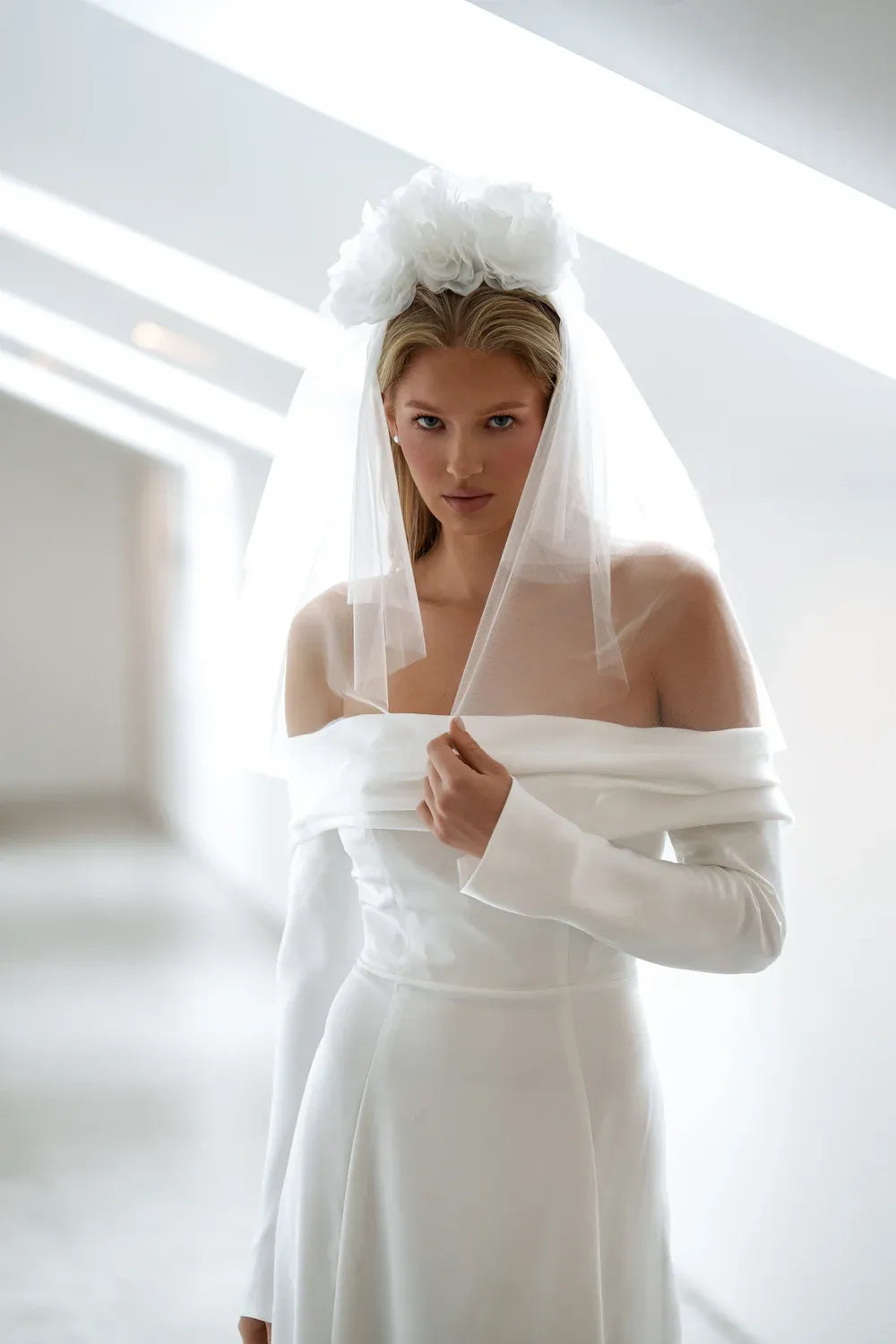 Refined, modern, and effortlessly elegant, Allamanda by Sony Soley for the Natalia Romanova Fashion House is a minimalist wedding gown designed for brides who appreciate clean lines and timeless sophistication. This sleek silhouette features a graceful off-the-shoulder neckline paired with long fitted sleeves, striking the perfect balance between softness and structure.