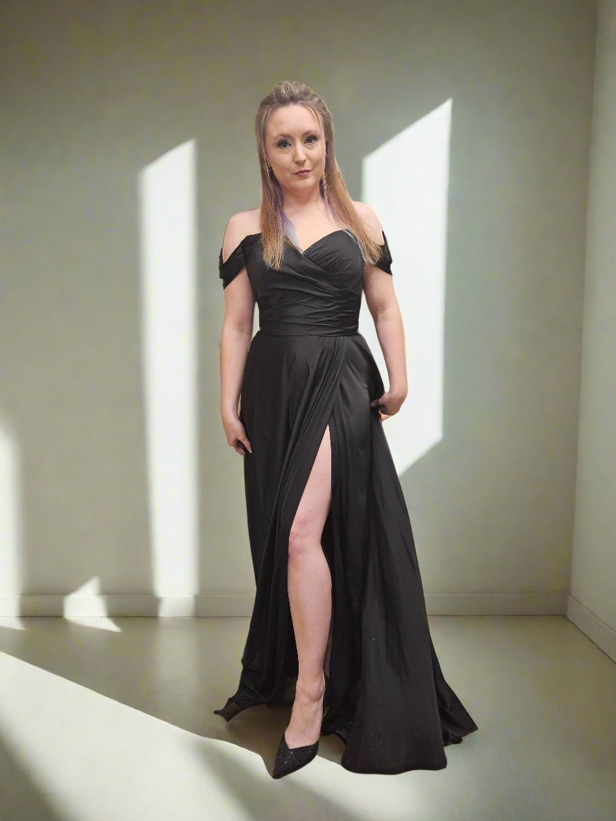 This a-line satin gown offers both comfort and elegance. A simple sweetheart neckline gathers around the waistline flowing into a light slitted skirt. Off the shoulder sleeves add a touch of romance to this timeless piece.