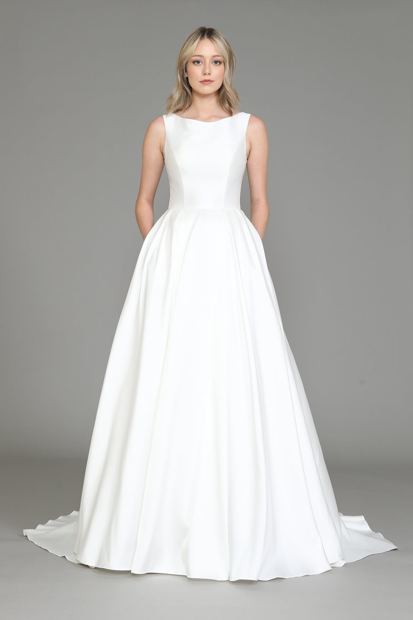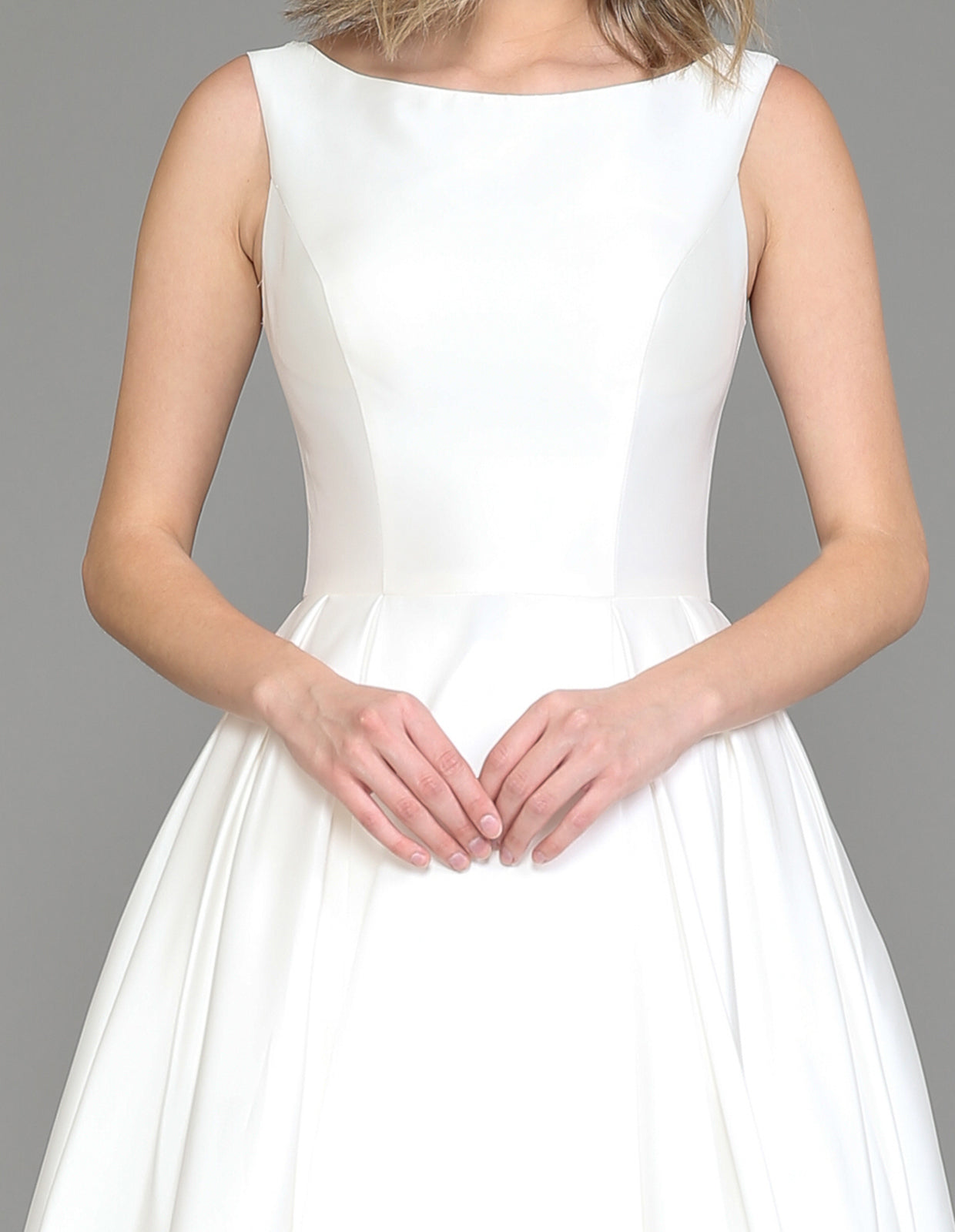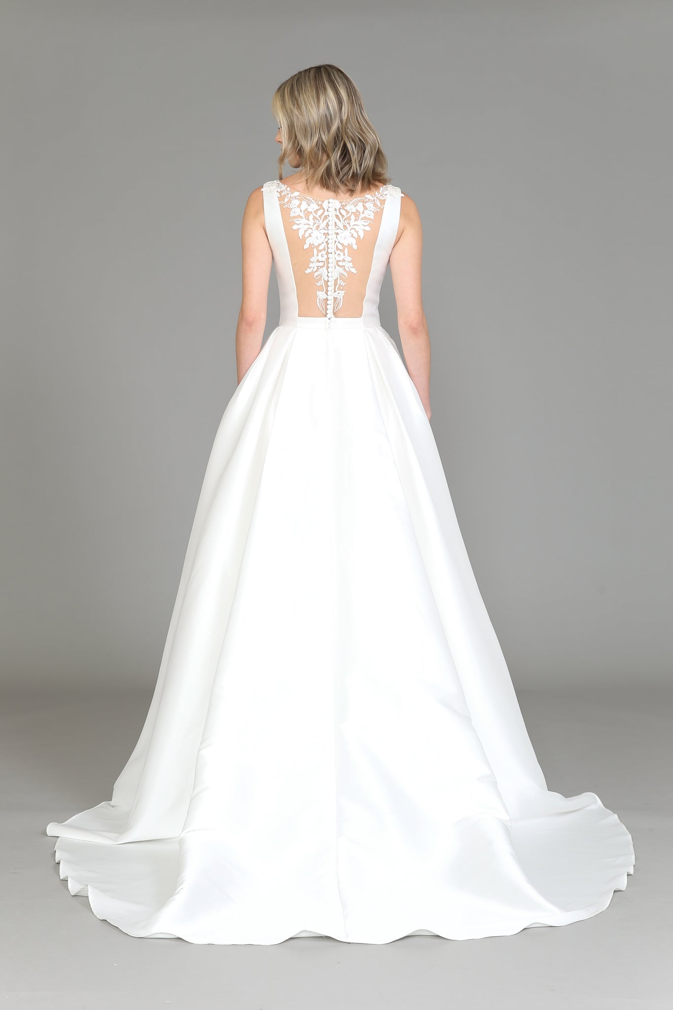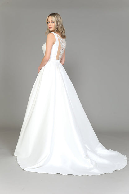 This classy wedding dress features: Embroidered lace upper back, has A-line skirt with short train and side pockets.