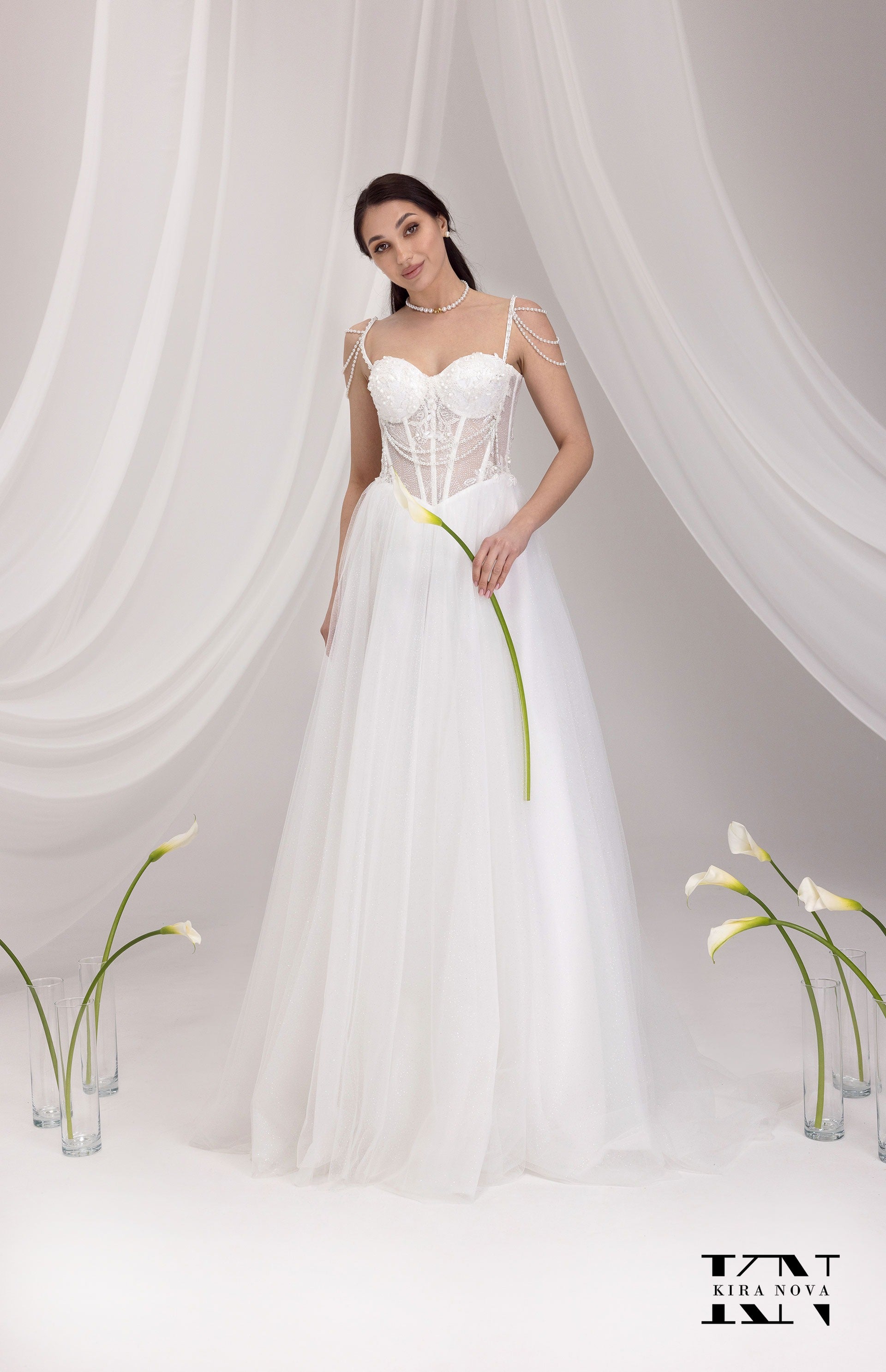 Ethereal and refined, Asmin is a romantic A-line wedding dress designed for brides who love delicate detail with modern elegance. The gown features a sheer corset bodice adorned with pearl and bead embellishments, creating soft structure while highlighting the waist and décolletage.