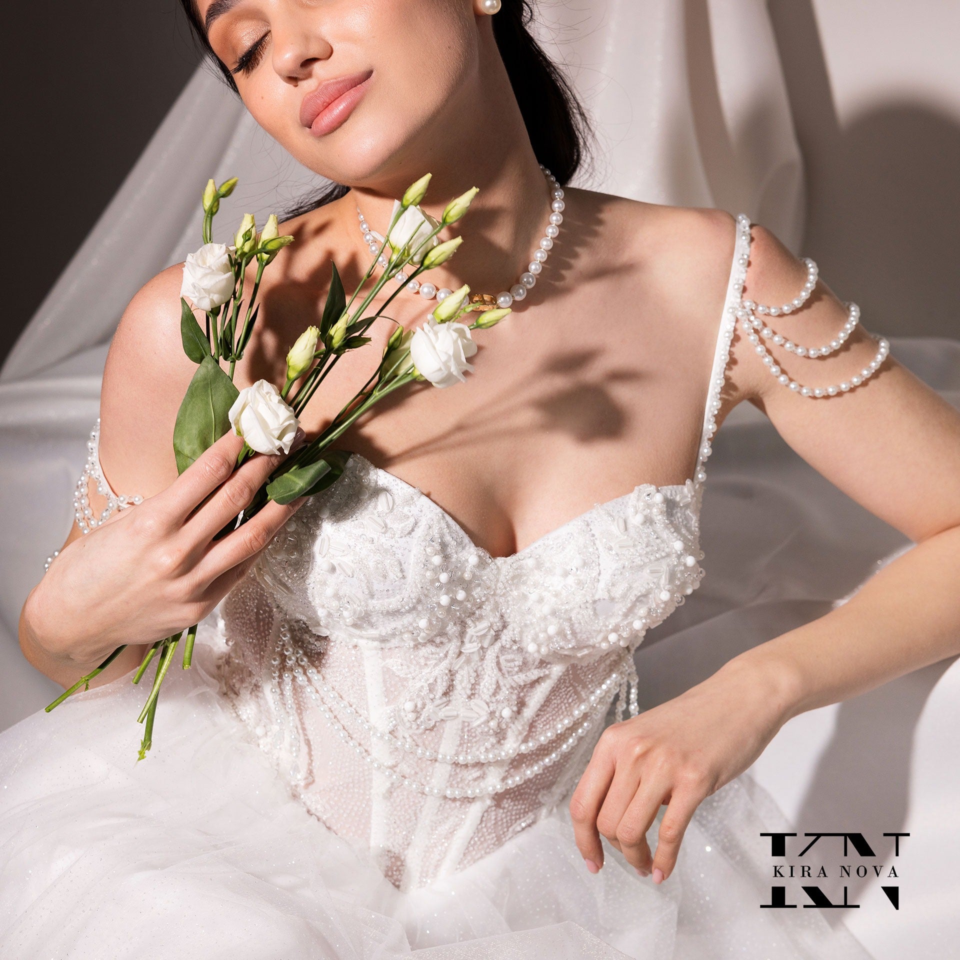 Asmin – Pearl Corset A-Line Wedding Dress with Draped Shoulder Strands