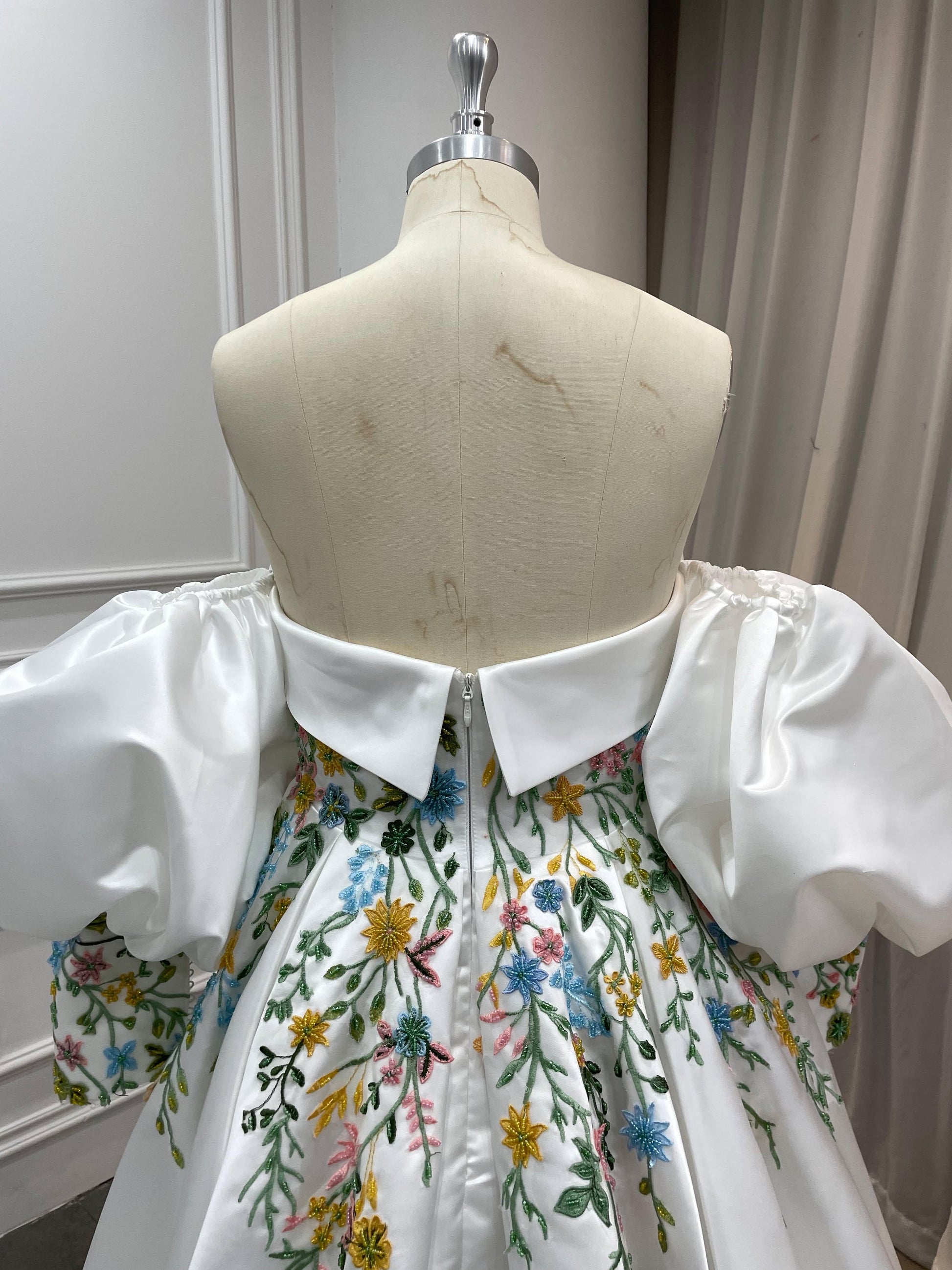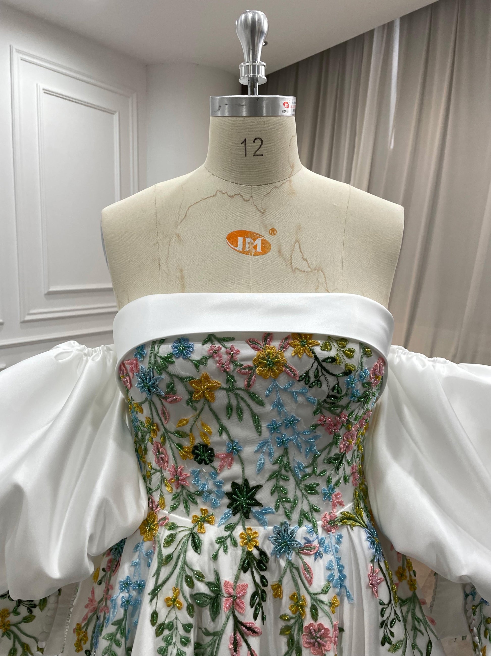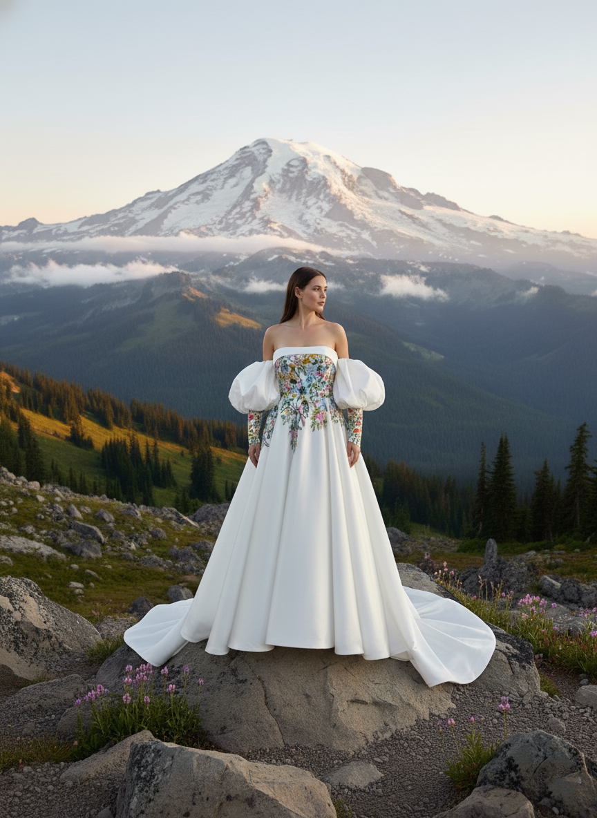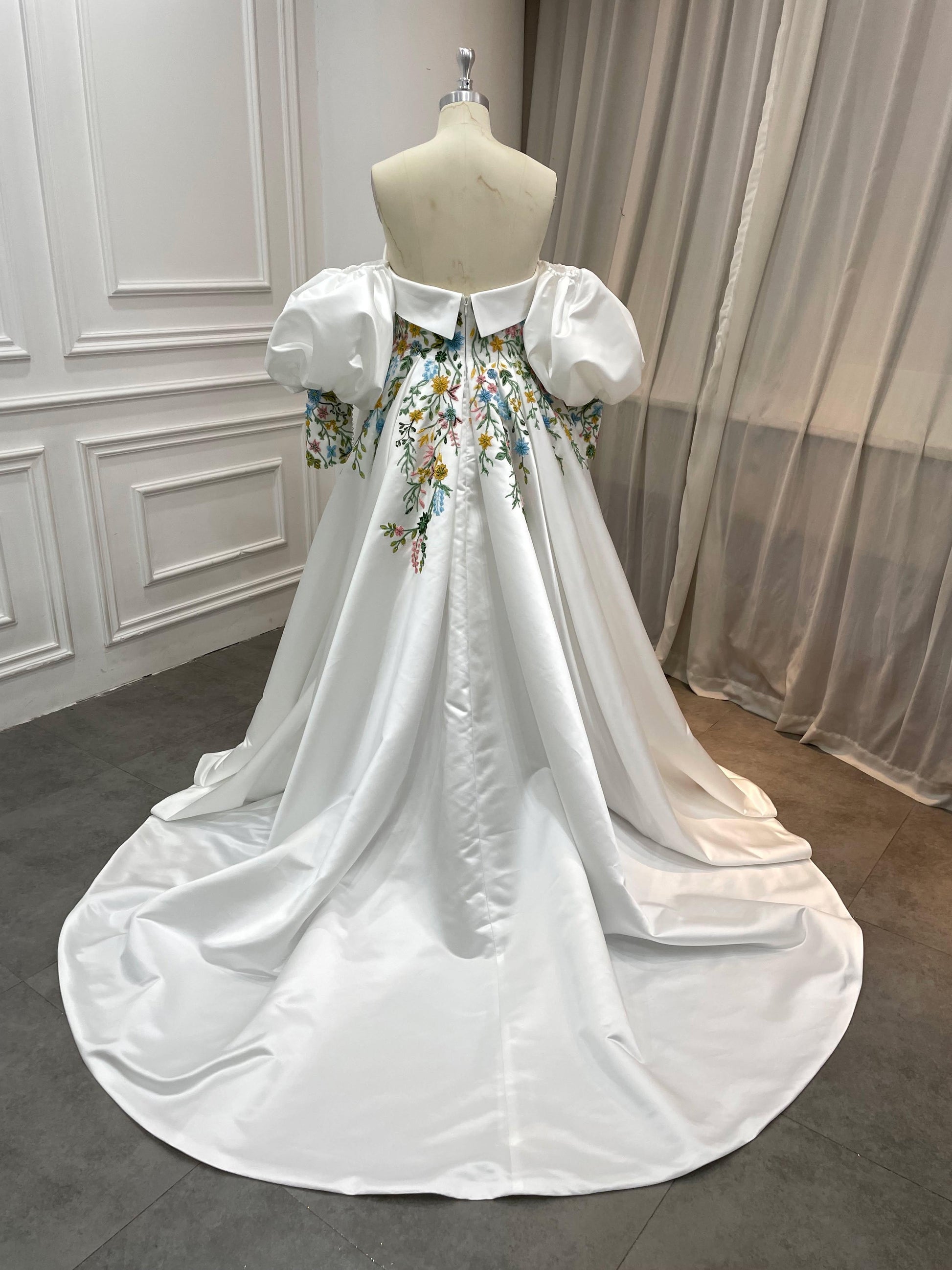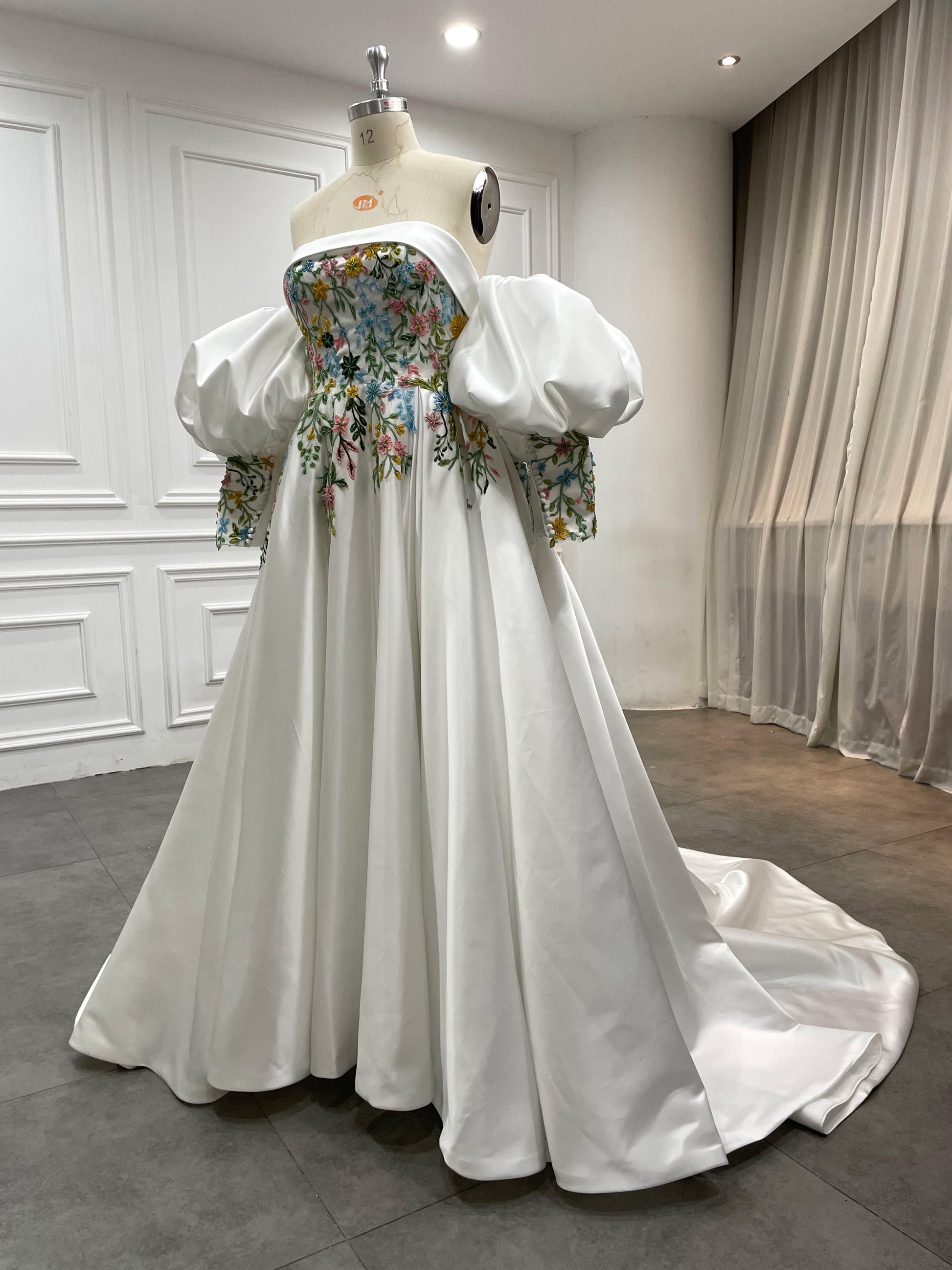 Meet Aster, a statement wedding gown designed for brides who love florals and couture structure. The strapless, off-the-shoulder neckline frames your décolletage, while detachable voluminous puff sleeves add drama and versatility. A sculpted corset bodice is hand-embroidered with multicolor floral lace appliqués that cascade onto a luminous skirt. The sweeping A-line/ball gown silhouette and chapel train float with every step—picture-perfect for garden, museum, or grand ballroom weddings.