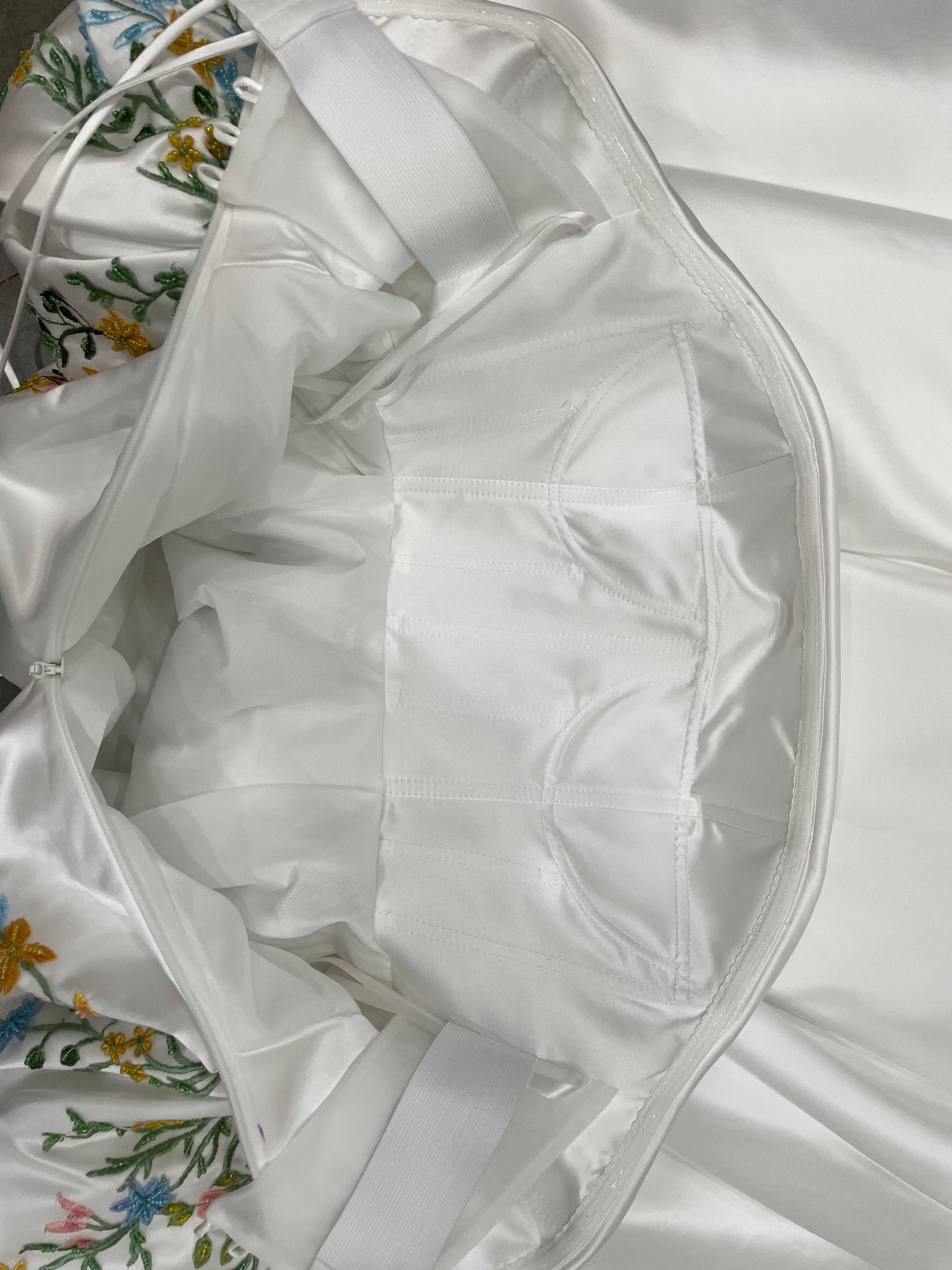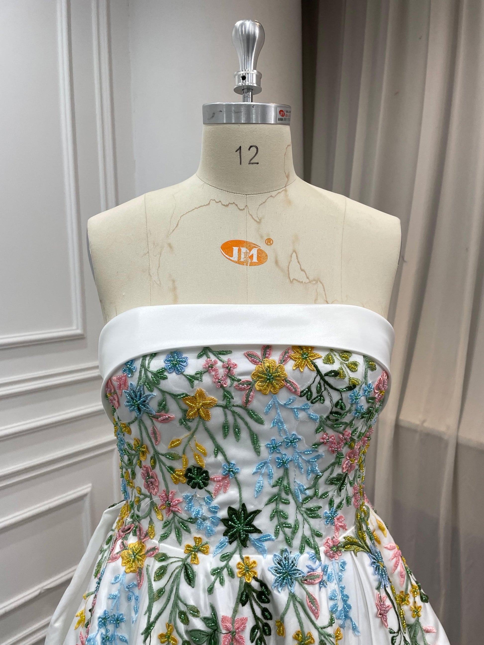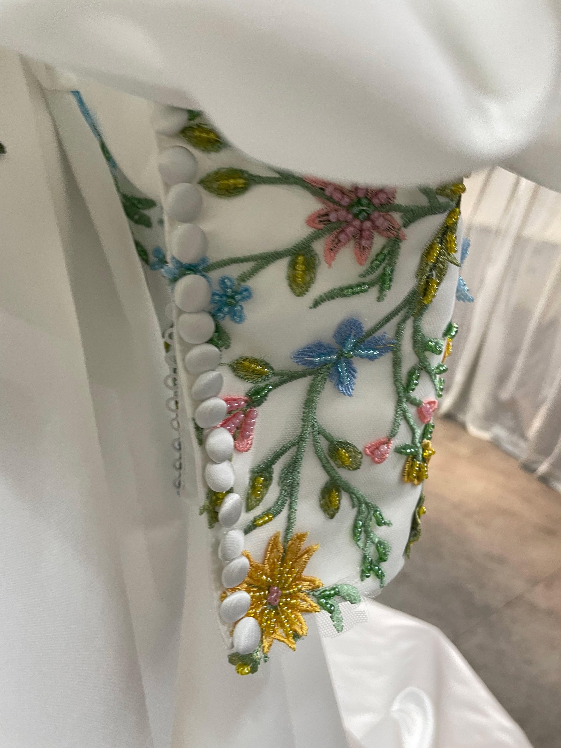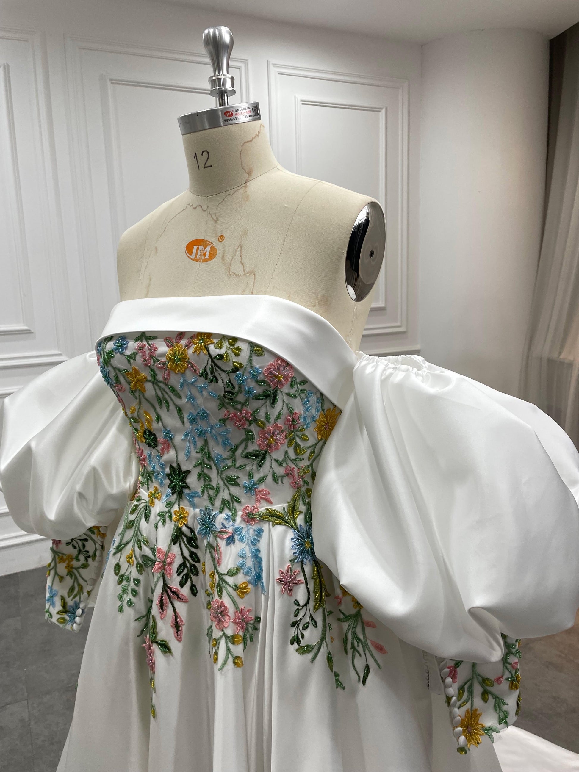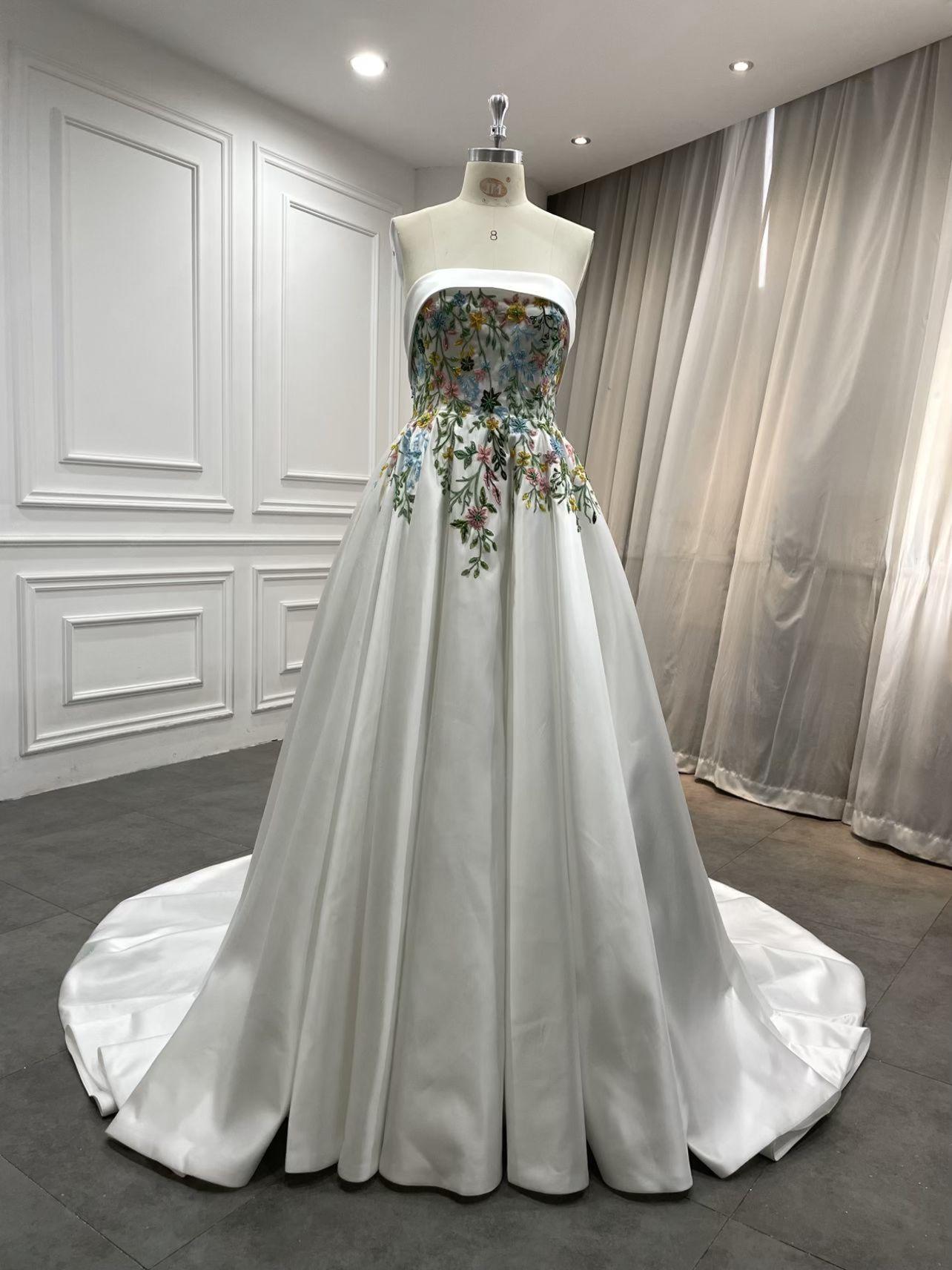 Meet Aster, a statement wedding gown designed for brides who love florals and couture structure. The strapless, off-the-shoulder neckline frames your décolletage, while detachable voluminous puff sleeves add drama and versatility. A sculpted corset bodice is hand-embroidered with multicolor floral lace appliqués that cascade onto a luminous skirt. The sweeping A-line/ball gown silhouette and chapel train float with every step—picture-perfect for garden, museum, or grand ballroom weddings.