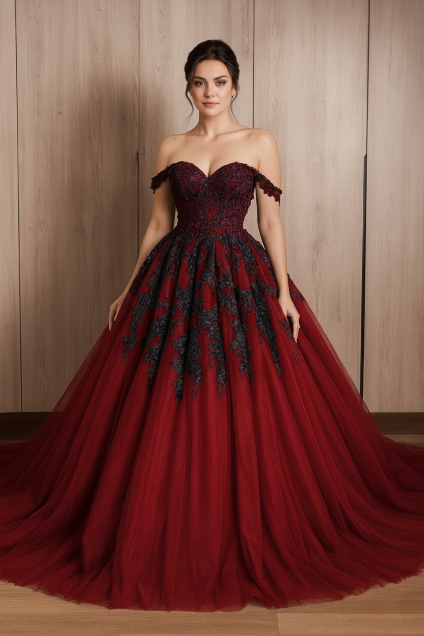 The Princess Black Purple Gothic Wedding Dress is a captivating and unconventional choice. The combination of black lace and purple tulle creates a moody and romantic atmosphere. The ball gown silhouette is grand and makes a statement. The off-the-shoulder straps add a touch of elegance and femininity. This dress is perfect for the bride who wants to break away from tradition and embrace a gothic-inspired look. It will make you feel like a dark princess on your special day, leaving a lasting impression.