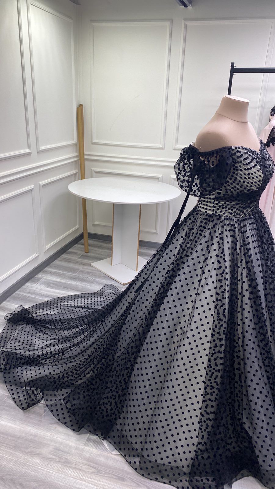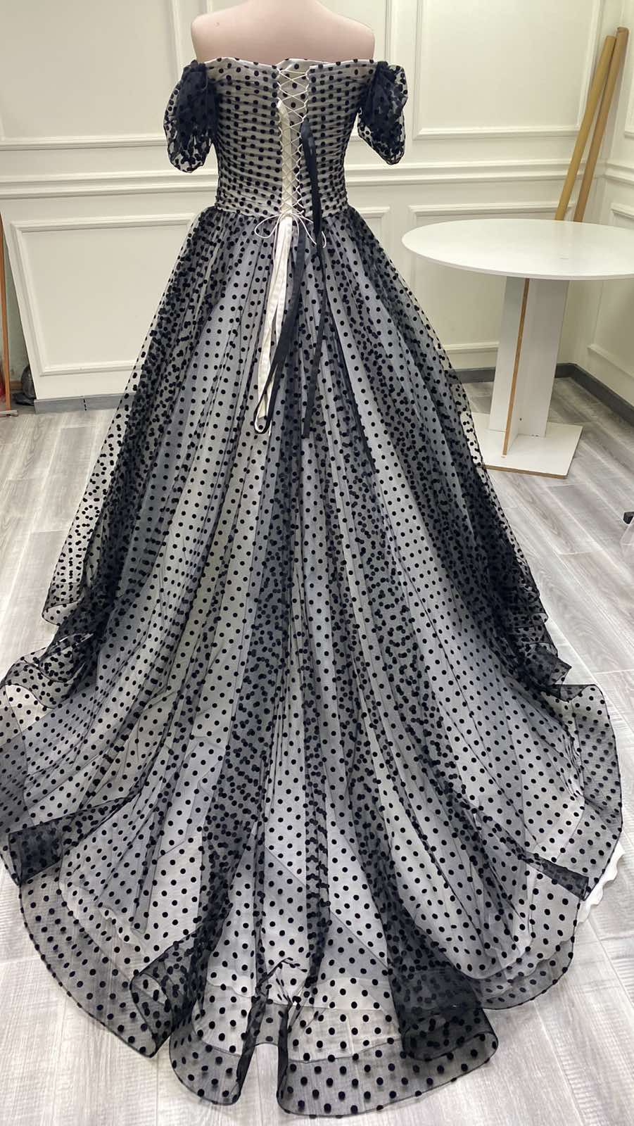 Belladonna – Black Polka Dot Off-Shoulder Ball Gown with Corset Back