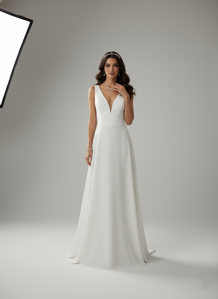 The Anastasia Bridal Dress by Bianco Evento is a modern take on timeless grace. Made from high-quality georgette, this flowing A-line wedding gown features a deep V-neckline in the front and back, delicately lined with soft tulle inserts for subtle coverage and comfort. The smooth silhouette flatters every figure, while the discreet back zipper and 4 cm seam allowance allow for easy tailoring. Designed and made in Europe, it’s perfect for brides who adore effortless elegance and minimalist beauty.
