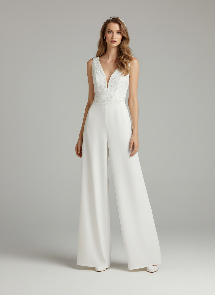 Effortlessly chic and undeniably modern, the Celeste Bridal Jumpsuit by Bianco Evento is perfect for brides seeking bohemian elegance with a contemporary twist. Made from high-quality chiffon and boho lace, this jumpsuit features a deep V-neckline, wide-leg silhouette, and discreet back-zip fastening for a flattering and comfortable fit. The 4 cm seam allowance allows for easy tailoring, while the European craftsmanship ensures every detail is beautifully finished. Ideal for civil ceremonies, elopements, or minimalist brides who love a touch of romance.