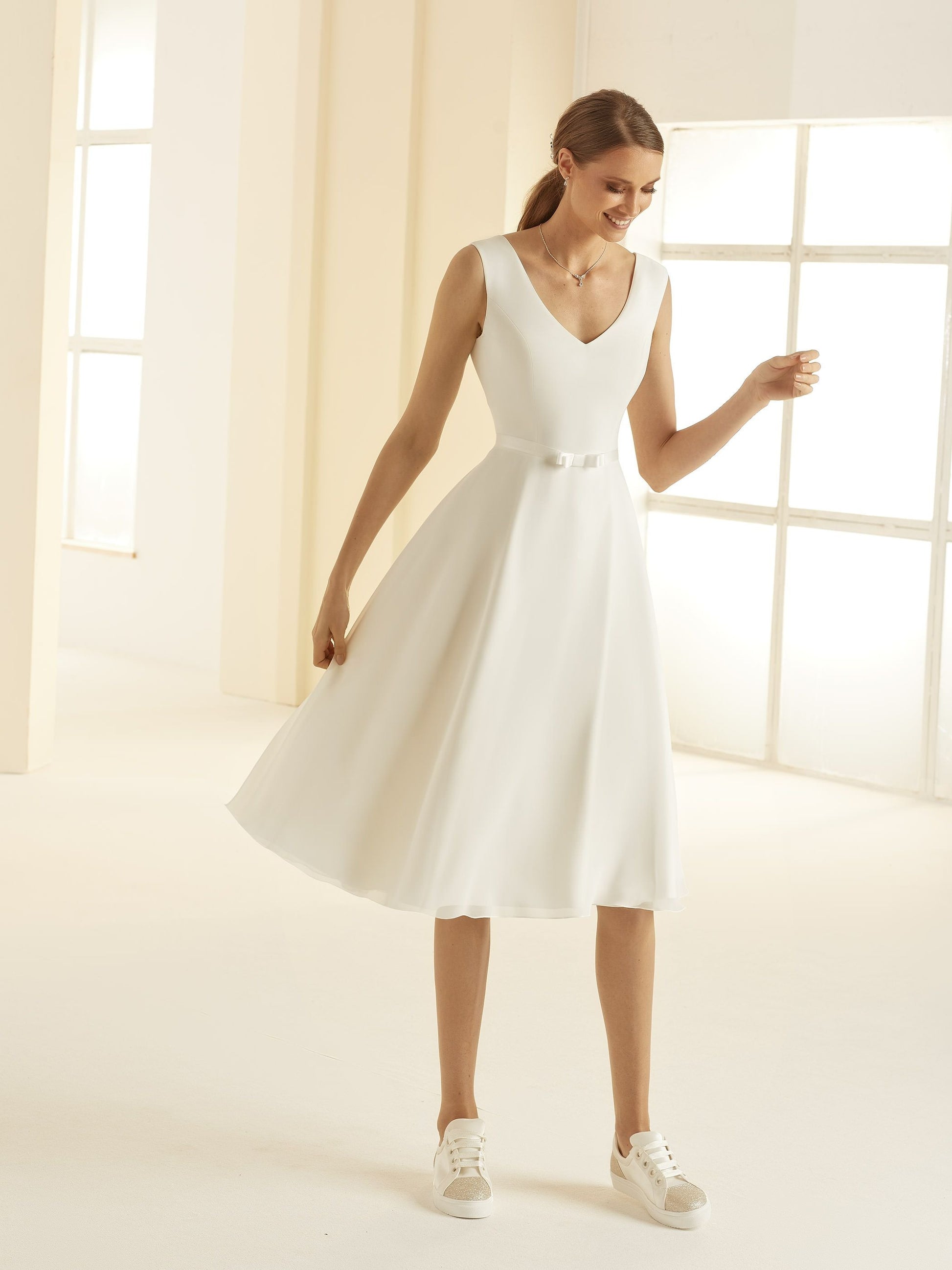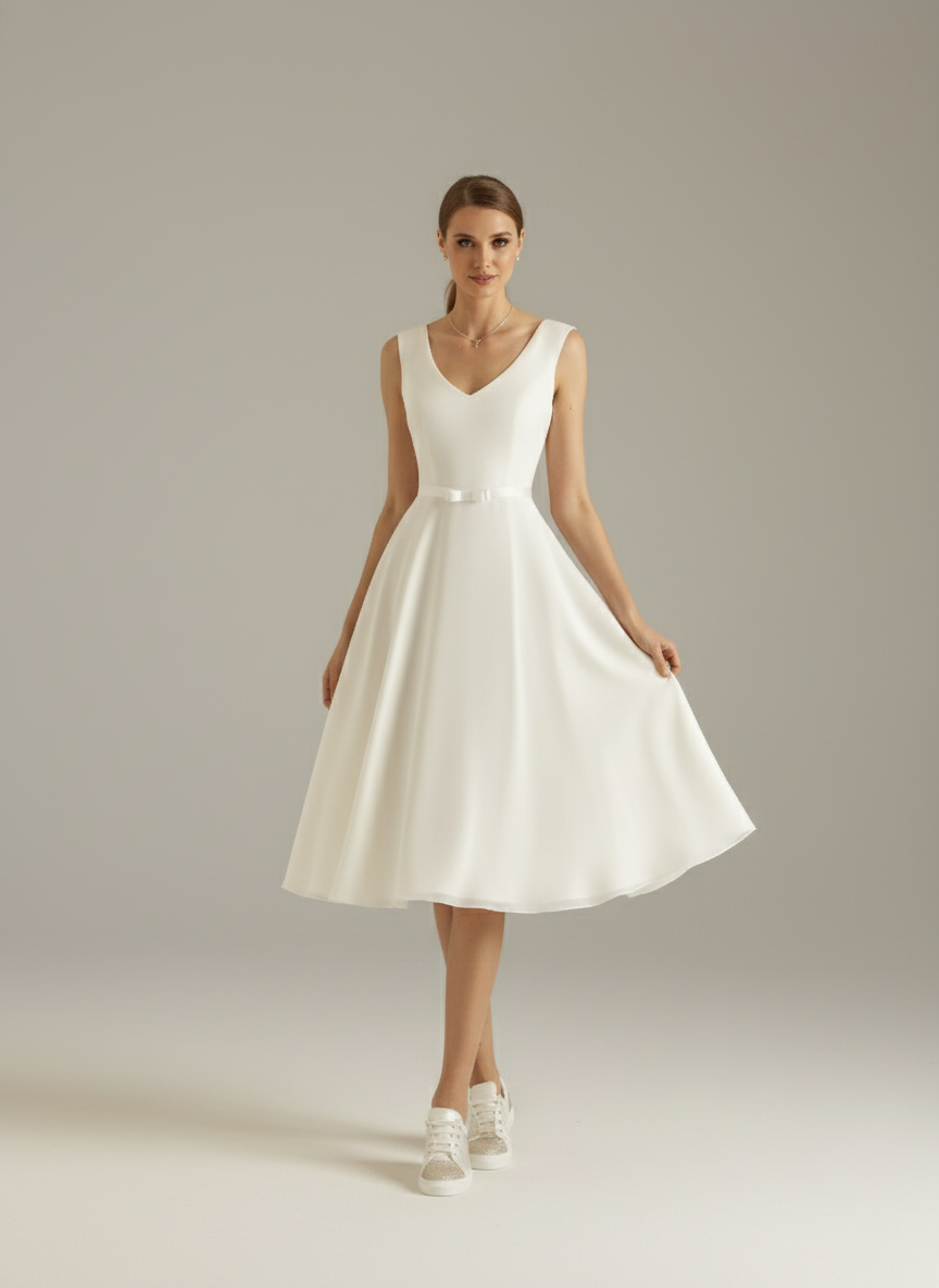 The Kornelia Short Bridal Dress by Bianco Evento is the perfect choice for modern brides seeking effortless elegance and comfort. Crafted from high-quality chiffon, this A-line short wedding dress features a flattering V-neckline and V-back, a discreet back-zip closure, and a non-slip elastic strap for a secure fit. The 4 cm seam allowance allows for easy tailoring, while the airy chiffon skirt creates graceful movement—ideal for civil ceremonies, destination weddings, or casual receptions.