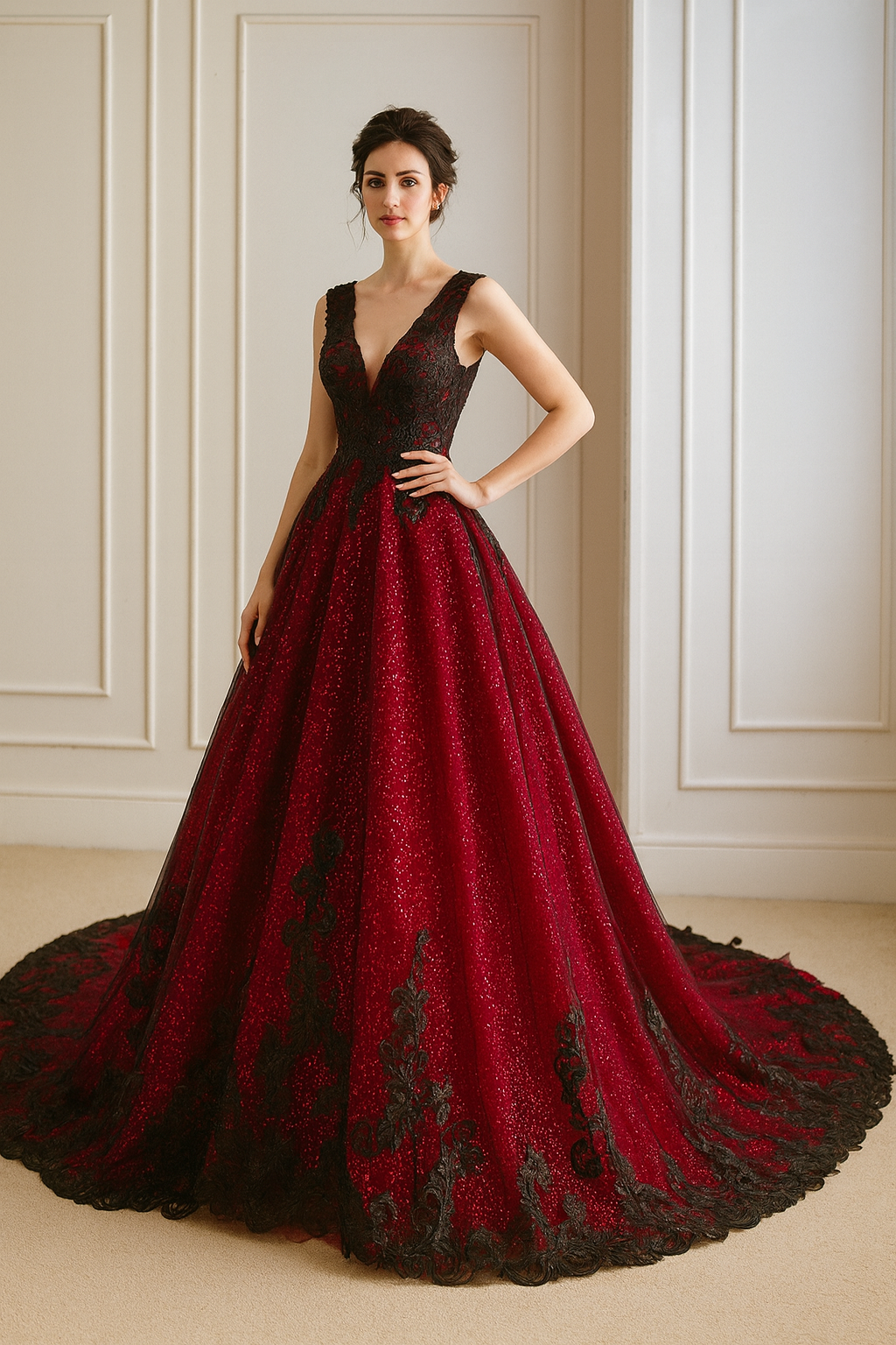 Keywords: black and white wedding dress, gothic wedding gown, ball gown wedding dress, black lace wedding dress, alternative bridal style, dramatic wedding dress, corset back bridal gown, fairytale wedding dress, gothic bridal fashion.