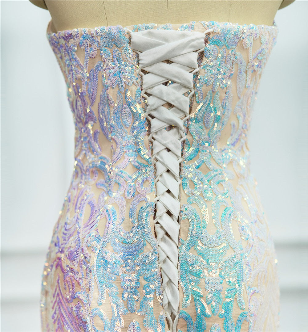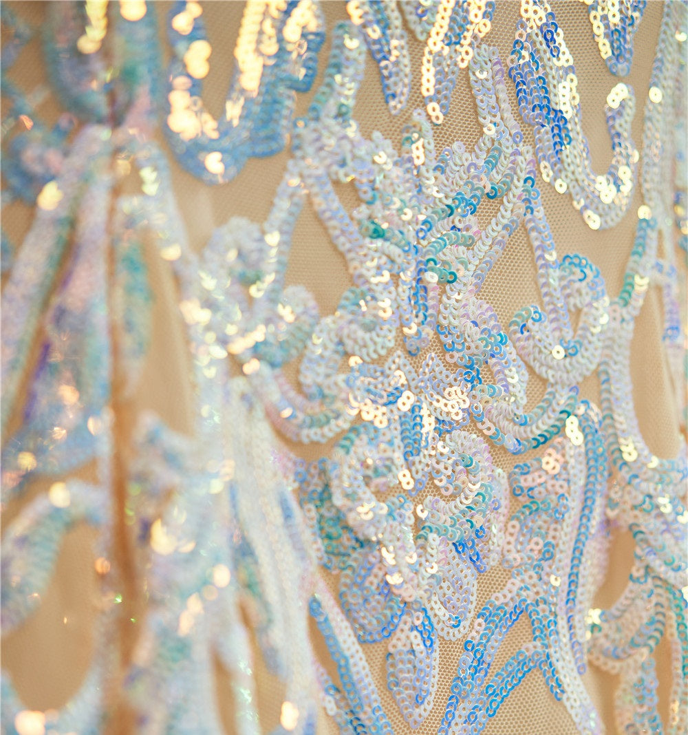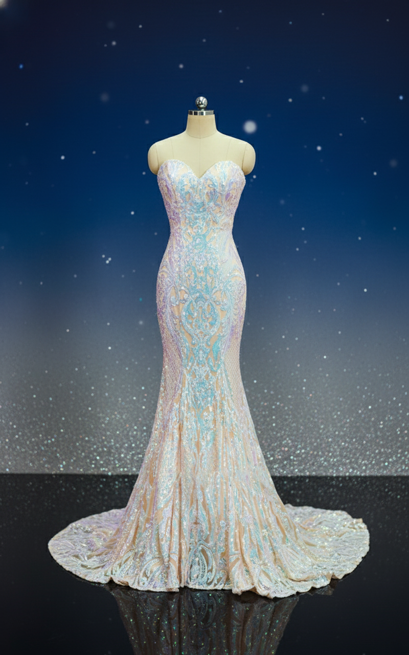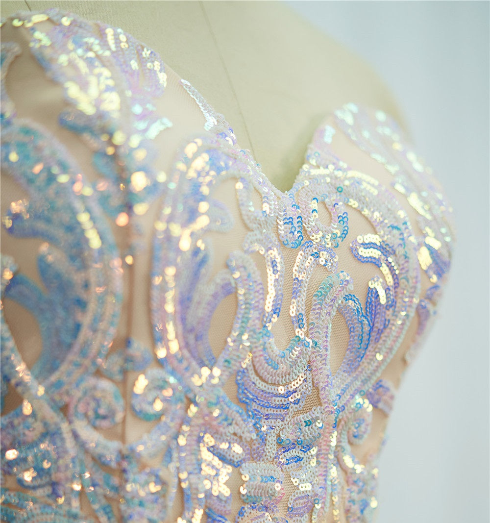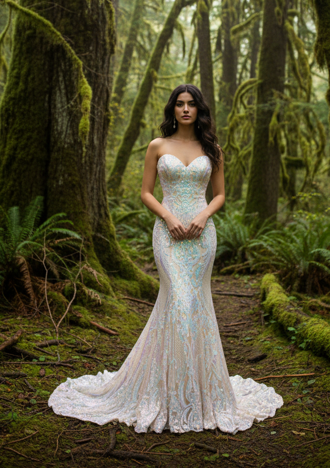 Radiant, ethereal, and effortlessly sculpted — Blaire is the gown for brides who want to shine like stardust while maintaining a sleek, sophisticated silhouette. This shimmering mermaid gown features a breathtaking iridescent fabric that shifts between soft pastels—lavender, ice blue, rose gold, and opal—creating a mesmerizing glow with every movement.