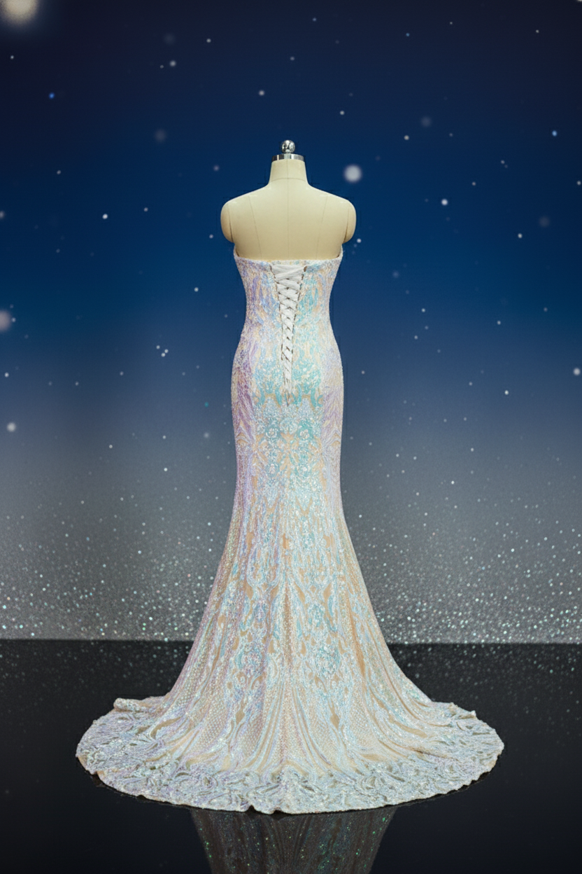The structured sweetheart bodice enhances the natural curves while offering support and shape. From there, the gown flows into a fitted mermaid skirt that cascades into a soft, fluid train reminiscent of moonlit water. The lace-up corset back adds adjustability, shaping, and visual drama to the sleek profile.