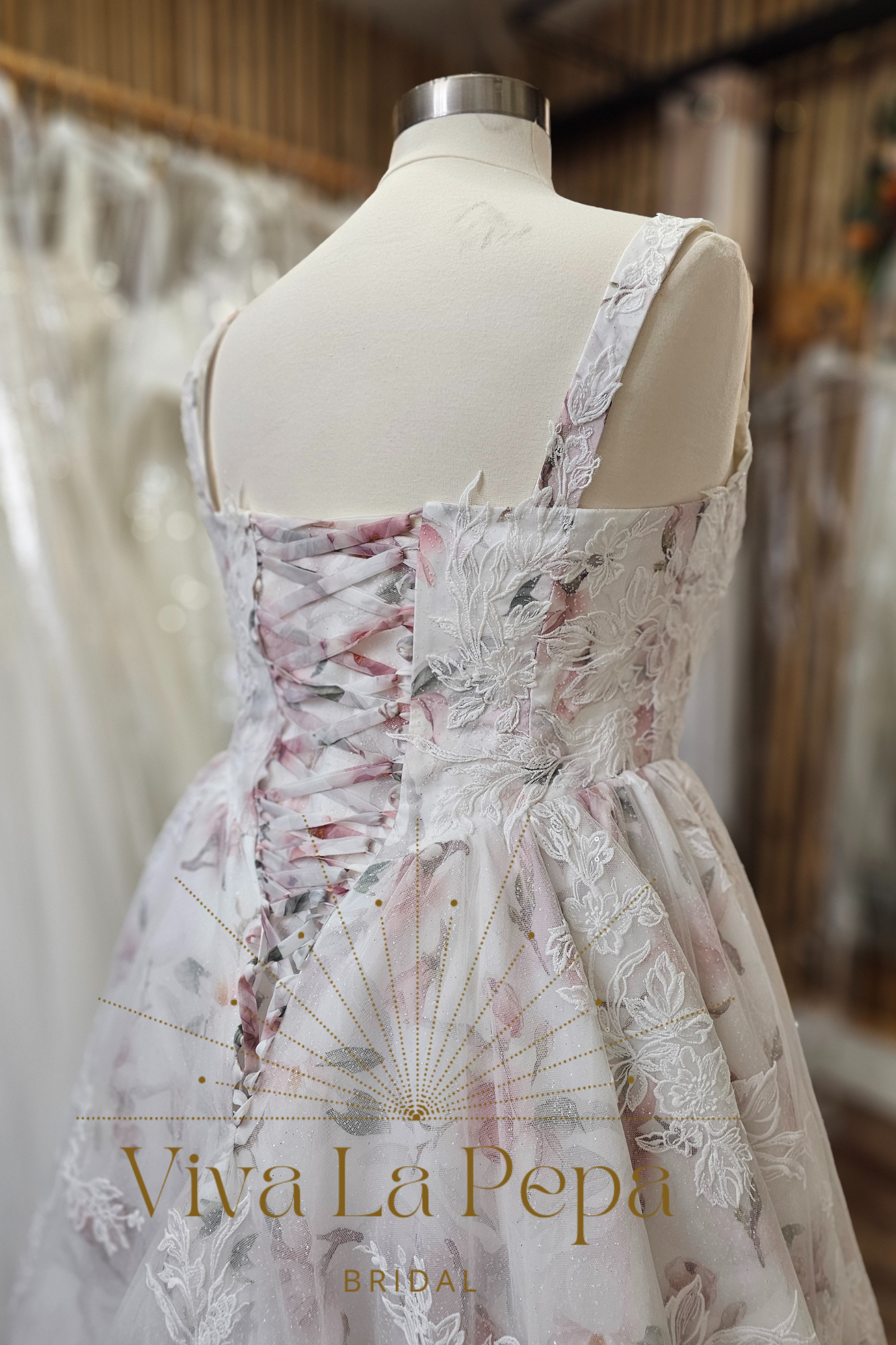 Perfect for: garden weddings, vineyard venues, romantic estates, and brides seeking a floral (color) gown with couture details.