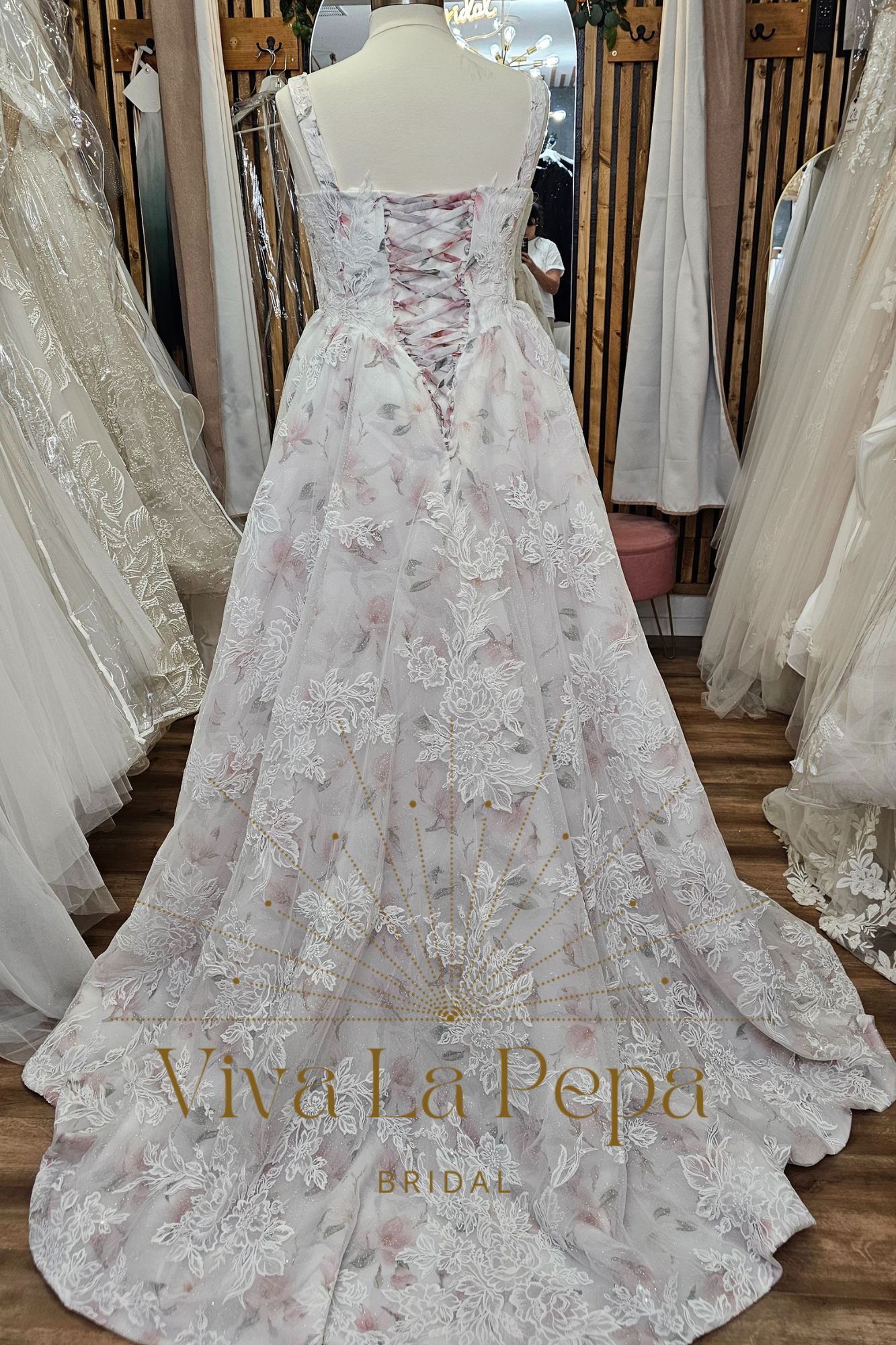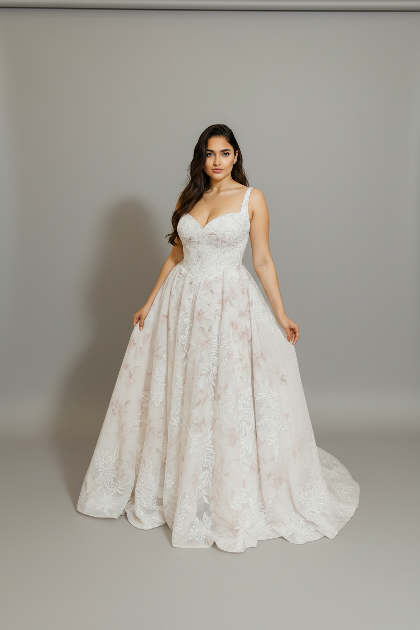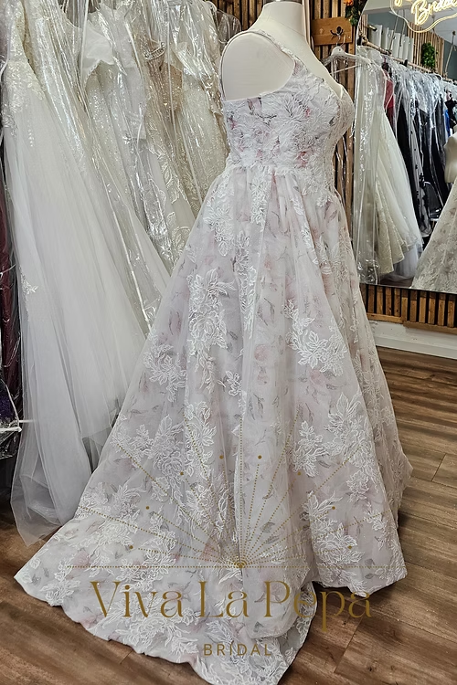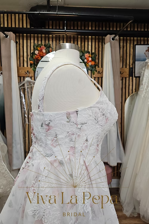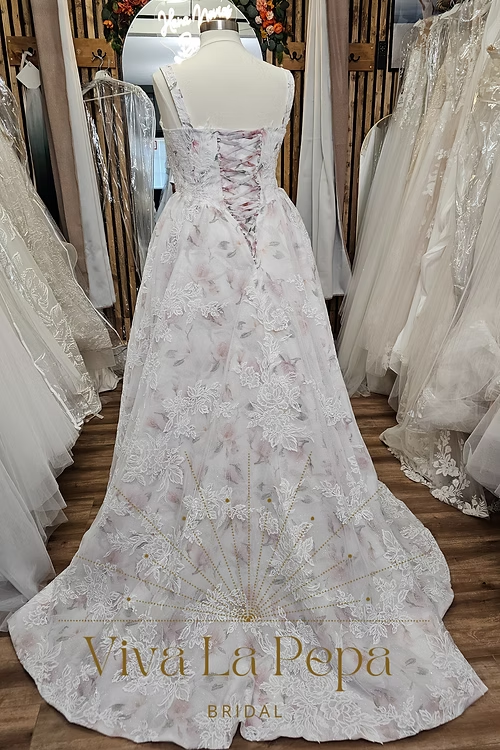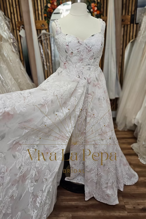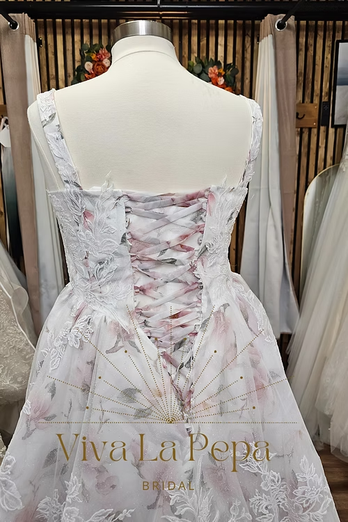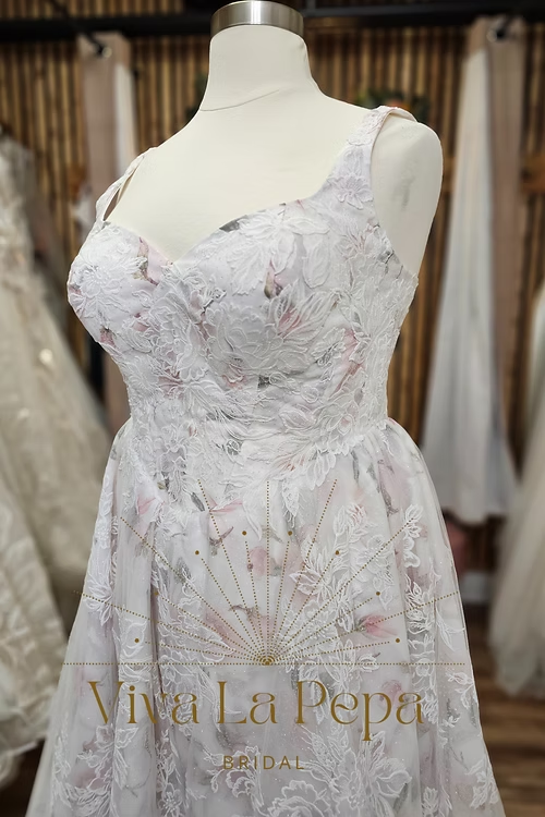 Romantic and refined, Blooming Grace by Viva La Pepa blends soft watercolor-blush tones with dimensional floral lace for a look that feels like walking through a garden. The sculpted sweetheart bodice with delicate straps flatters the décolletage, while the corset lace-up back offers a customizable, waist-defining fit. A flowing A-line skirt opens into a chapel-length train, showcasing the botanical embroidery from every angle.