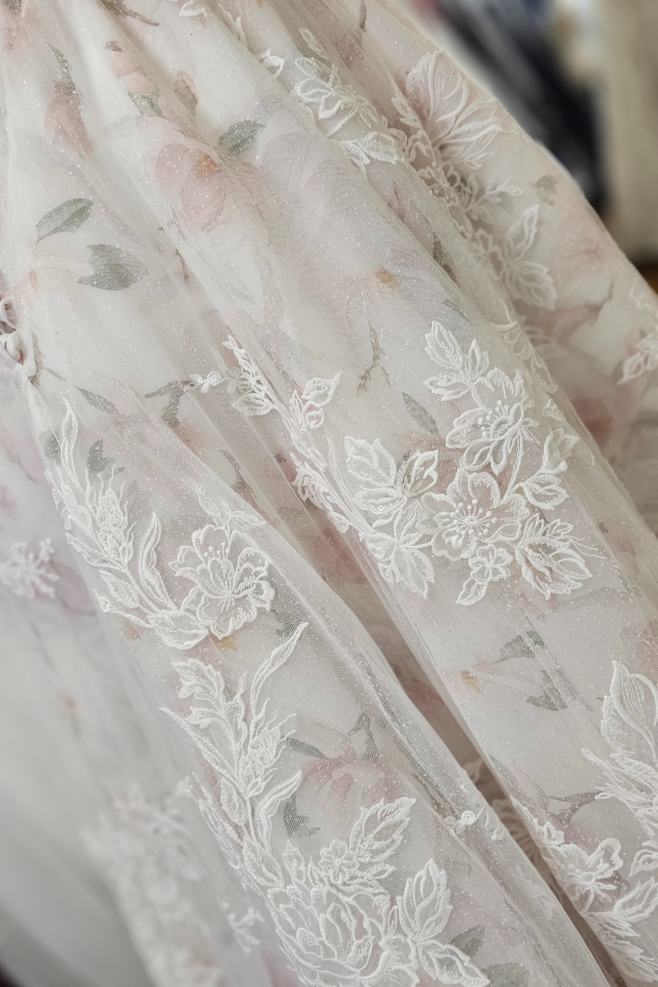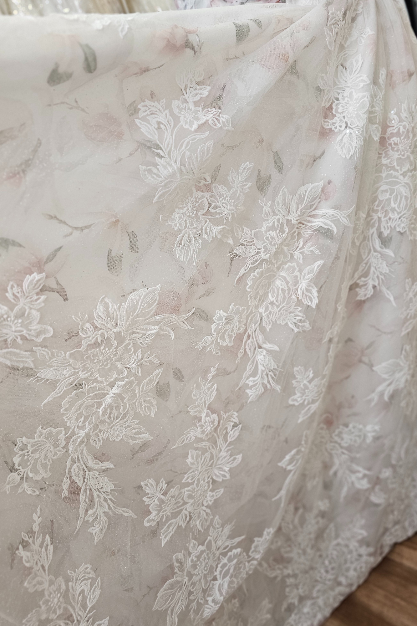 Color-washed blush/multi floral underlayer with ivory lace overlay