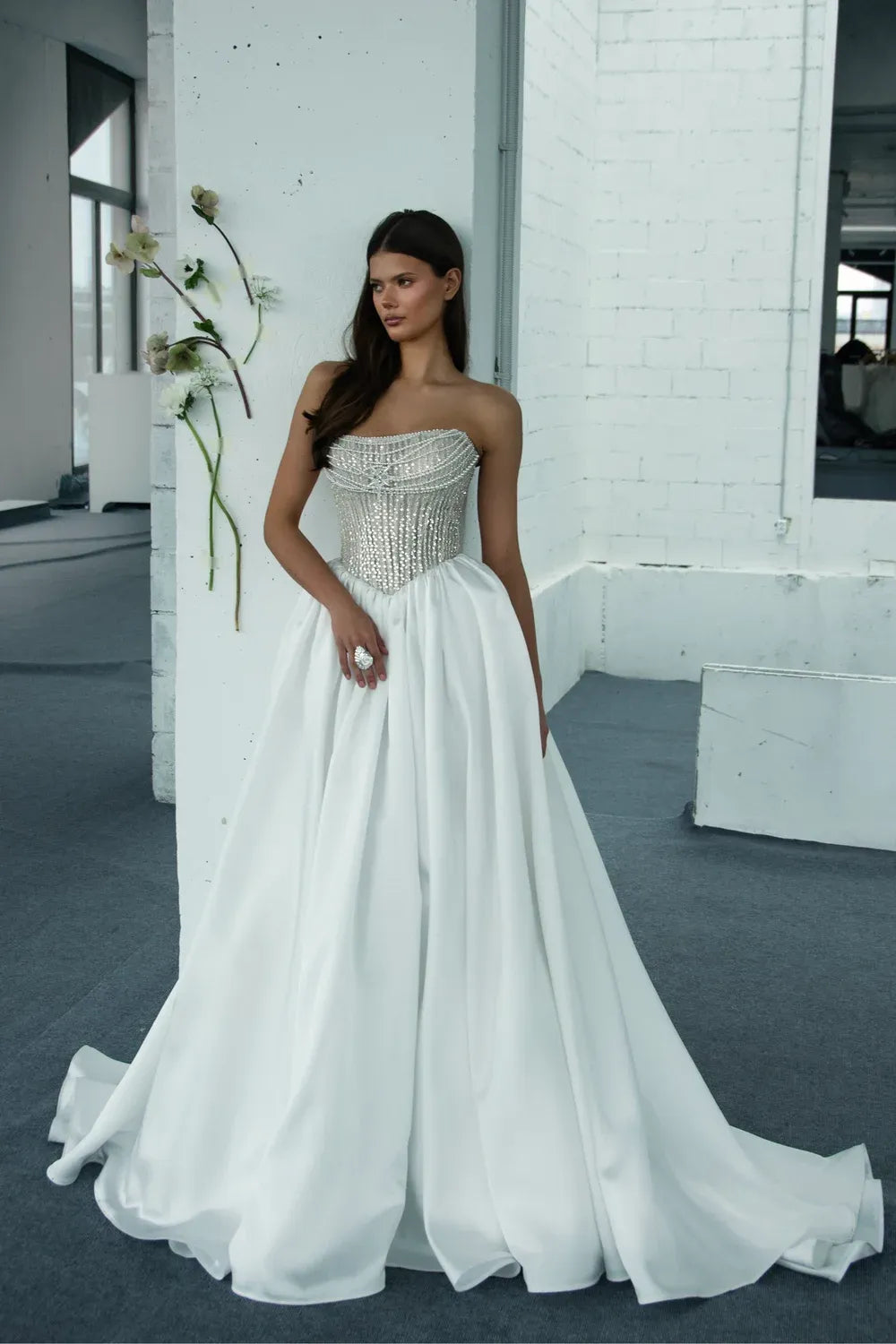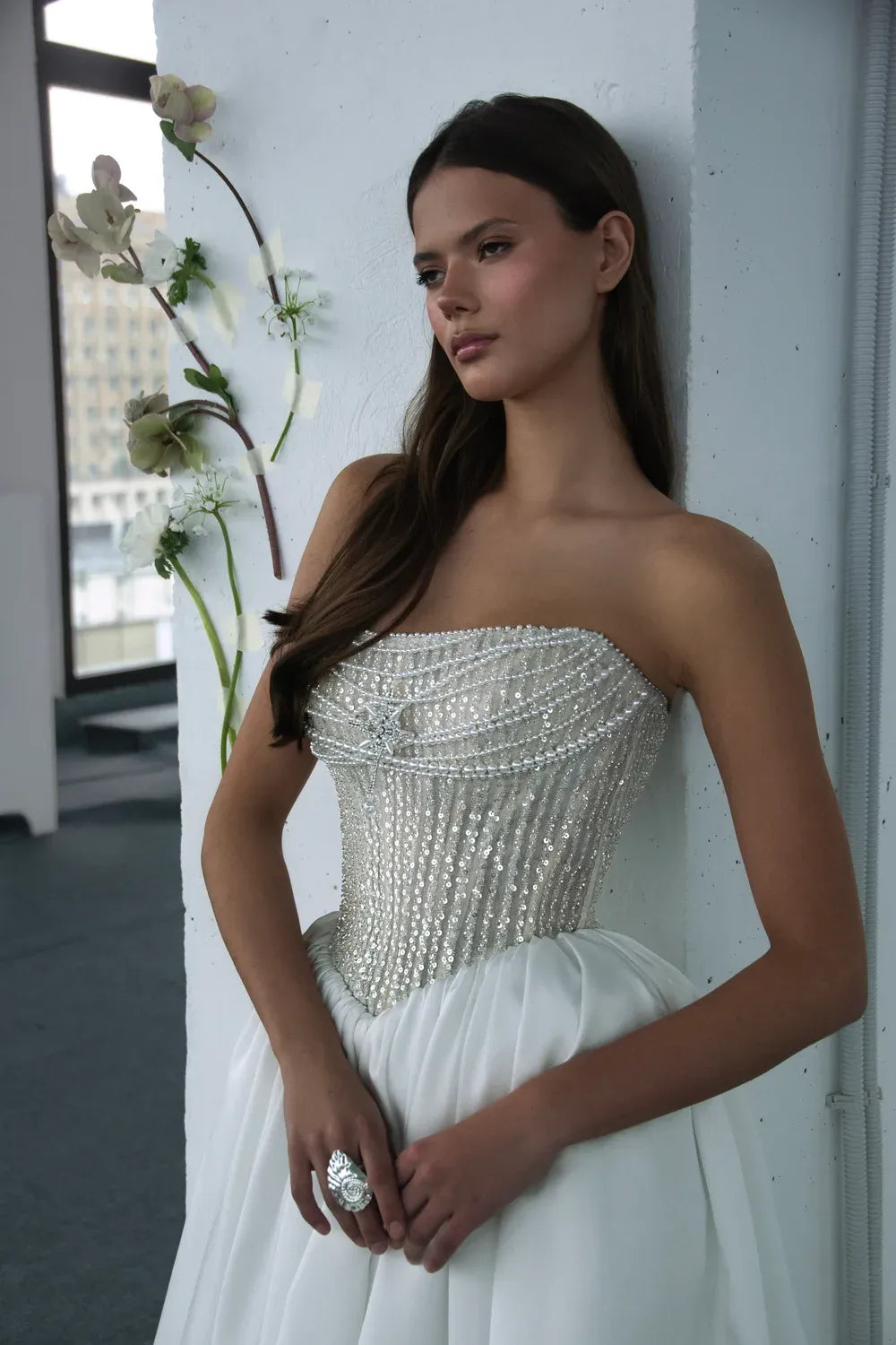 Below the glimmering bodice flows a sumptuous A-line skirt crafted from premium satin-organza with a soft, liquid-like drape. The skirt delivers effortless movement, full volume, and a timelessly romantic look. Lightly gathered at the waist, it creates an elegant hourglass shape while maintaining a clean, modern aesthetic. The gown finishes with a sweeping train that glides gracefully behind you—perfect for dramatic entrances, aisle moments, and editorial photos.