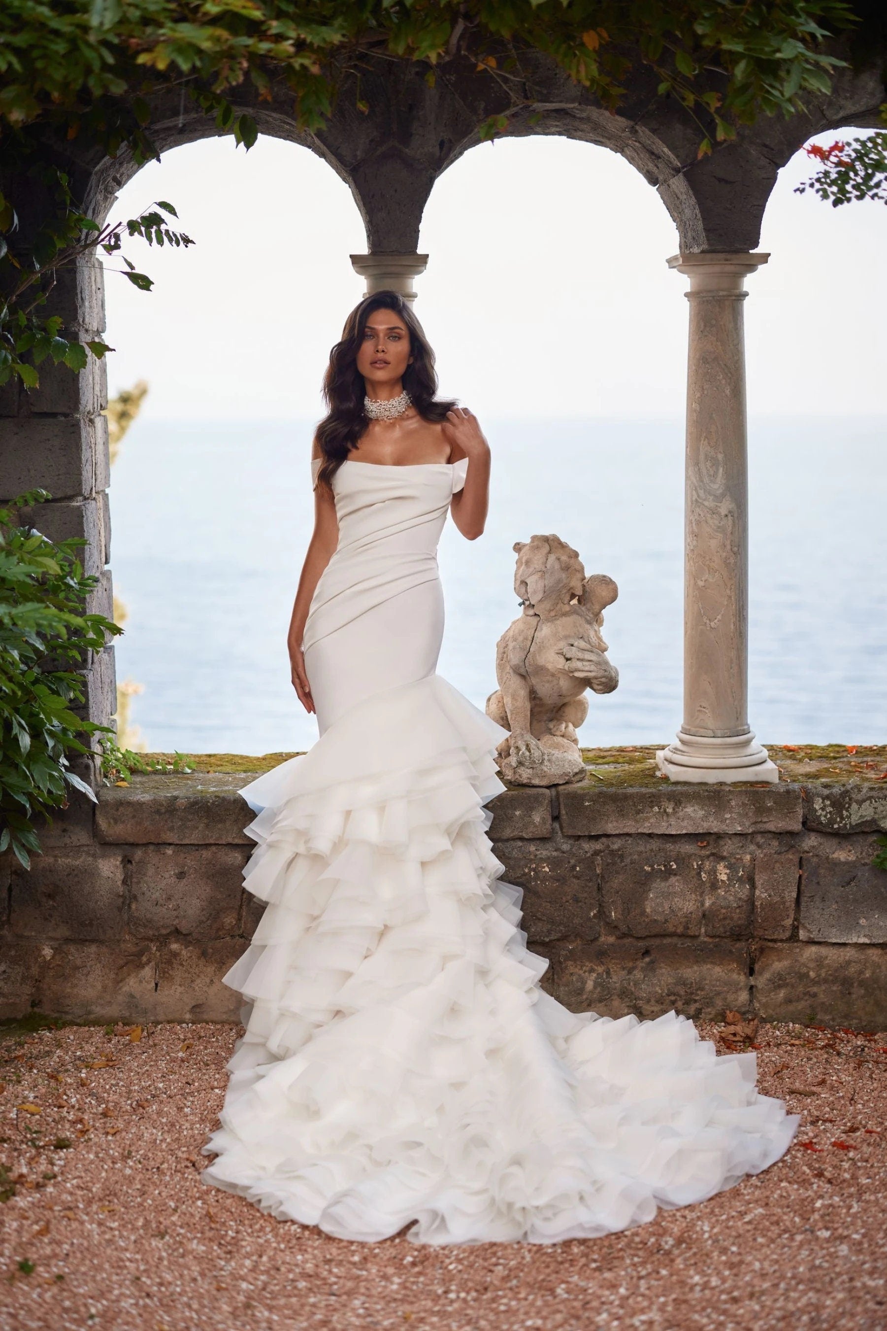 The bride in a mermaid silhouette dress in ivory color, made of costume fabric with a lush train, will charm everyone with a graceful posture. The top of the dress has a slightly concave neckline in front and short sleeves on the forearm. The back is concave below the shoulder blade line. It is an original design solution to decorate the laconic top of the dress with diagonal pleats of the main fabric. The puffy bottom of the dress, starting above the knee level, is decorated with voluminous asymmetric organza ruffles. The clasp of the dress is a hidden zipper.