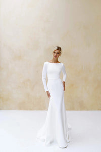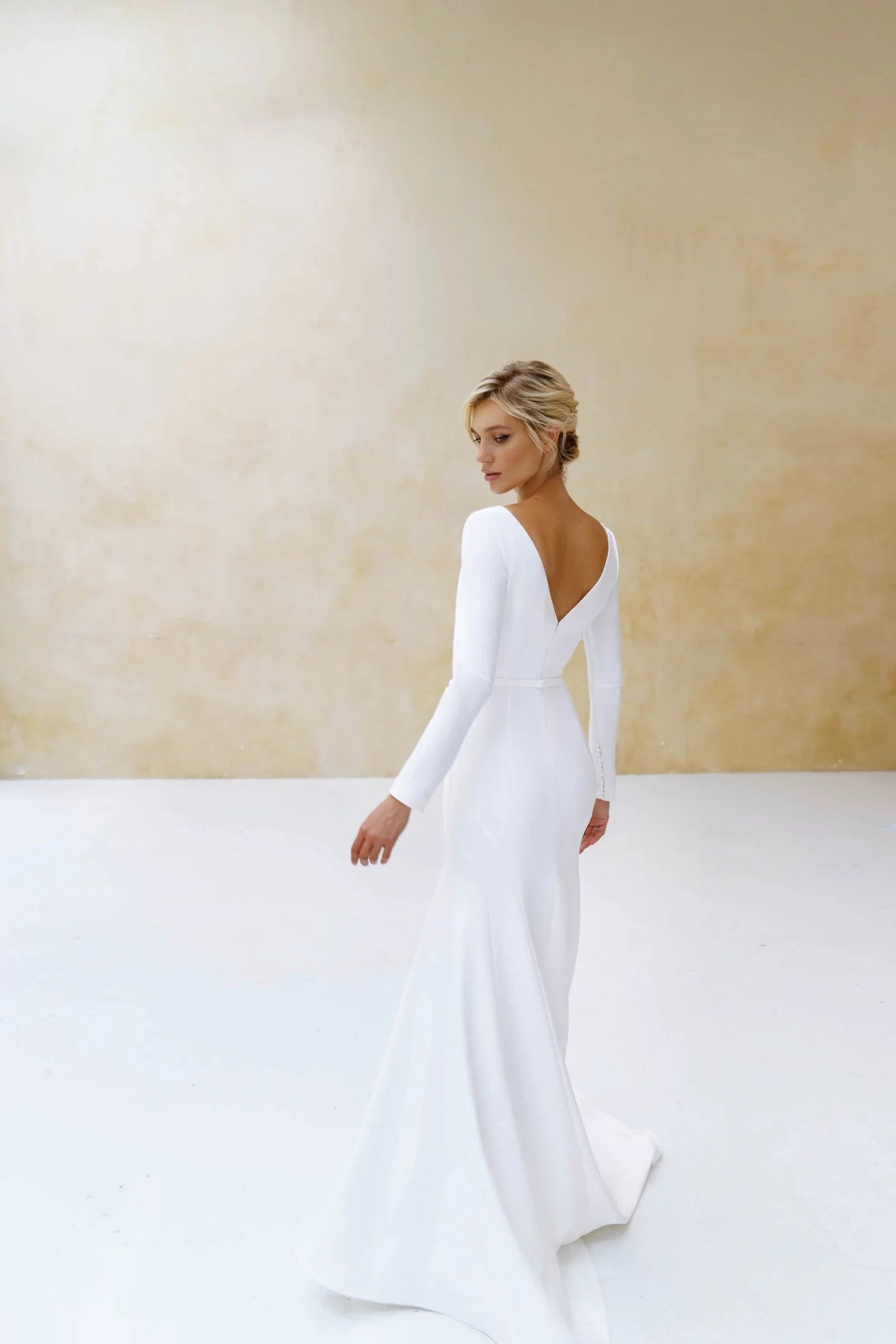 Minimalist Crepe Simple Long Sleeve Fitted Fit and Flare Wedding Dress Bridal Gown Open Back Boat Neckline Open V Back