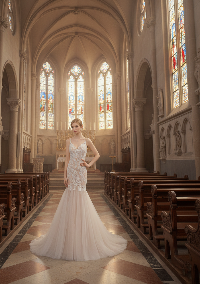 Romantic, modern, or glamorous brides seeking a figure-flattering mermaid gown that combines classic lace artistry with soft, ethereal tulle. Ideal for ballroom, garden, or destination weddings.