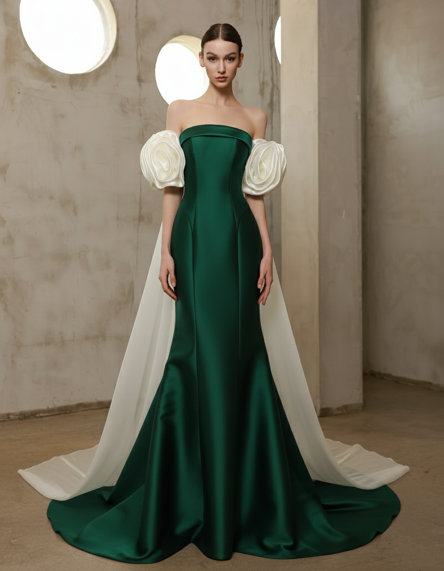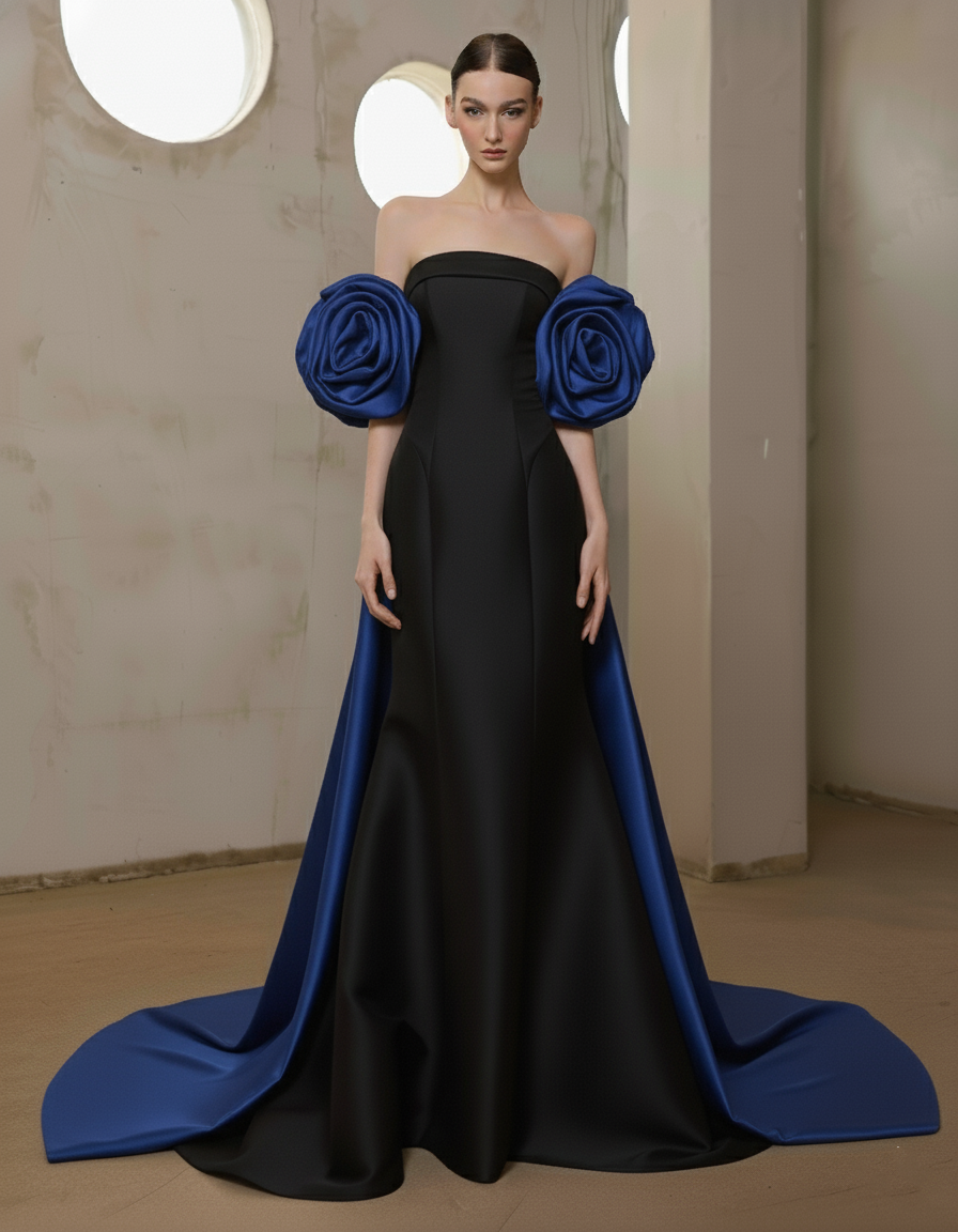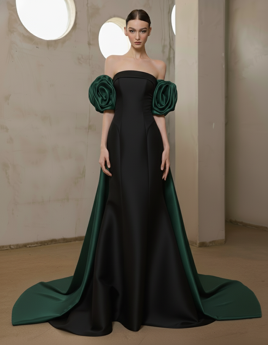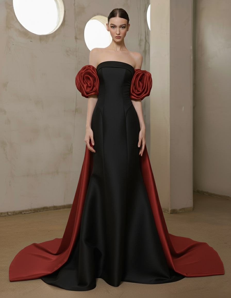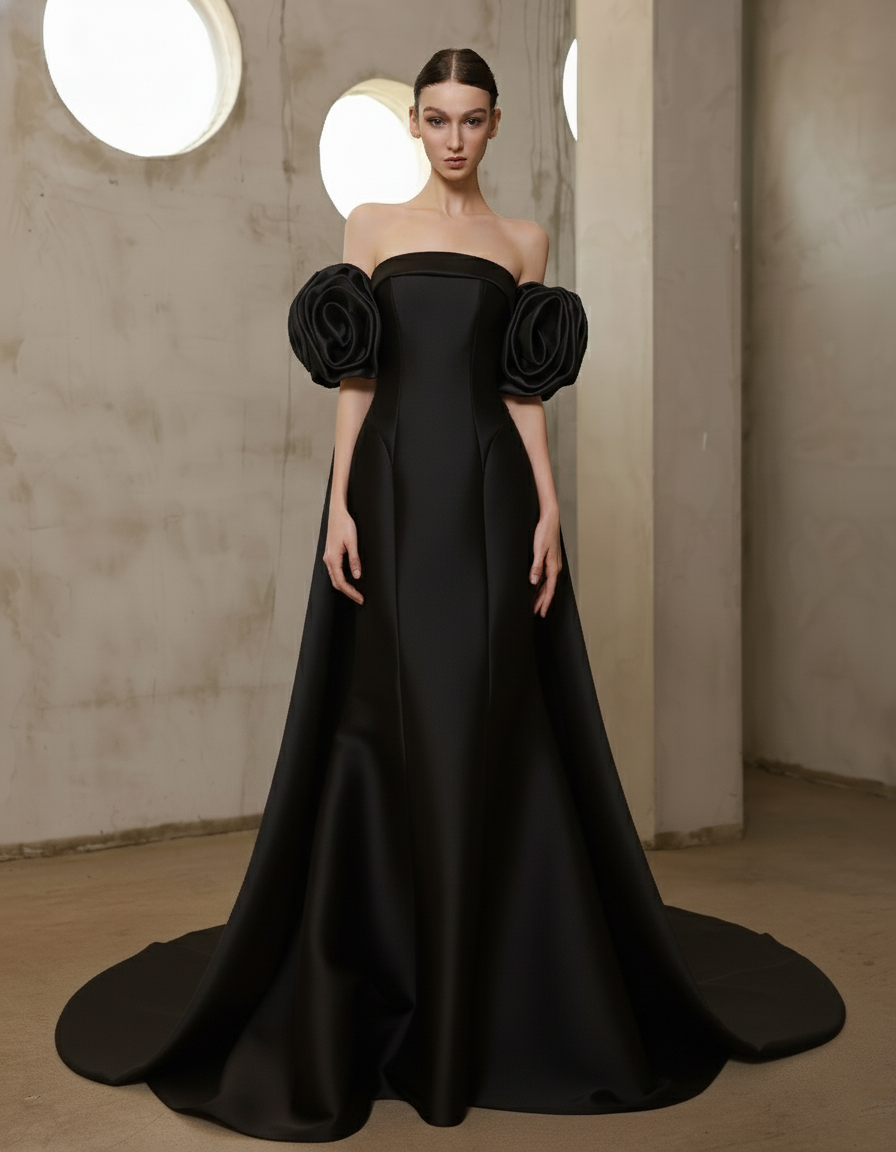 🌹 Off-the-shoulder rose-inspired bell sleeves
