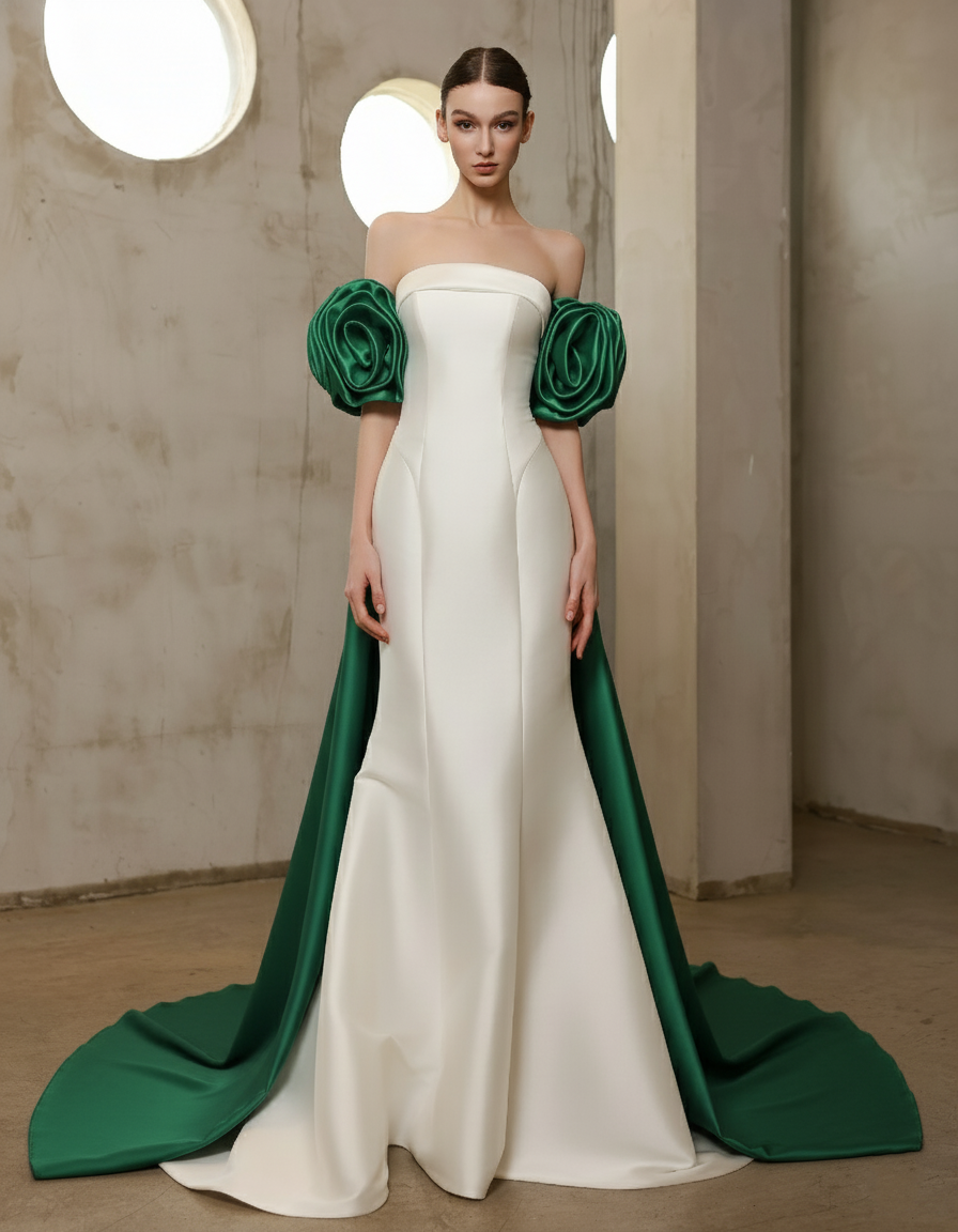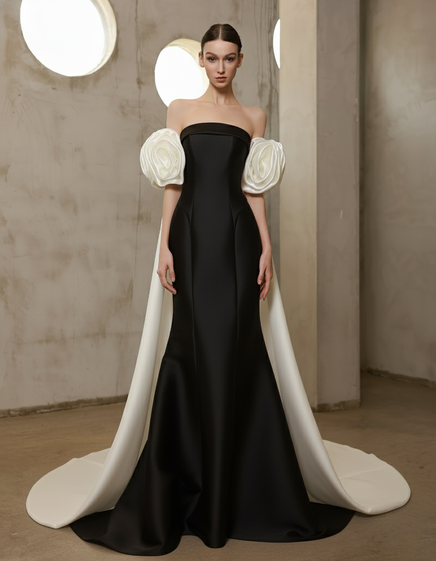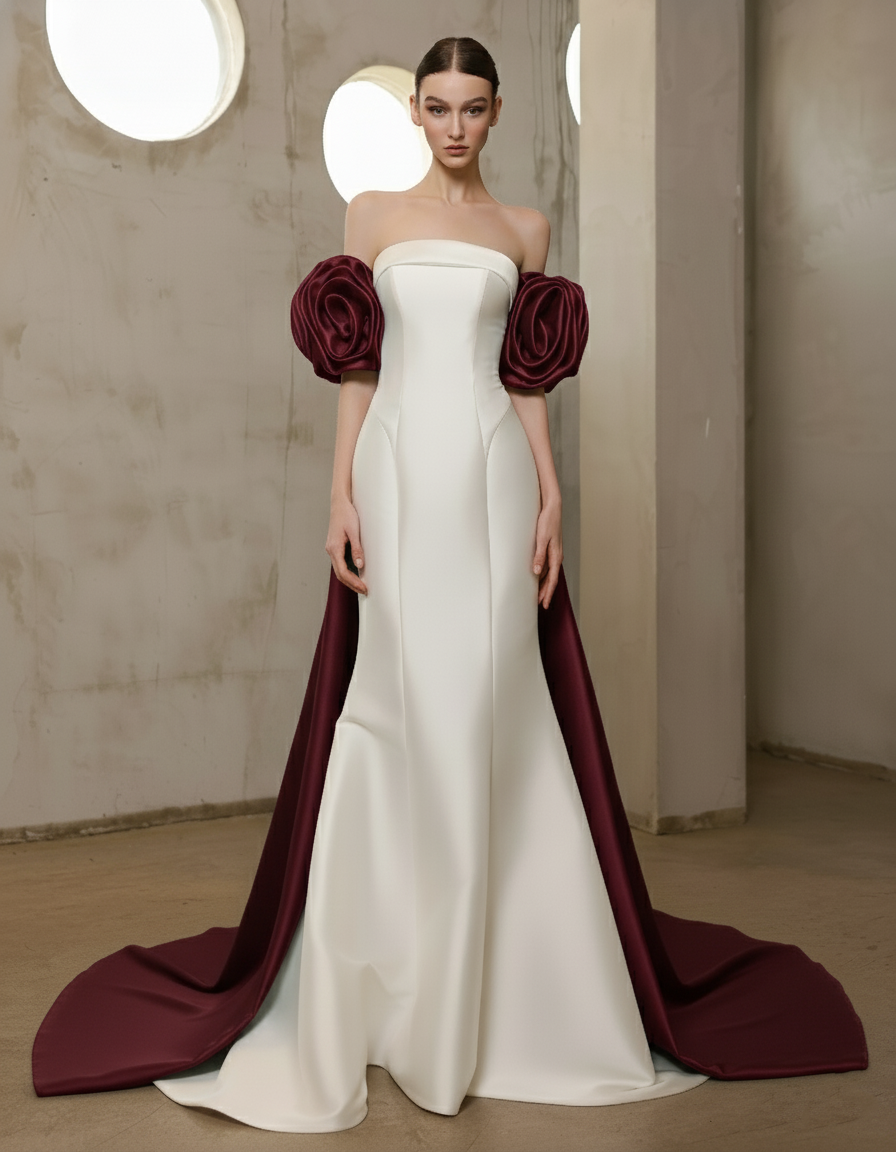 Make an unforgettable entrance in our Cadfael wedding gown – a breathtaking fusion of modern minimalism and couture artistry. Crafted from luxurious Mikado fabric, this structured A-line silhouette features sculptural off-the-shoulder bell sleeves shaped like blooming roses, adding a bold romantic touch. The clean lines of the bodice accentuate the waist, while the elegant cathedral train flows behind you for a dramatic walk down the aisle.