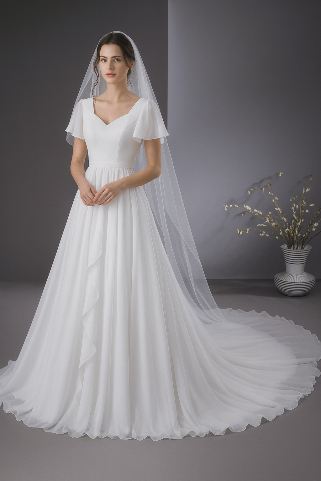 Calantha Wedding Dress by Adela Designs – Modest Chiffon A-Line Gown with Flutter Sleeve