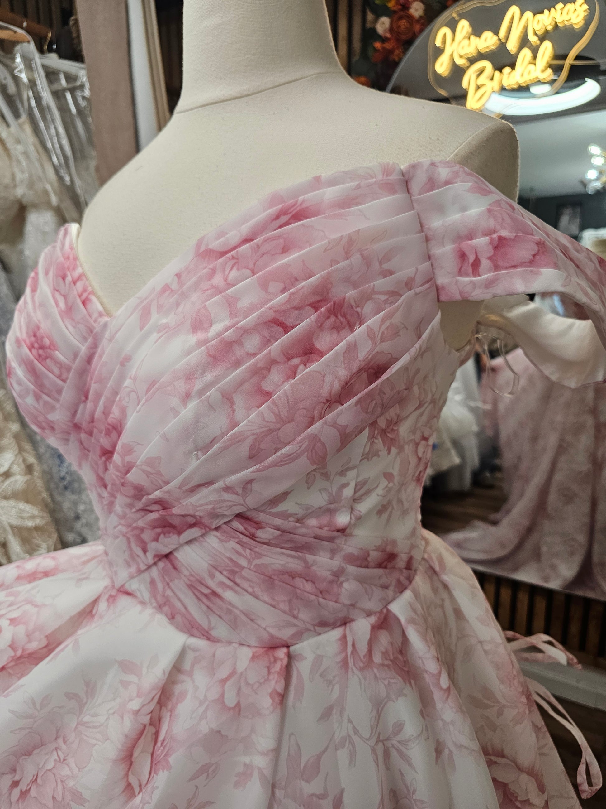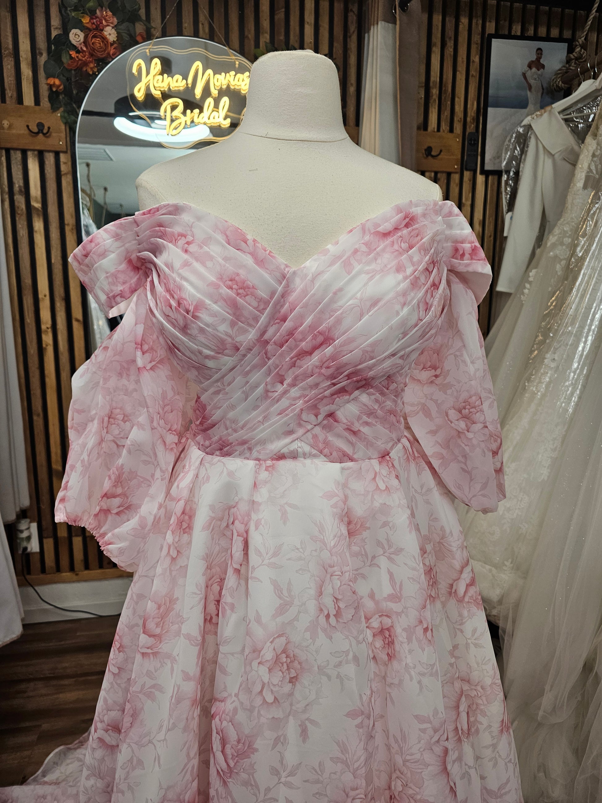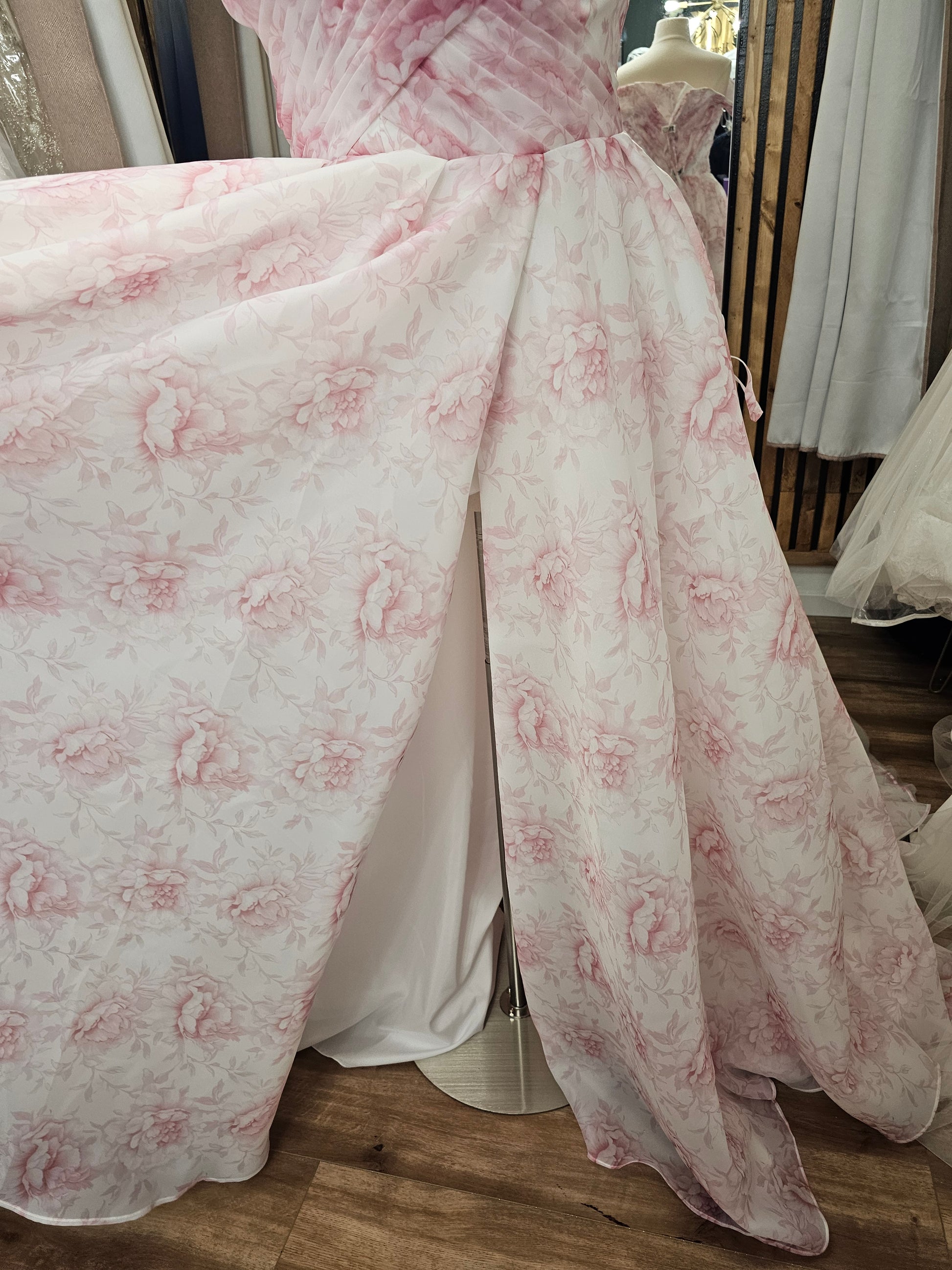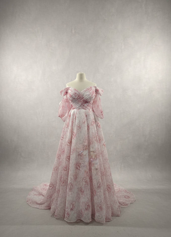 Featuring a pleated sweetheart bodice, detachable puff sleeves, and a full flowing A-line skirt, this gown blends classic structure with modern versatility. The floral organza overlay in blush-pink tones creates a luminous, airy finish that flatters every bride.