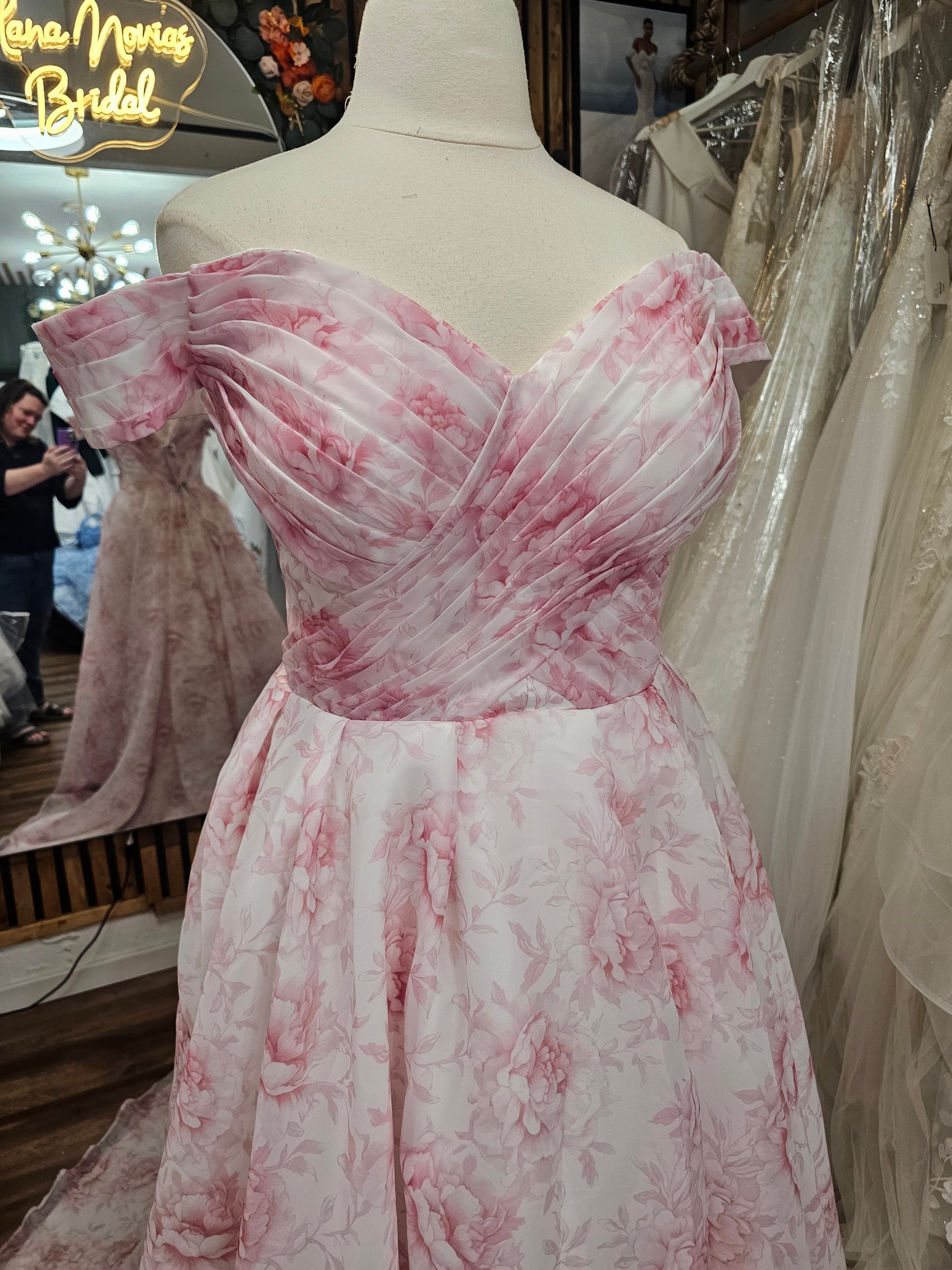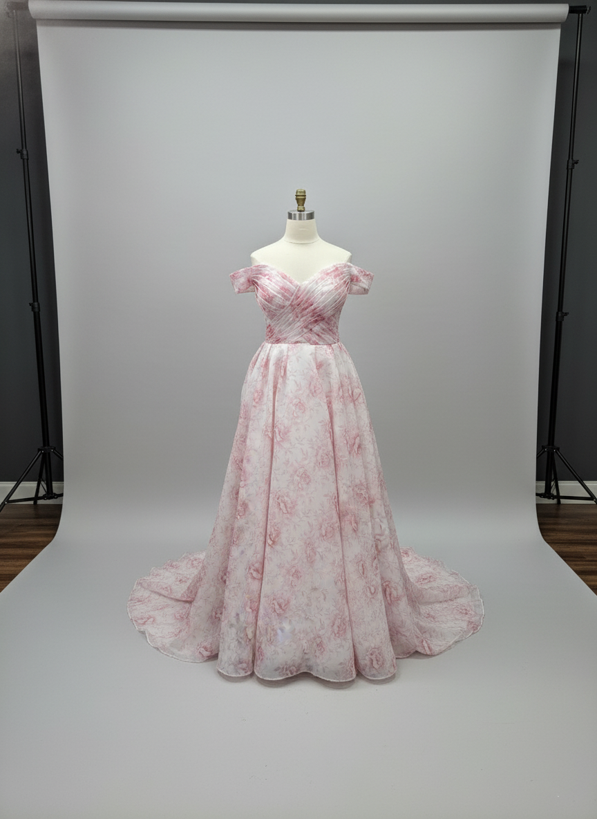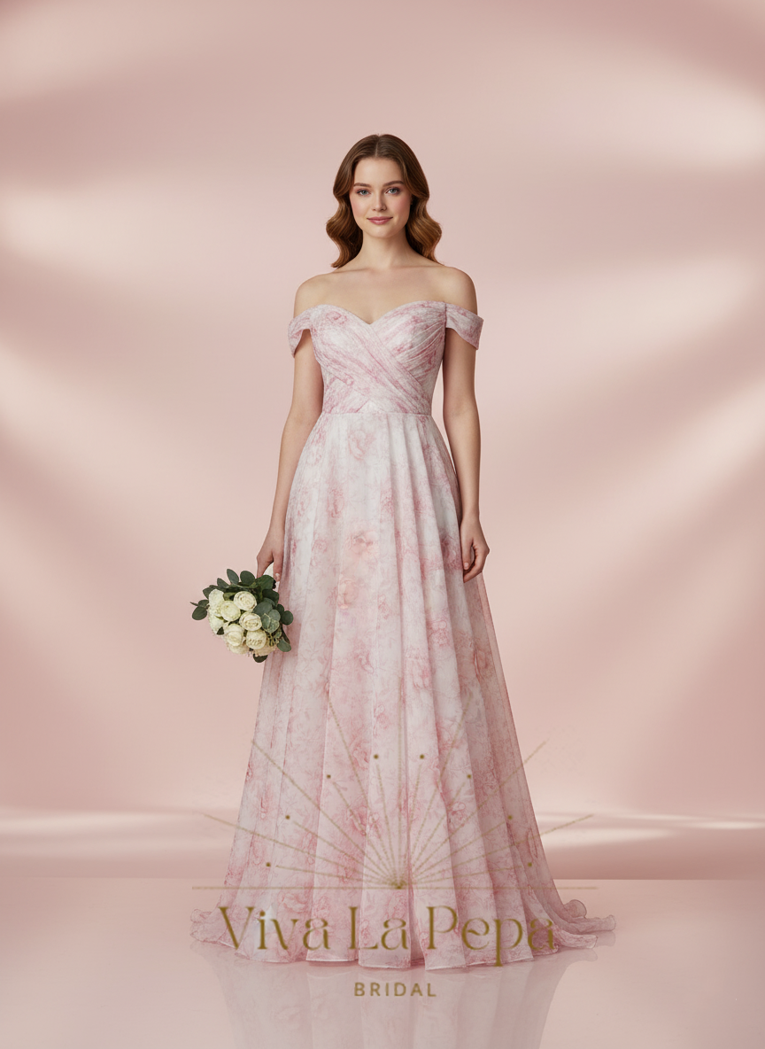 Camila — Romantic Pink Floral Off-Shoulder A-Line Gown by Viva La Pepa