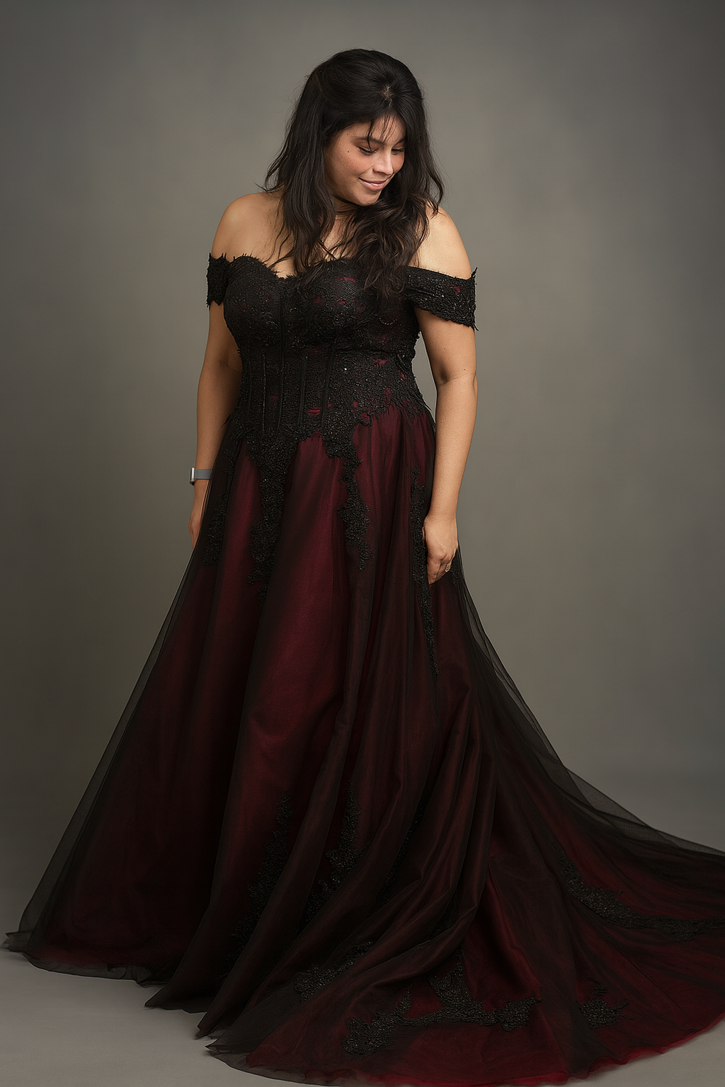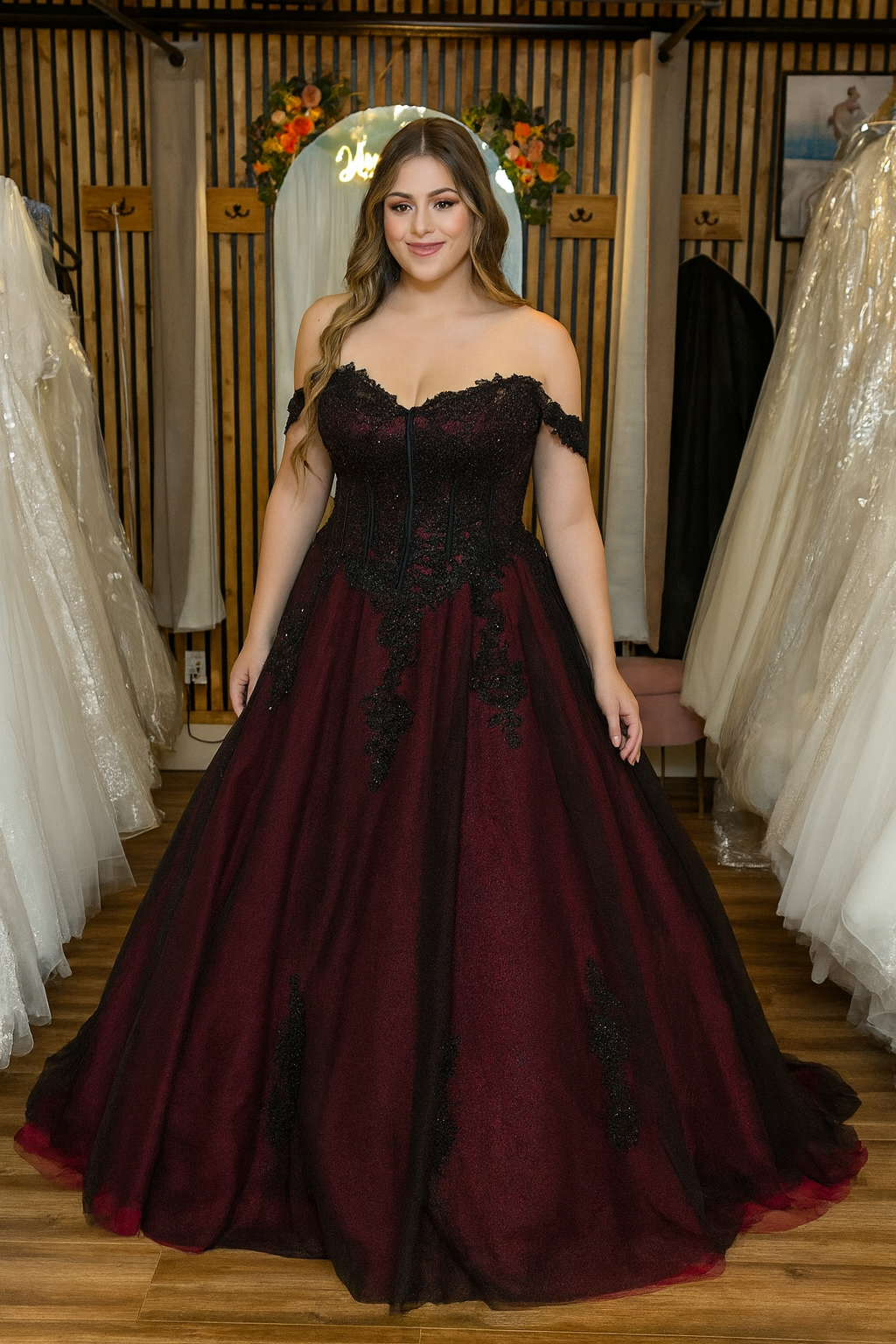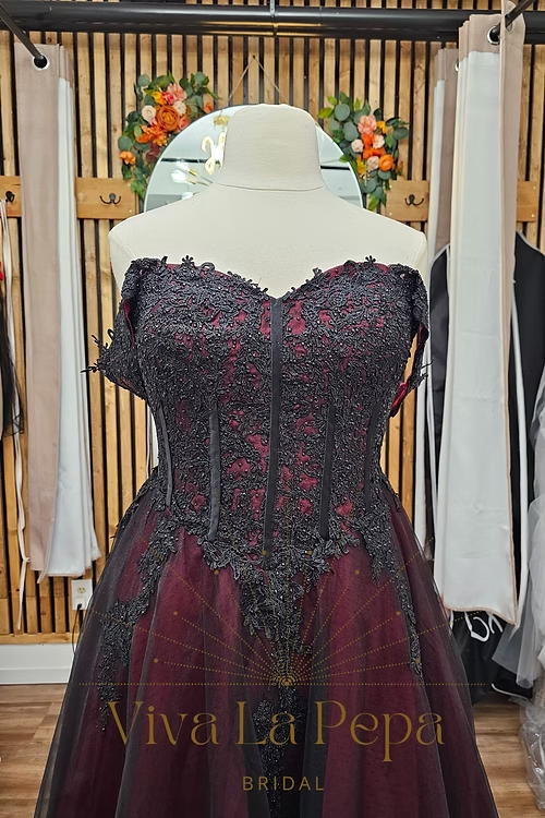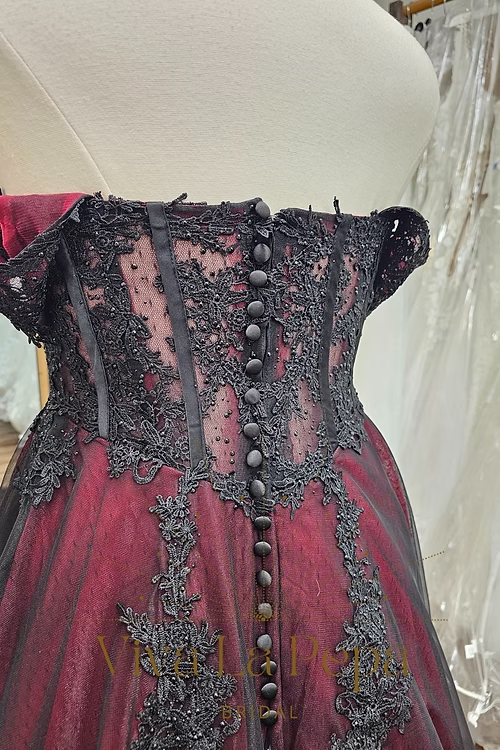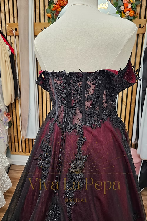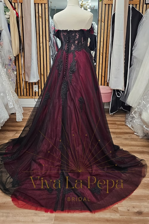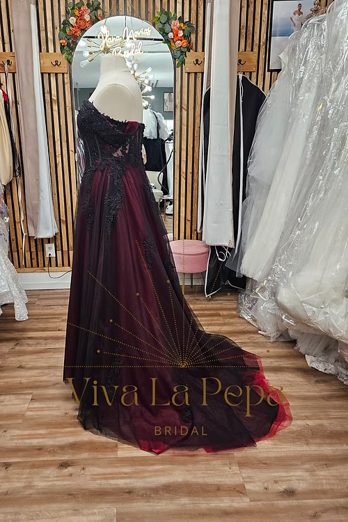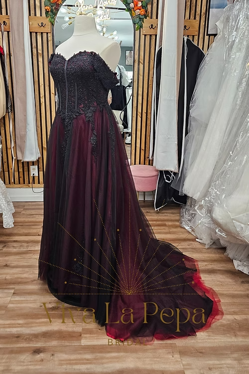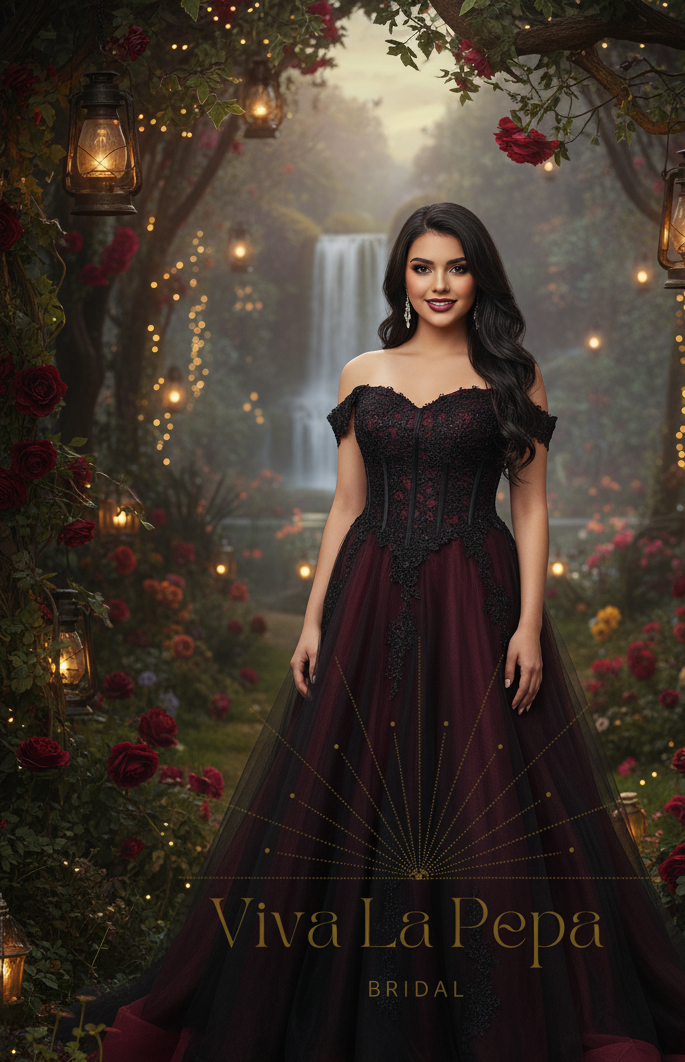 Dramatic. Elegant. Unforgettable. The Carmina gown from our Viva La Pepa collection is a breathtaking fusion of gothic romance and timeless bridal elegance. This off-the-shoulder A-line silhouette features a rich wine-red underlayer, veiled in black tulle, and adorned with cascading black lace appliqués for a moody, enchanting effect.