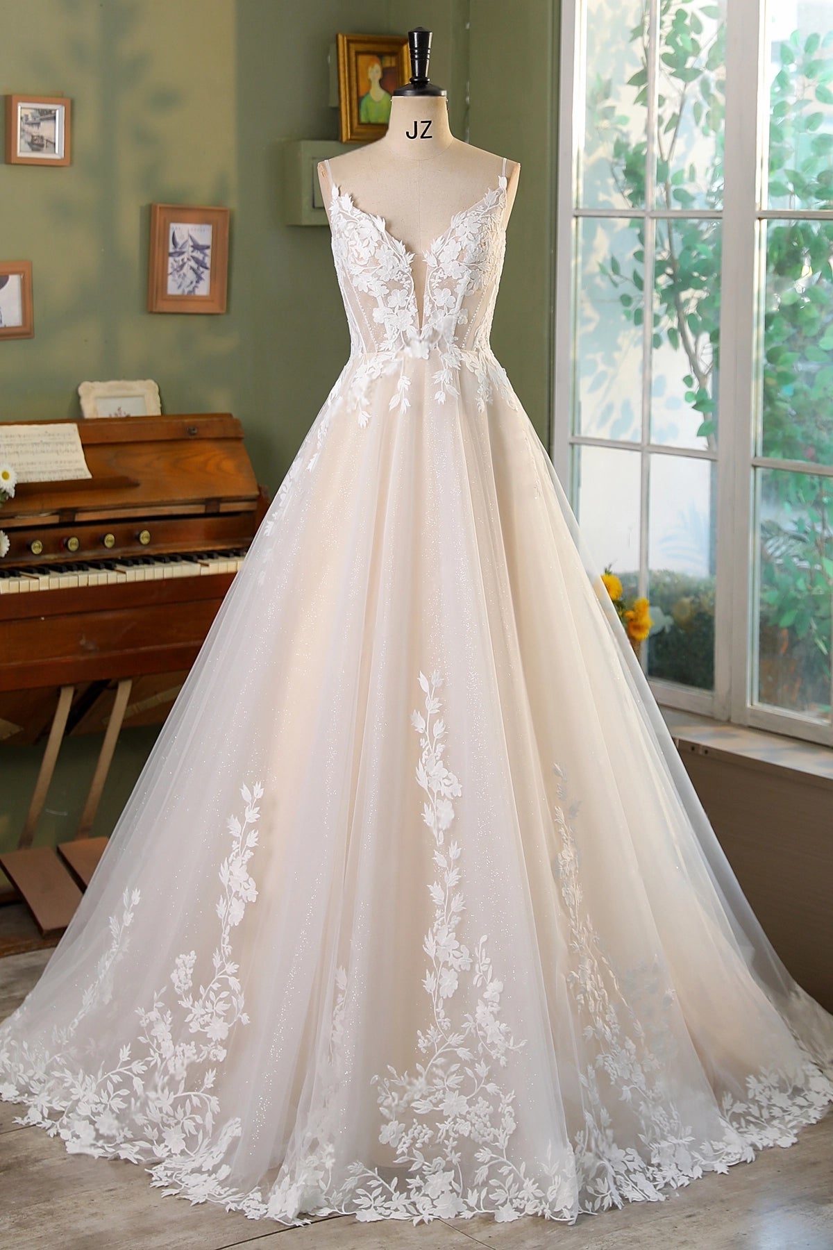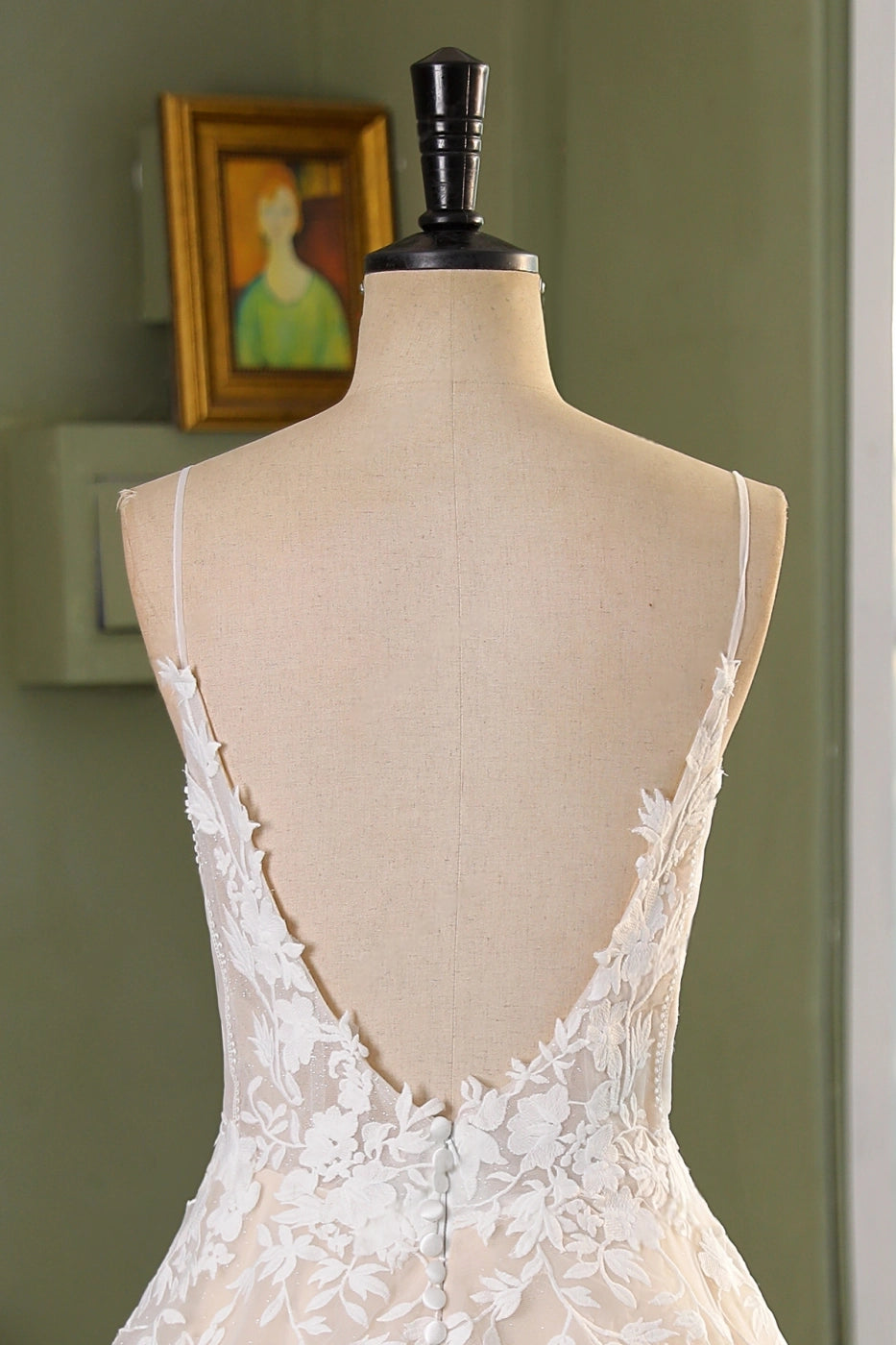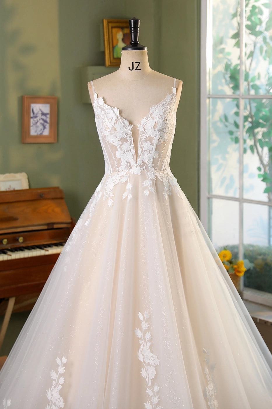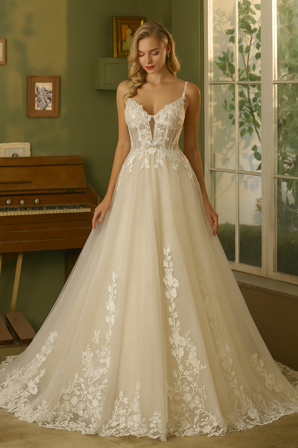 Celestia – Sparkling Tulle Wedding Dress with Floral Lace and Deep V Neck