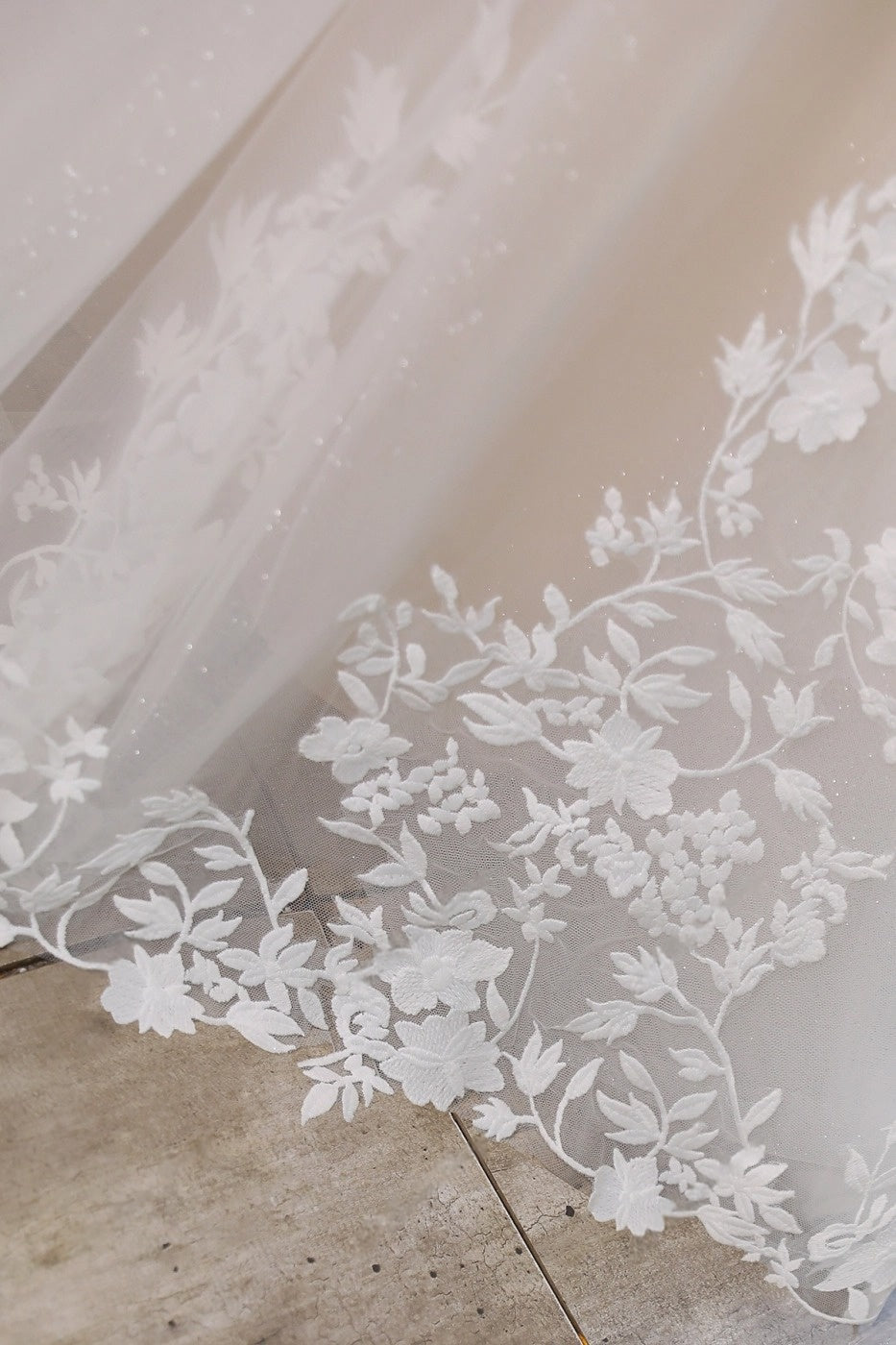 Celestia is where garden romance meets celestial charm. This dreamy wedding gown features a deep V neckline with illusion mesh support, delicate floral lace appliqués, and a soft A-line silhouette that flatters every figure. Subtle sparkle is woven throughout the tulle, catching the light with every movement and creating a radiant, starlit effect.