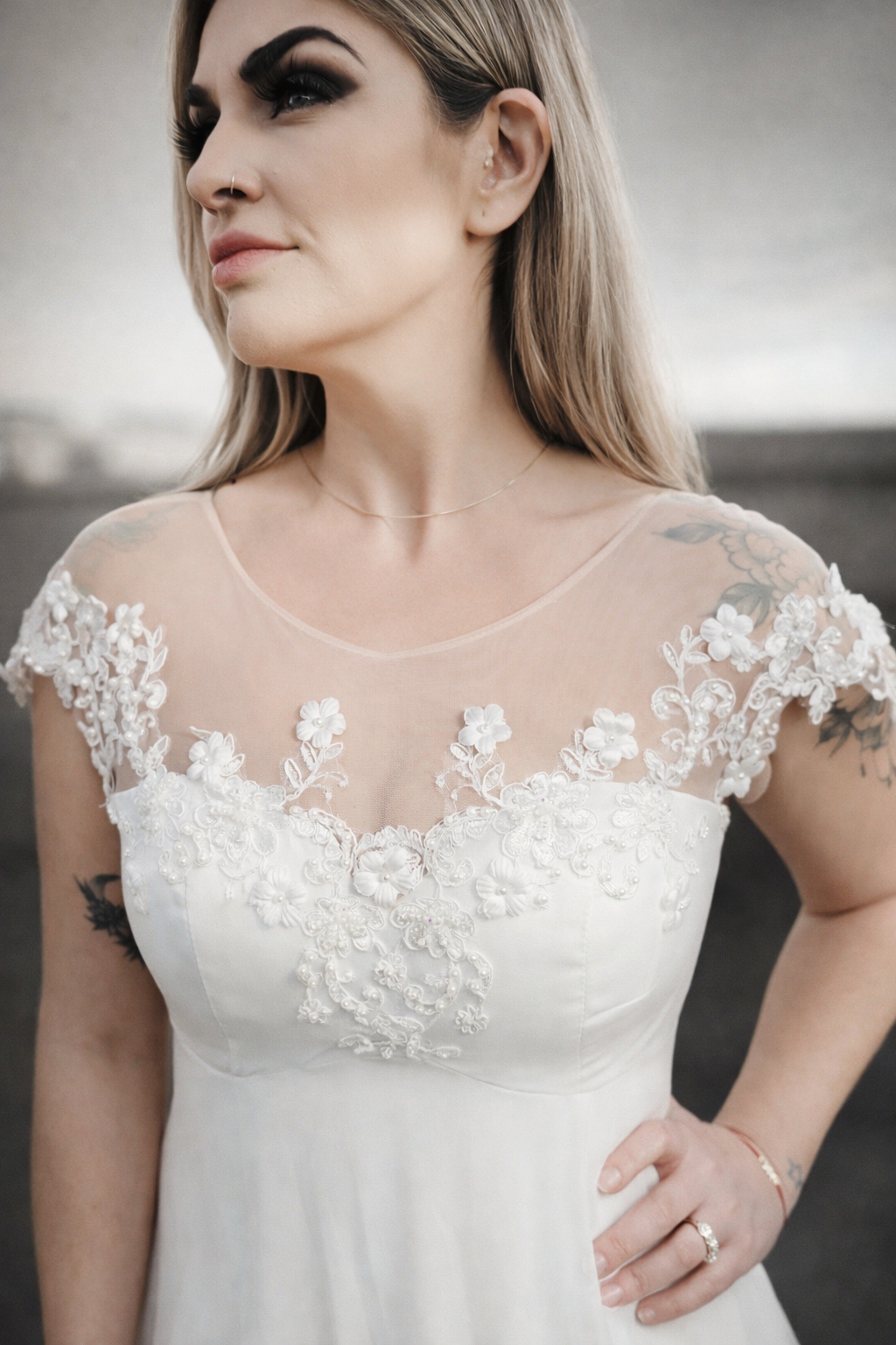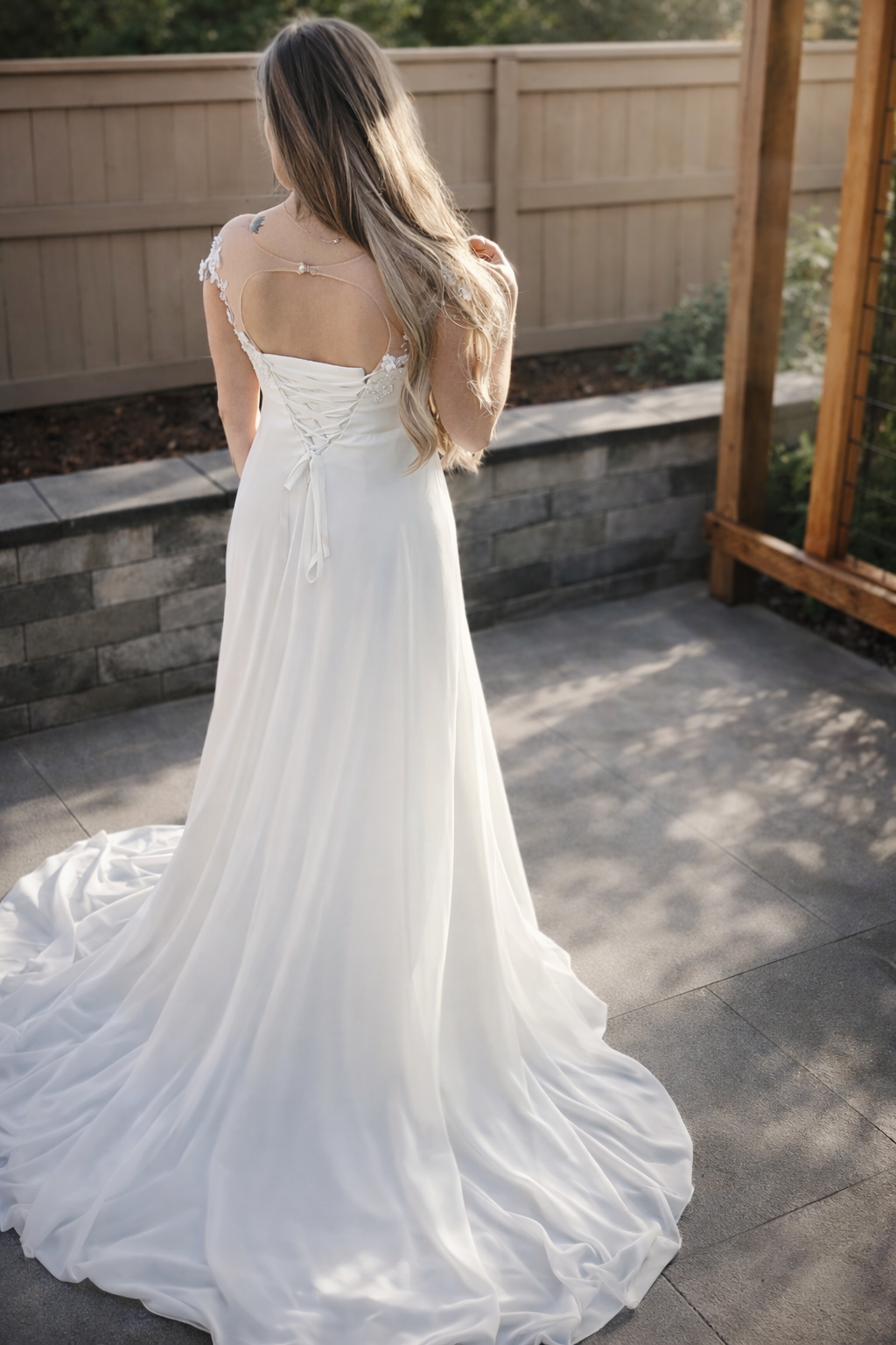The McKinley wedding dress is a breathtaking blend of bohemian charm and timeless elegance. Featuring an ethereal A-line silhouette, this gown is crafted with flowing chiffon that moves effortlessly with every step. The delicate floral lace appliqués on the bodice and illusion cap sleeves add a soft, romantic touch. Designed for free-spirited brides, McKinley is perfect for outdoor, rustic, or intimate weddings where natural beauty shines.