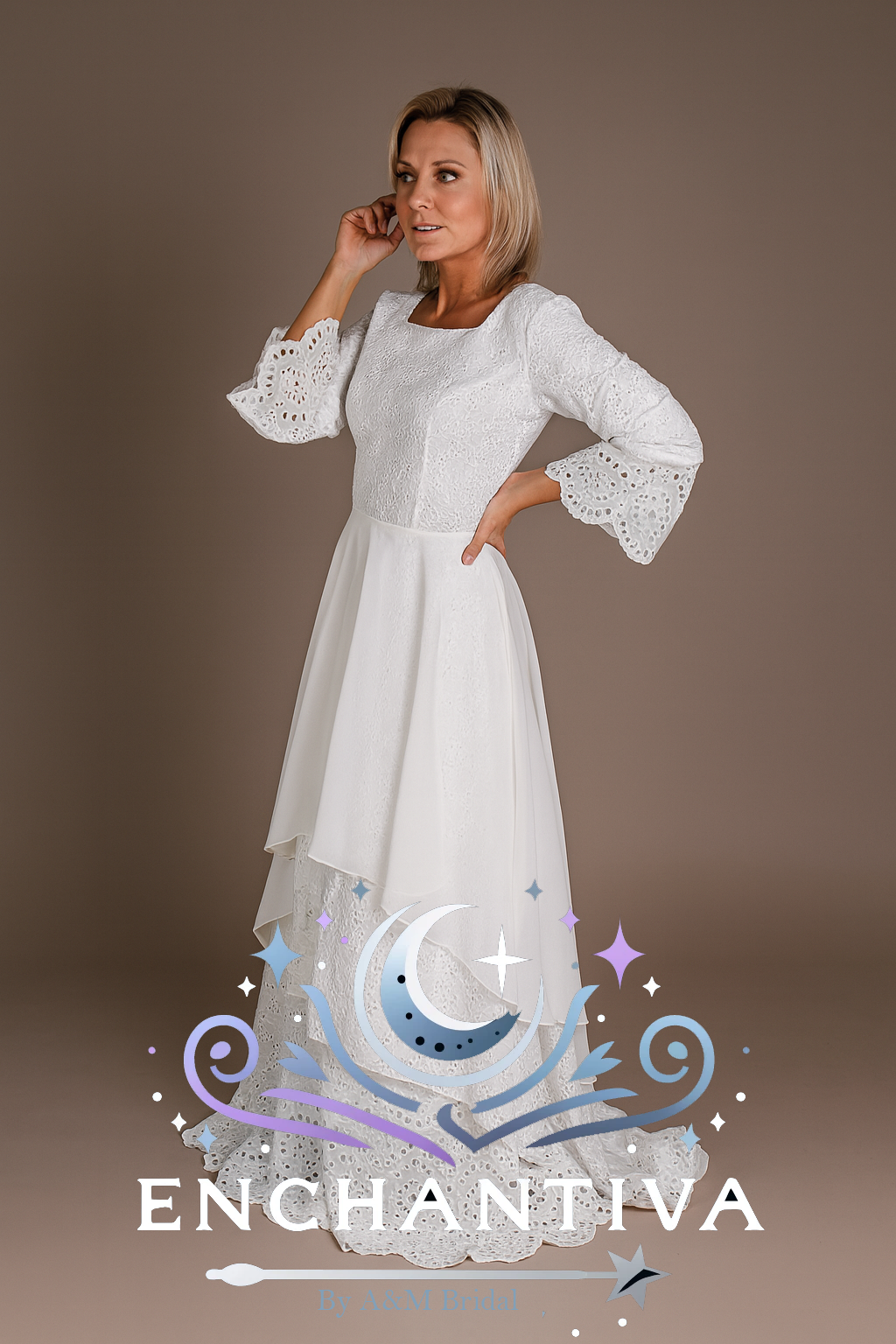 Embrace a perfect blend of elegance and nostalgia with the "Timeless Charm" wedding dress. Designed for the bride who treasures simplicity and sophistication, this gown features a stunning eyelet lace bodice with intricate patterns that add a touch of vintage allure. The high neckline and gracefully flared bell sleeves exude a romantic, bohemian vibe, while ensuring comfort and timeless elegance.