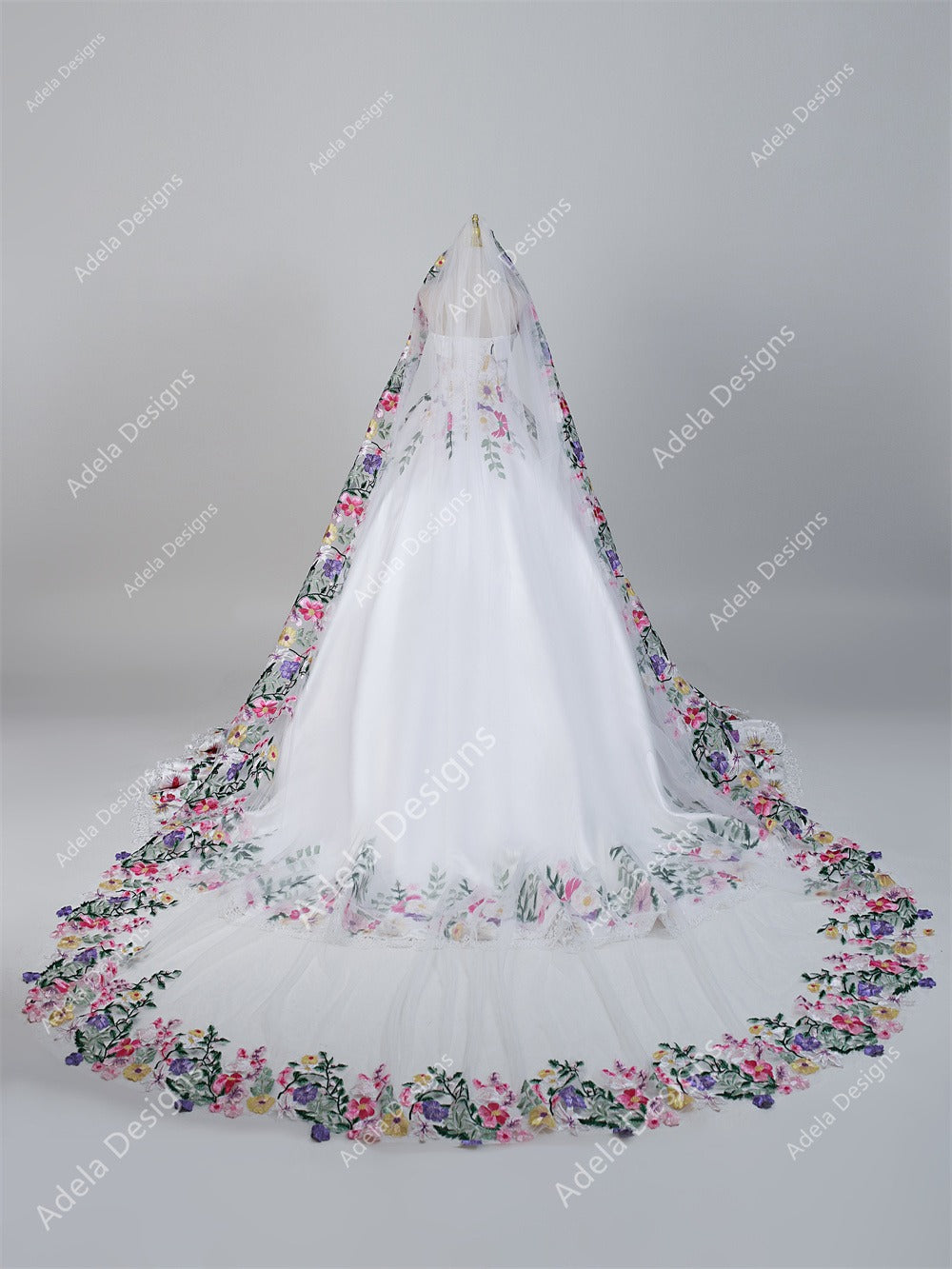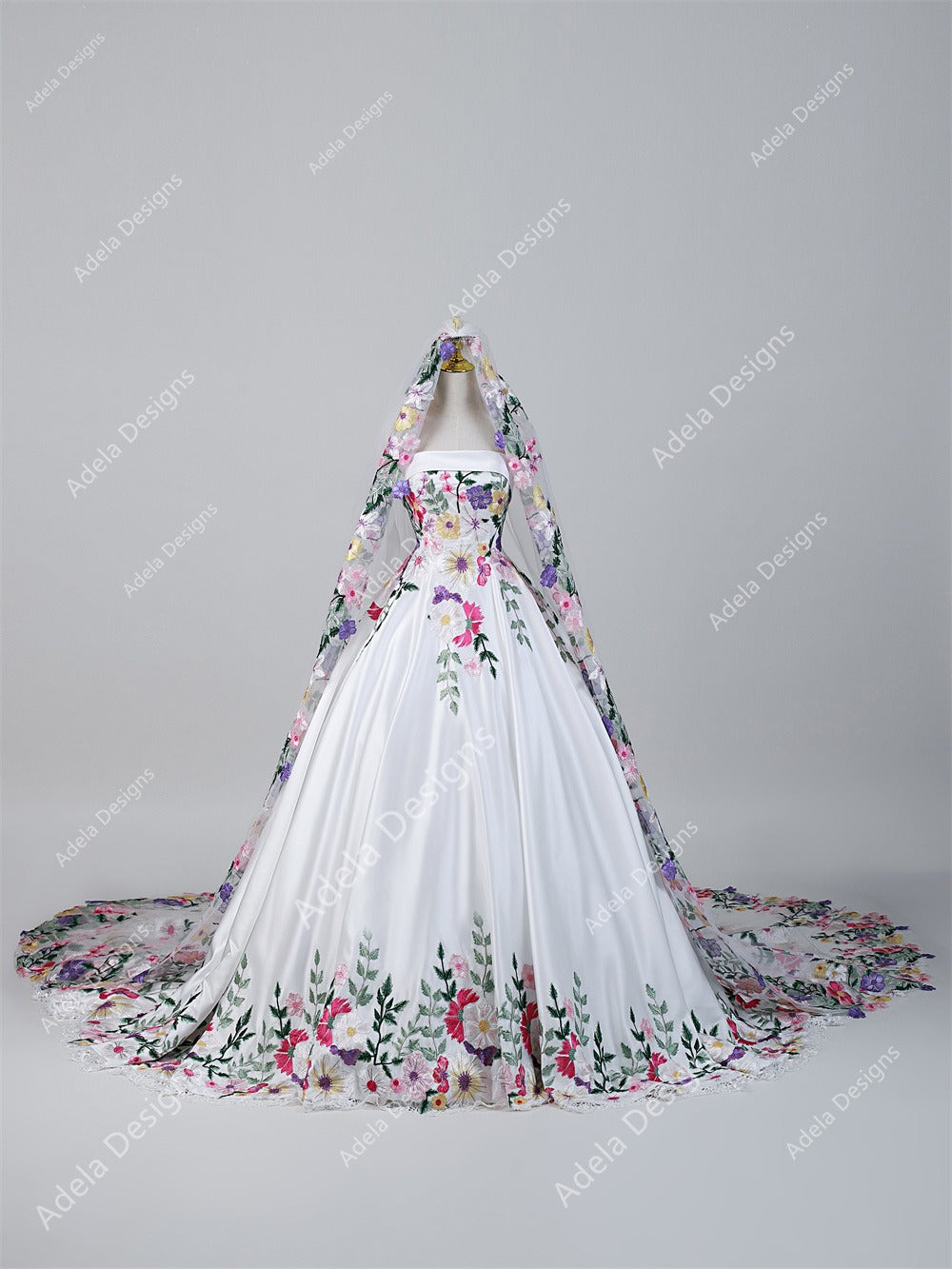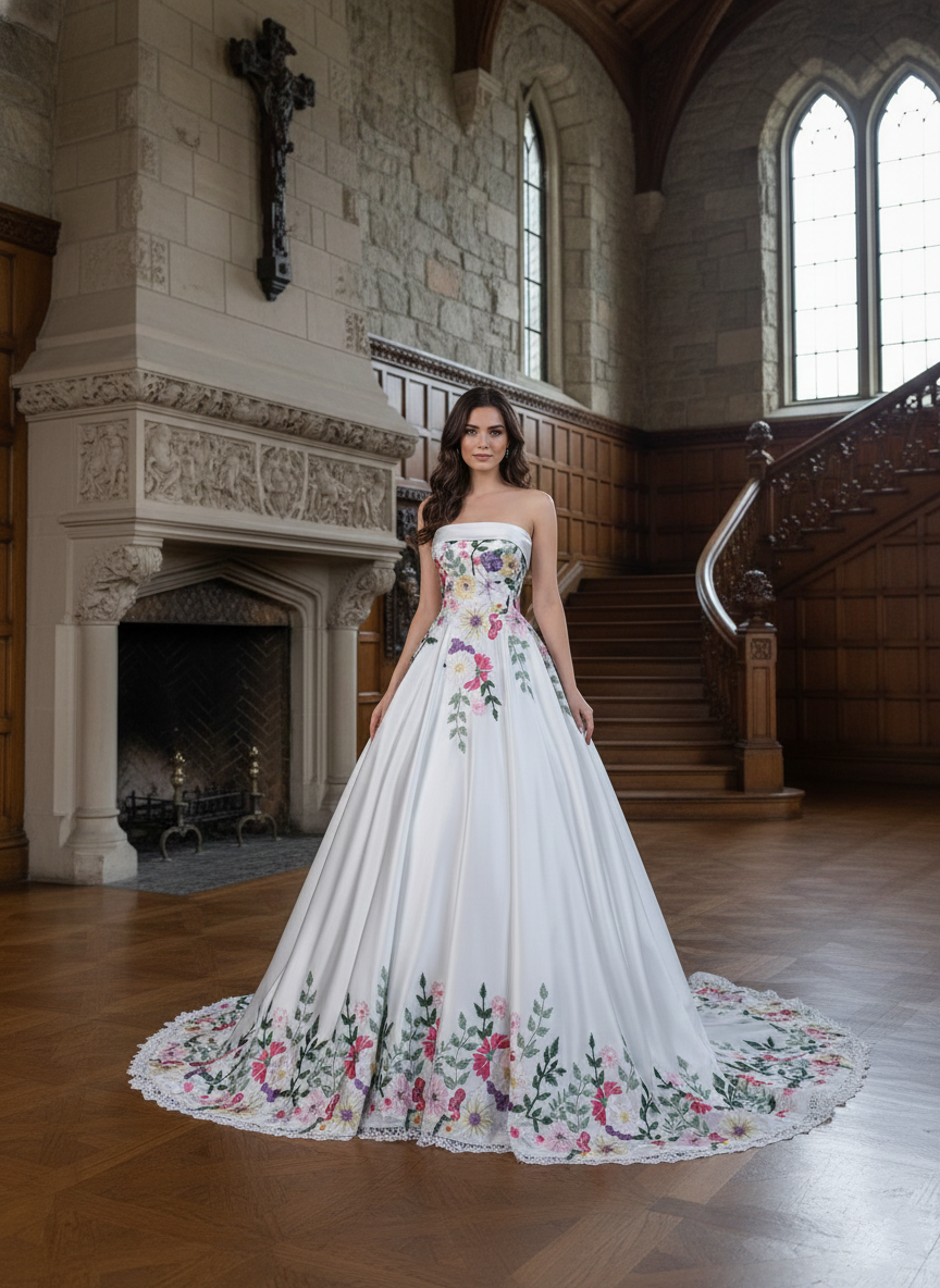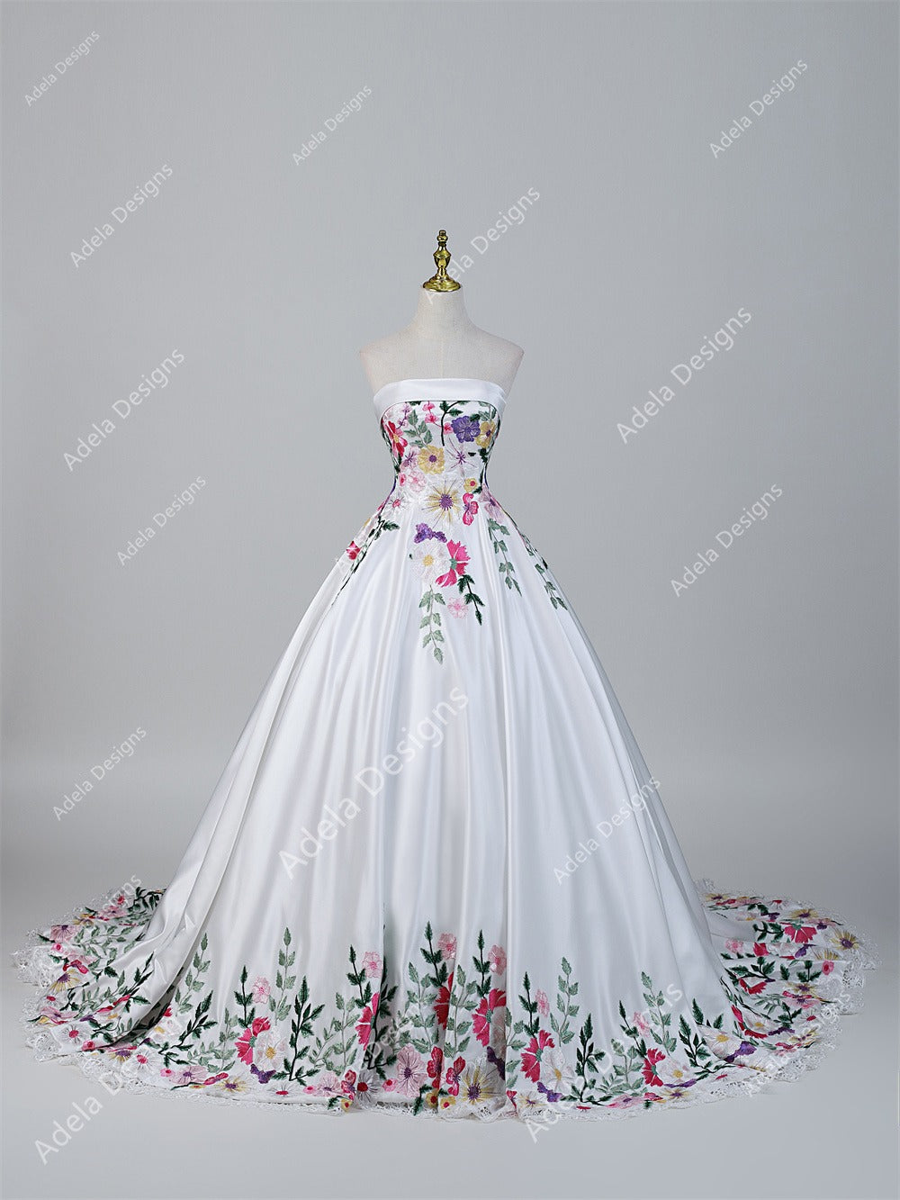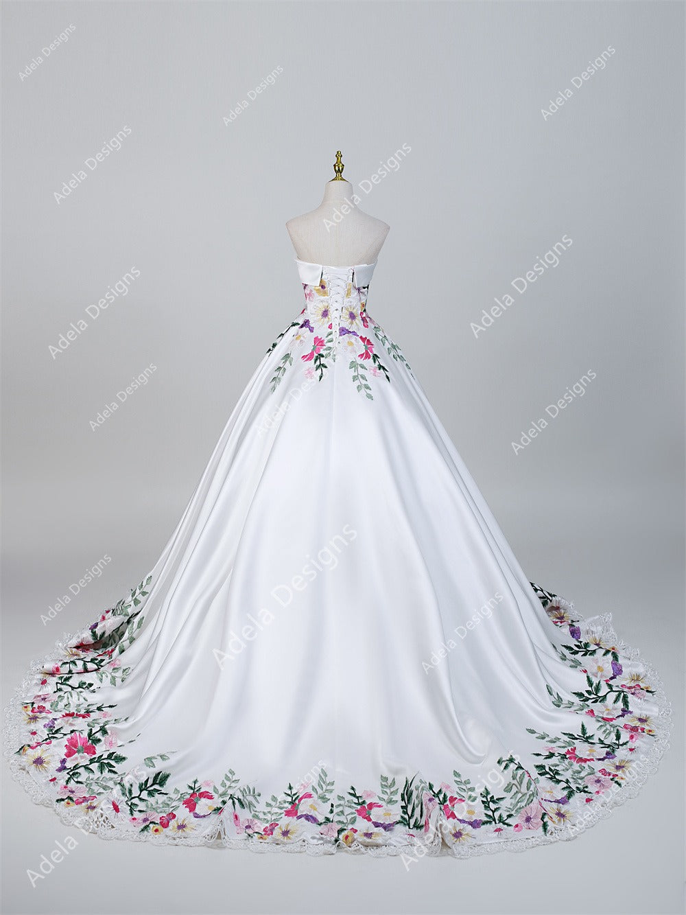 The strapless bodice and voluminous skirt are accented with intricate floral lace embroidery, featuring subtle pops of color that add warmth, dimension, and personality. Lace detailing continues along the skirt hem, creating a cohesive and timeless design from every angle.