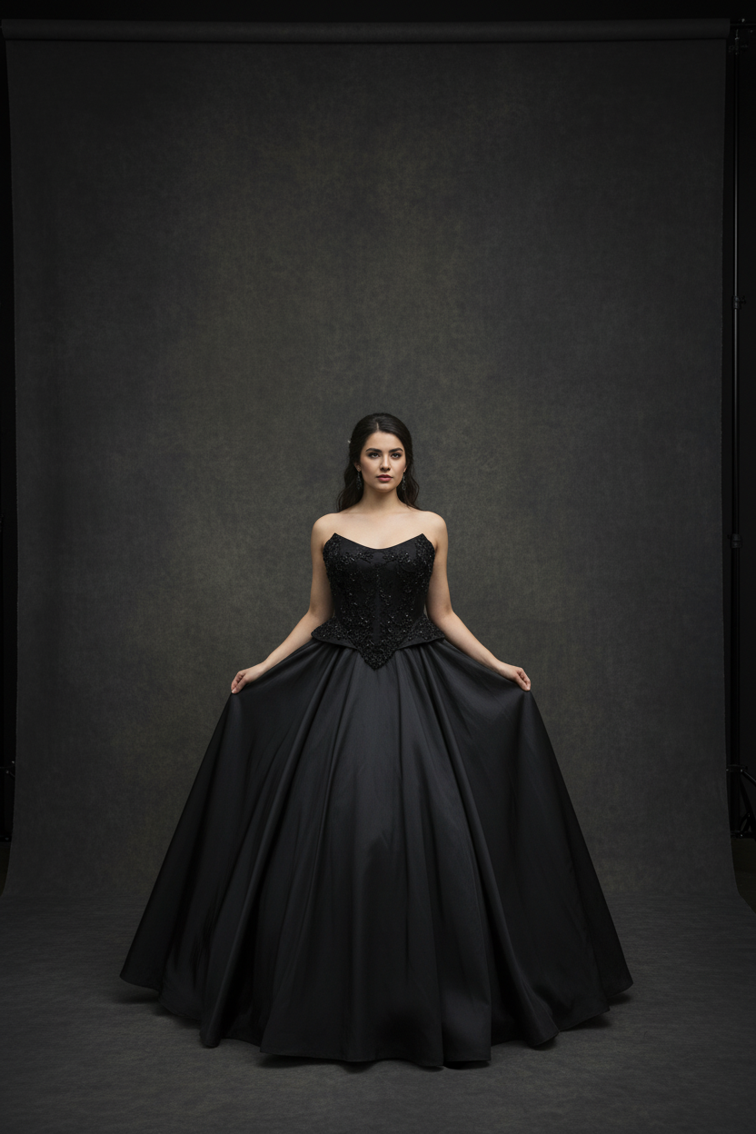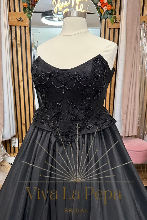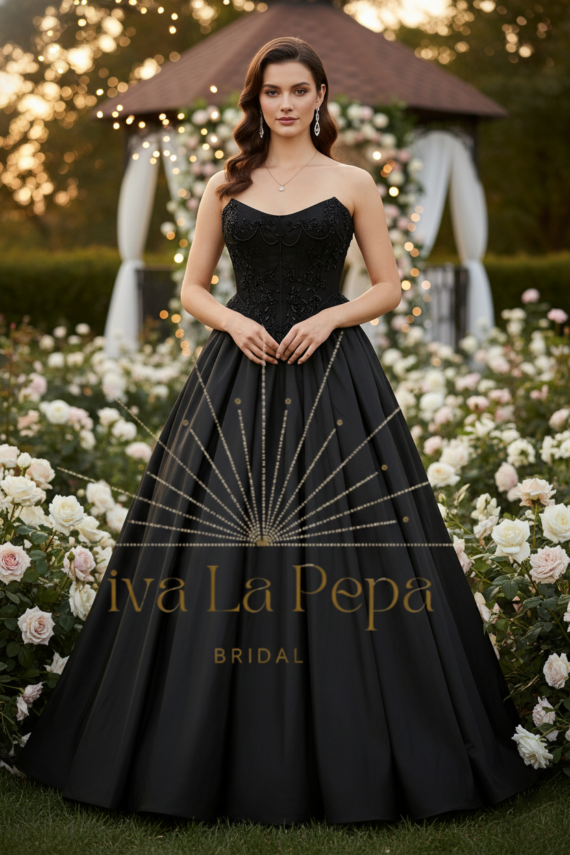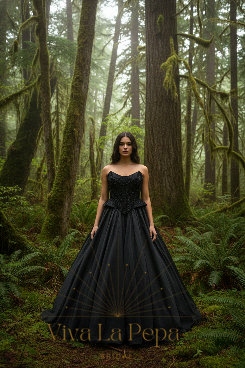 Step into the spotlight in Crown of the Night, a couture black wedding gown designed exclusively by Viva la Pepa and available only at Hana Novias Bridal. This masterpiece blends regal structure and dramatic movement—crafted for the bride who reigns in mystery, elegance, and unapologetic individuality.