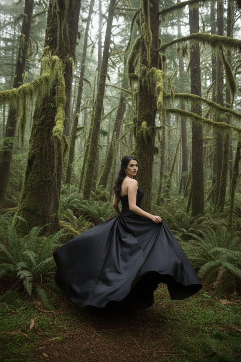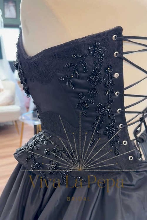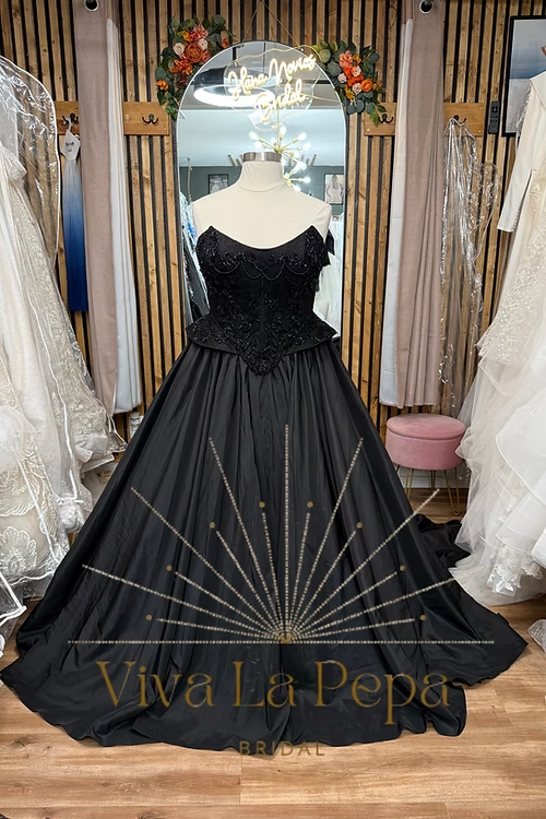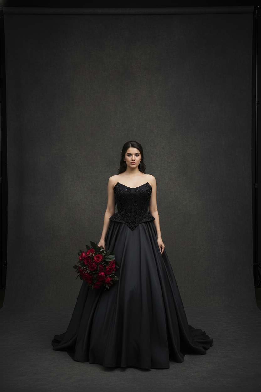 Step into the spotlight in Crown of the Night, a couture black wedding gown designed exclusively by Viva la Pepa and available only at Hana Novias Bridal. This masterpiece blends regal structure and dramatic movement—crafted for the bride who reigns in mystery, elegance, and unapologetic individuality.