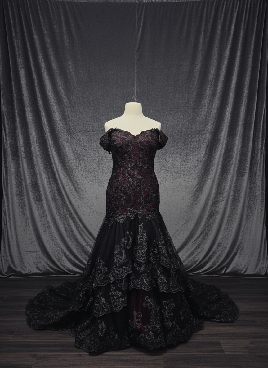 Dallice - Gothic-Inspired Black and Red Lace Wedding Dress