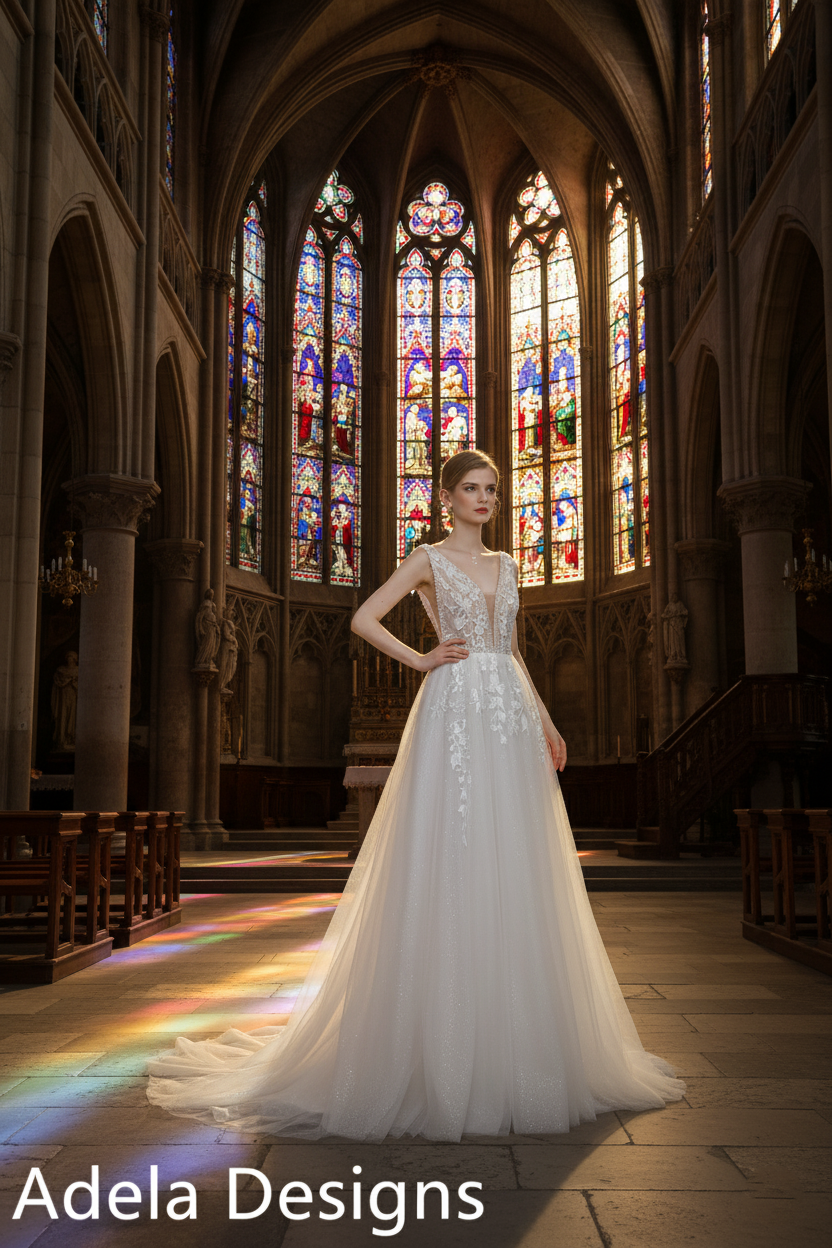 The Damaris gown by Adela Designs captures the essence of ethereal beauty with its dreamy blend of boho romance and modern sparkle. Designed for the free-spirited bride, this A-line silhouette flows effortlessly with a light glitter tulle skirt that shimmers gracefully in motion.