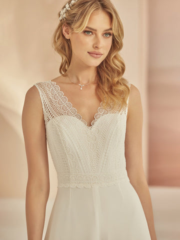 Step into timeless elegance with the Danube Bridal Jumpsuit by Bianco Evento. Crafted from high-quality lace and satin crepe, this modern alternative to the classic wedding gown offers effortless sophistication. The V-neckline, sleeveless lace bodice, and open scalloped back create a romantic silhouette, while the flowing palazzo-cut pants bring comfort and movement. Perfect for civil ceremonies, destination weddings, or minimalist brides seeking a chic, contemporary look.