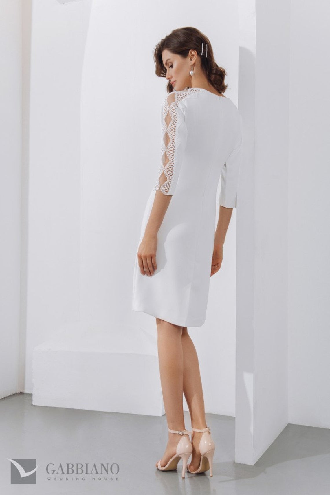 Short Knee Length Pencil Skirt Style Straight Crepe Wedding Dress Bridal Gown Reception 3/4 Sleeves with Lace Modest Minimalist