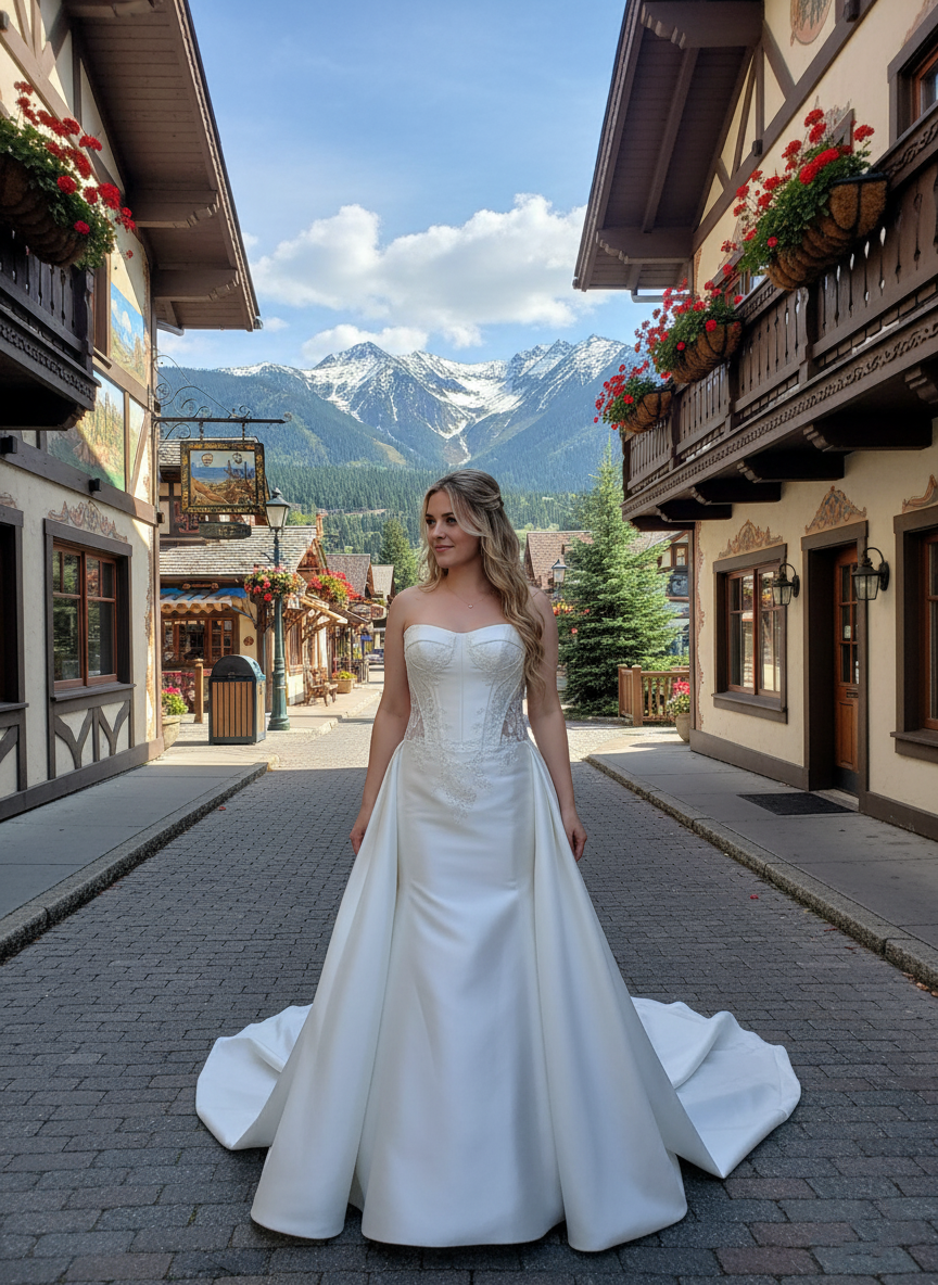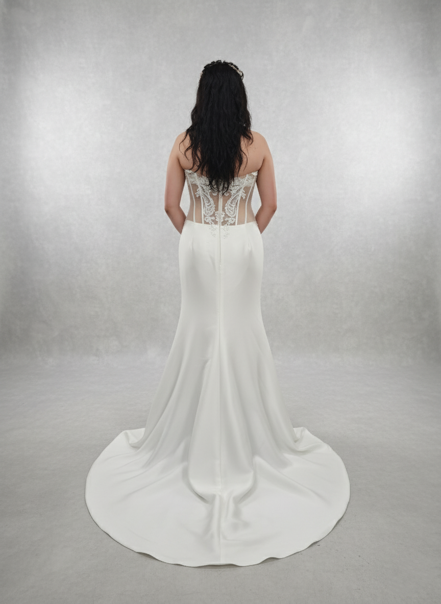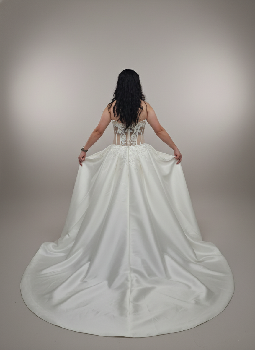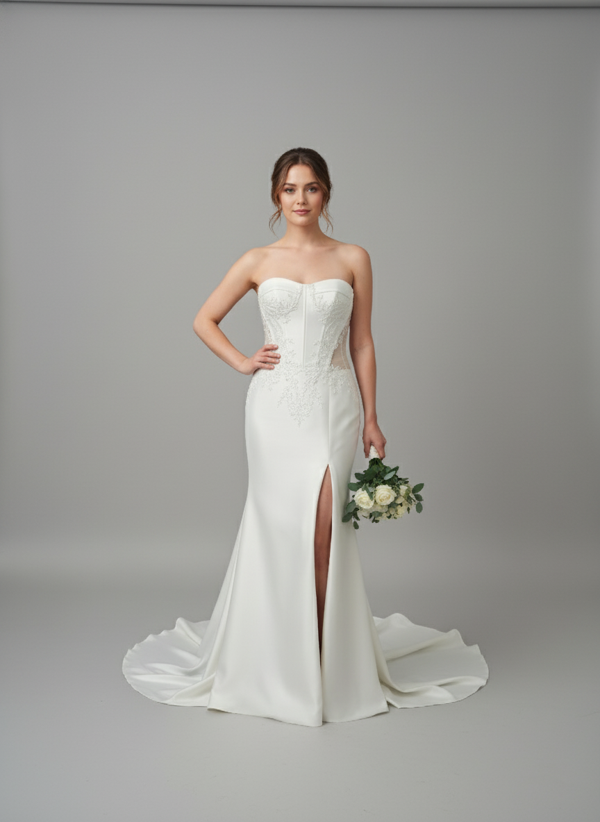 Berthe – Satin Corset Wedding Gown with Detachable Cathedral Train & Front Slit | Modern Bridal Dress