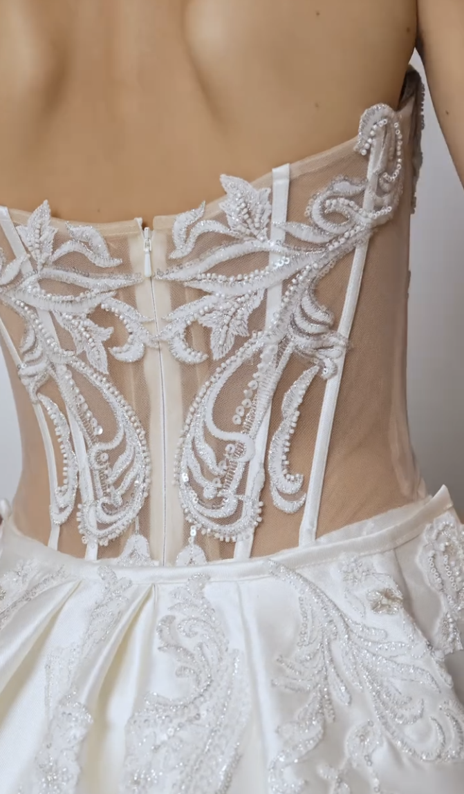 Meet Berthe — a modern meets romantic wedding gown designed for the bride who wants two looks in one. This stunning satin bridal dress features a structured corset bodice with exposed boning, floral lace appliqués, and a sleek fitted skirt with a dramatic thigh-high slit. The detachable cathedral-length train transforms the dress from a clean, minimalist silhouette into a jaw-dropping, aisle-ready moment.
